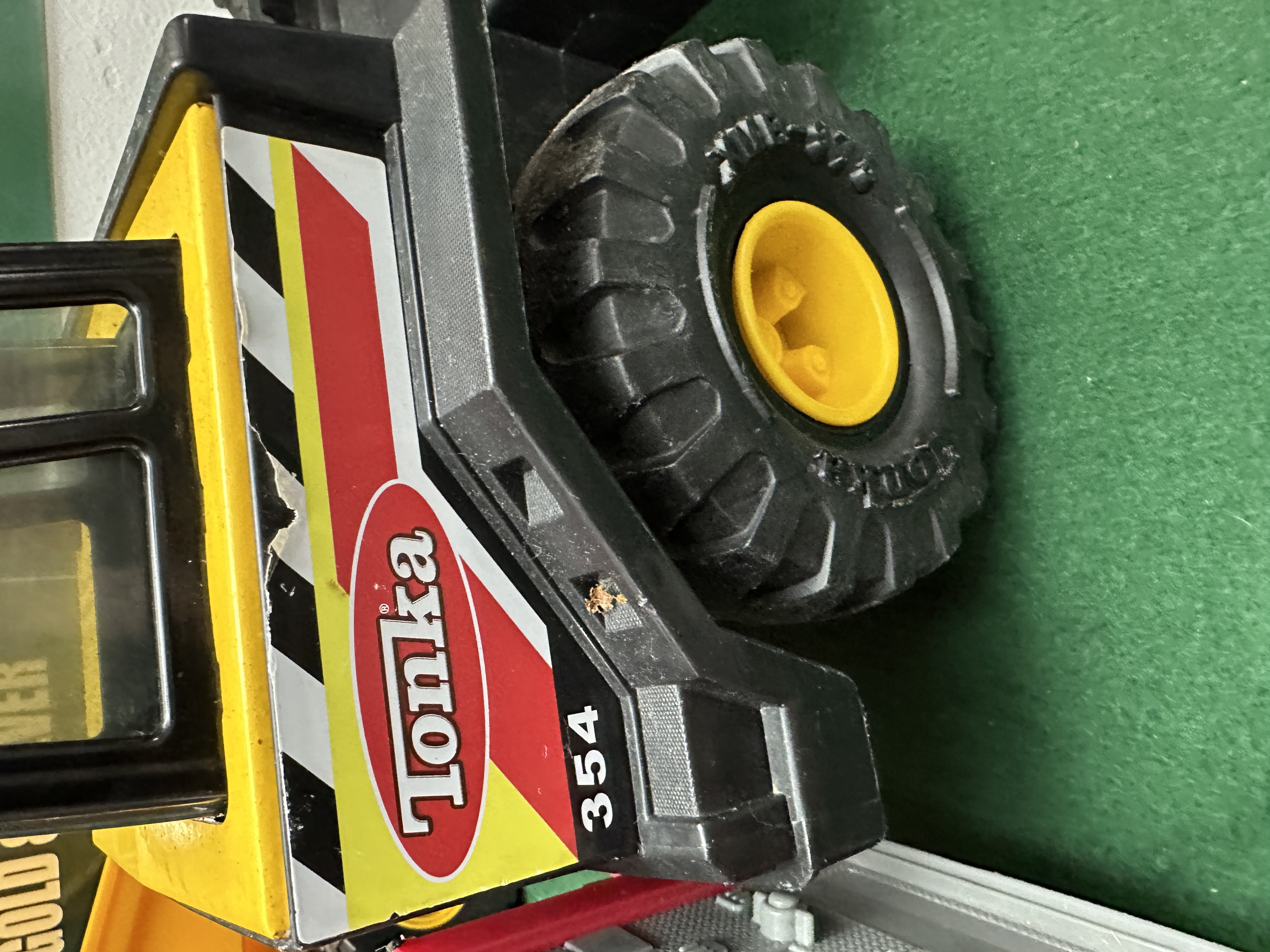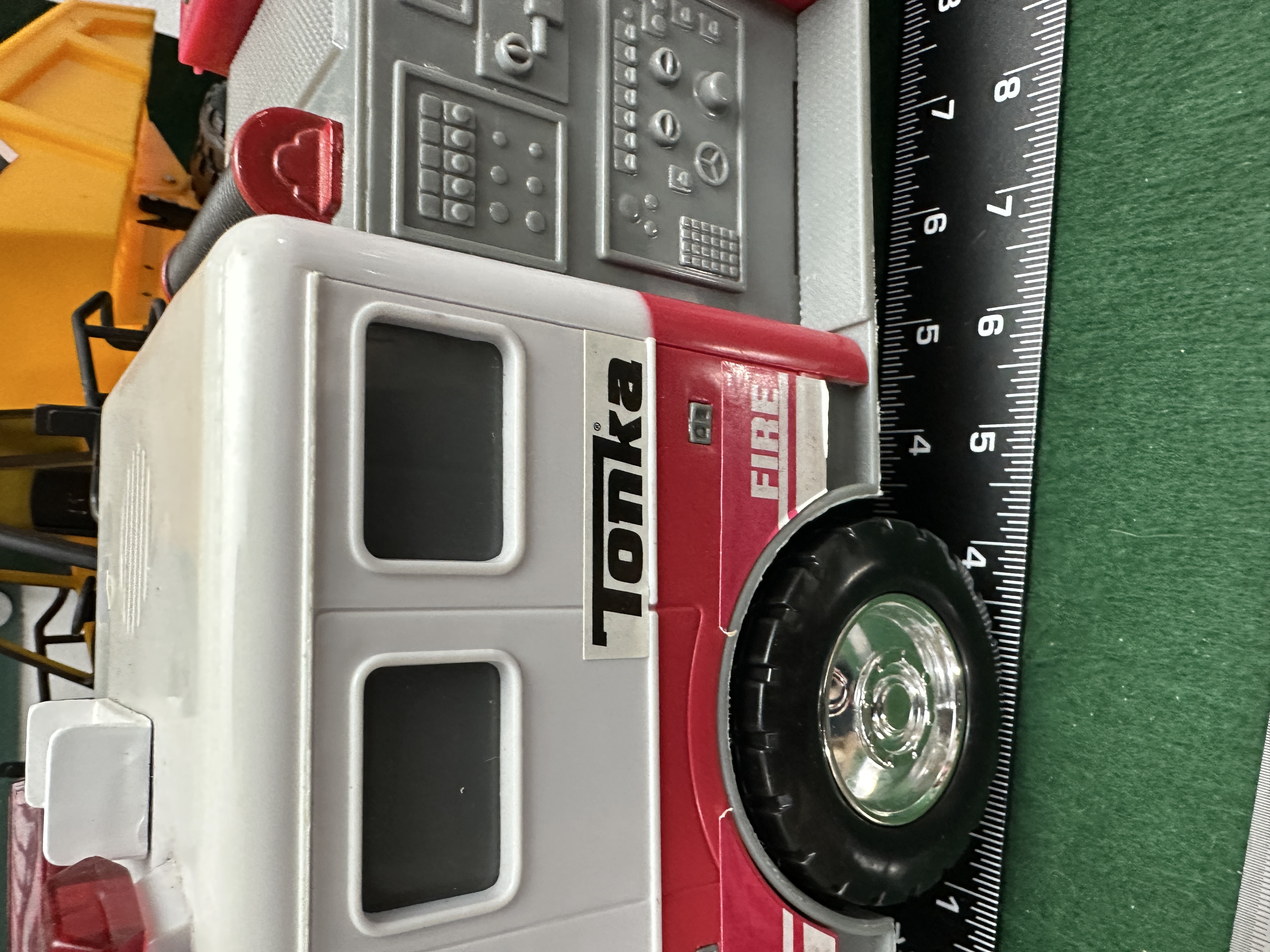 Items are in play-worn condition. The fire truck exhibits peeling to the adhesive stickers and the electronic light and sound functions are untested. The articulated dump truck is missing the vertical exhaust pipe from the right side. General surface scuffing and wear consistent with play are present throughout the lot. No original boxes are present.