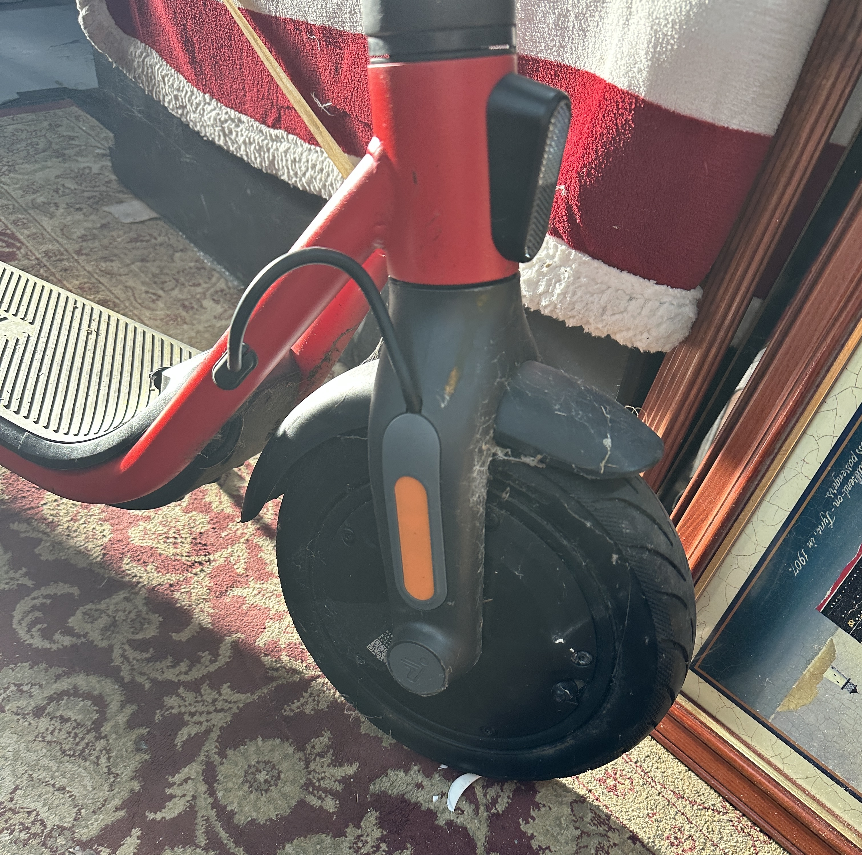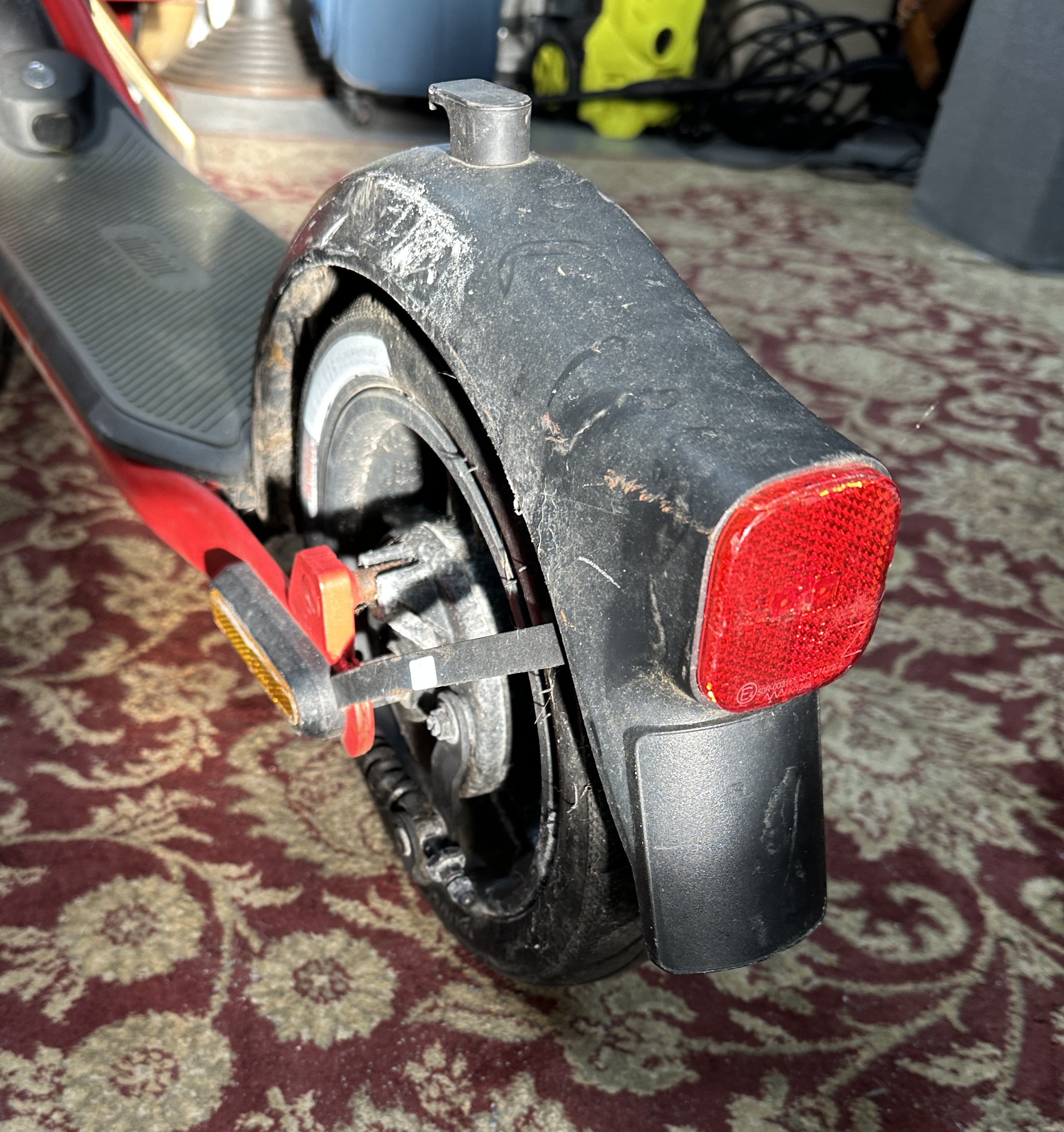 The vehicle is in poor condition and is offered for repair or parts only. The rear pneumatic tyre is severely damaged, shredded, and has become detached from the rim. Significant scuffing and scratches are present on the frame, mudguards, and plastic components. There is a notable accumulation of dirt, dust, and cobwebs consistent with long-term storage. The mechanical and electronic functionality, including the battery health and motor operation, has not been tested. The odometer reading was not visible during inspection; therefore, the mileage is unverified.