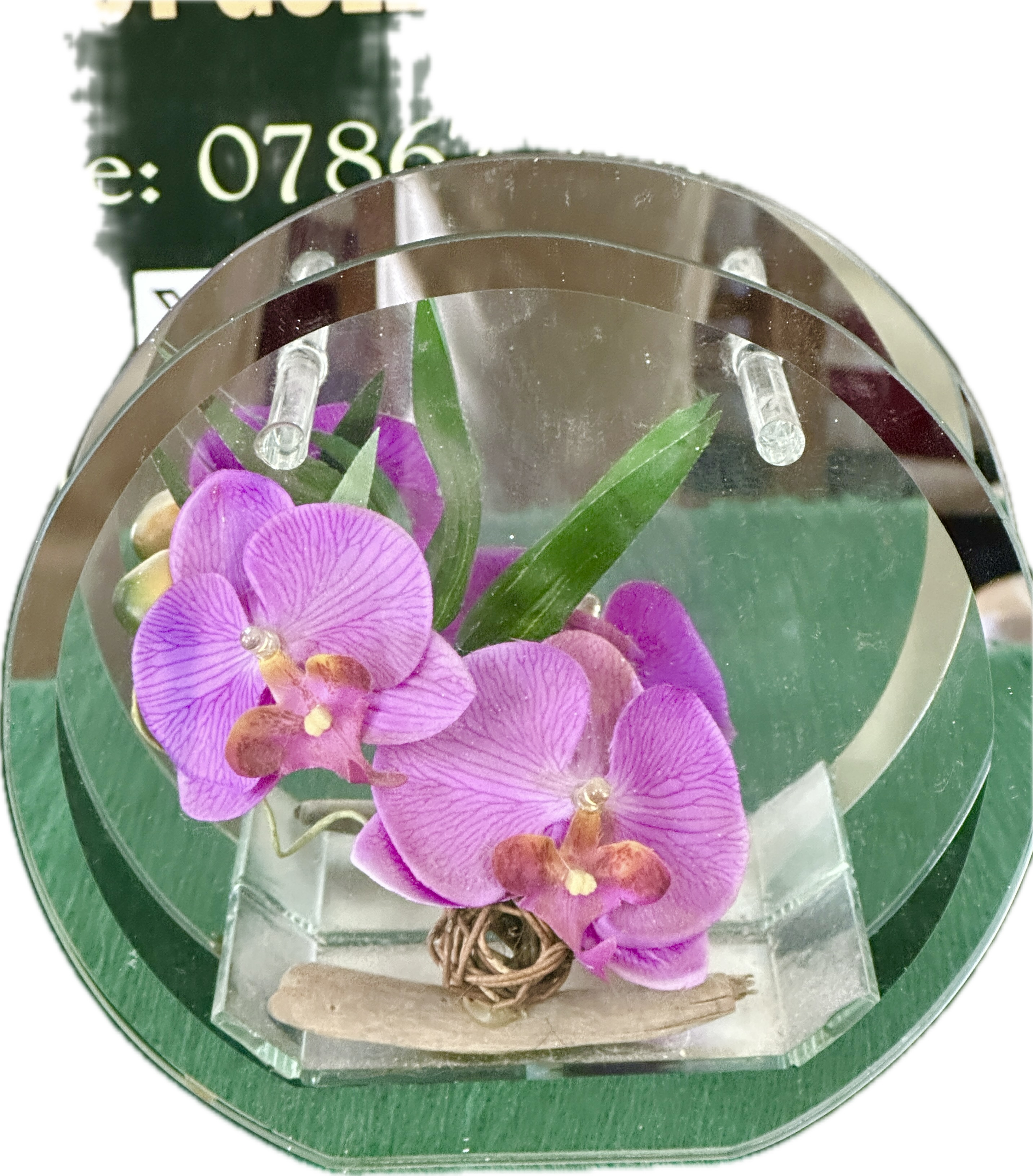 A contemporary decorative botanical display featuring preserved or artificial purple Phalaenopsis orchid blooms and green foliage. The arrangement incorporates a small driftwood branch and a decorative woven wire sphere. These elements are encapsulated within a thick-walled, circular clear acrylic vessel. The unit is set upon a multifaceted clear acrylic base. No maker marks or signatures are visible on the piece.