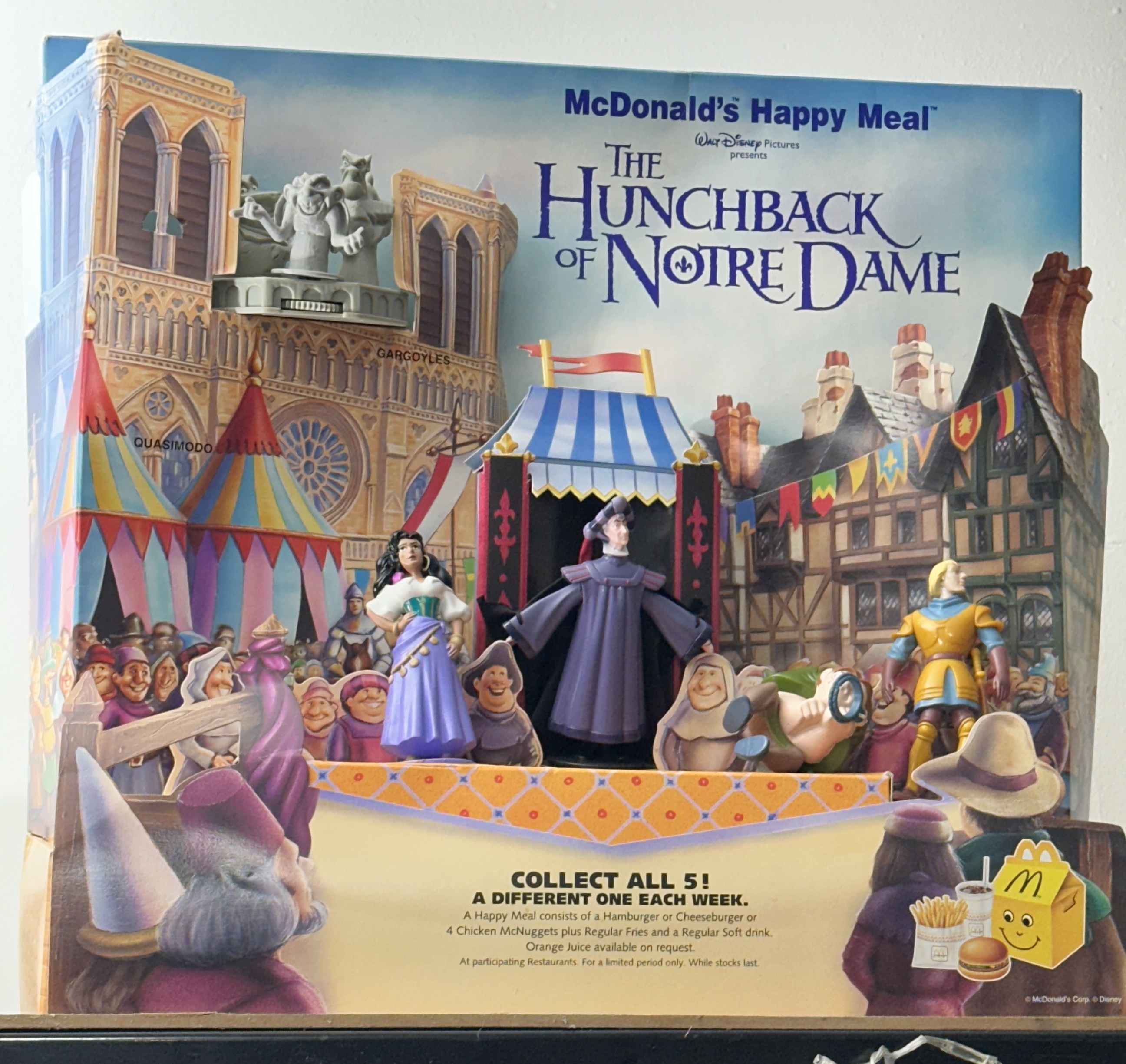 A McDonald’s Happy Meal promotional point-of-sale counter display for the 1996 Disney animated feature film The Hunchback of Notre Dame. The unit is constructed from die-cut printed cardboard and features a multi-dimensional backdrop depicting Notre Dame Cathedral, festival tents, and a Parisian crowd. The display includes five mounted moulded plastic promotional figures: Esmeralda, Judge Claude Frollo, Quasimodo, Captain Phoebus, and a three-character group of the Gargoyles (Victor, Hugo, and Laverne). The Gargoyles figure is mounted on a grey stone-effect base with an integrated manual plastic thumbwheel mechanism. The lower section of the display features promotional text and a graphic of a Happy Meal box. The item is marked McDonald’s Happy Meal at the top and bears the copyright marks © McDonald’s Corp. © Disney at the lower right corner.