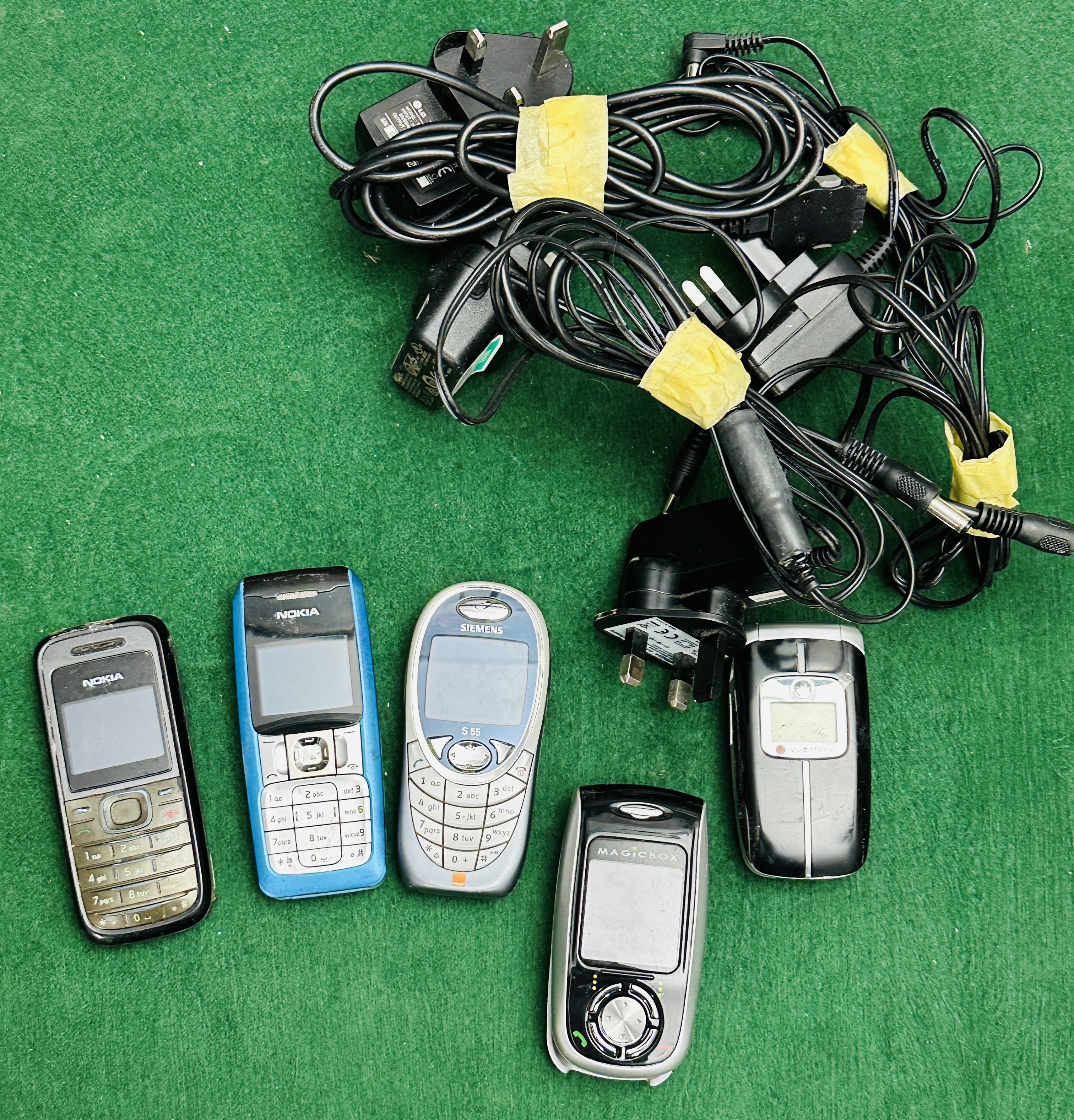 A collection of five vintage mobile telephones and a variety of charging accessories. The lot includes two Nokia candy bar style handsets, one in a black and silver plastic housing and the other in blue and silver. A Siemens S55 handset is present, featuring a silver and grey plastic body with blue accents and the model designation S55 printed below the screen. The collection also contains a Magicbox compact mobile device with a silver and black plastic housing and a navigational wheel interface, and a Vodafone branded clamshell style telephone in black and silver. The associated accessories consist of a group of power adapters and cables, several of which feature UK Type G three-pin plugs. One power adapter is marked with the LG logo. The cables are secured with yellow masking tape.