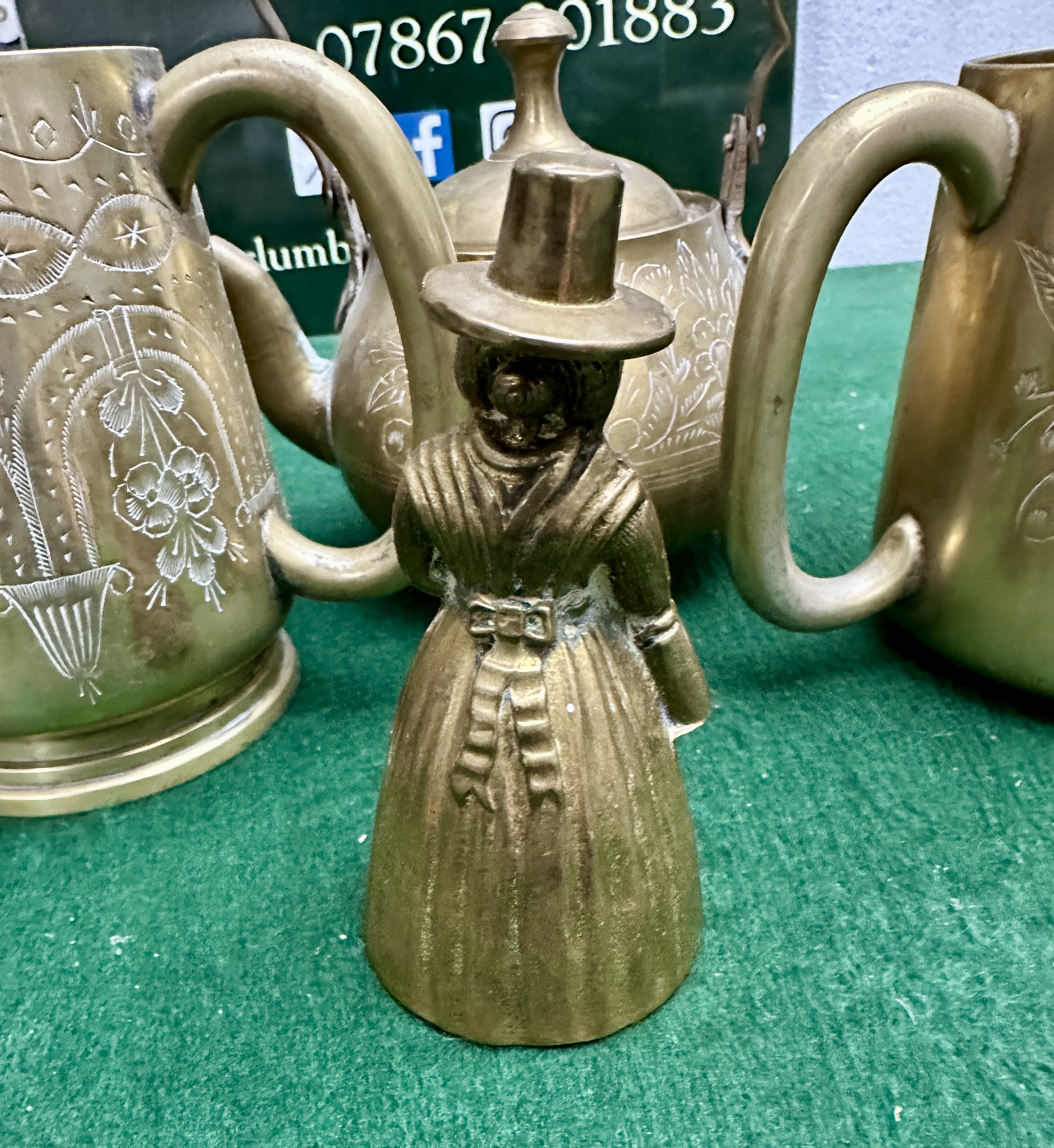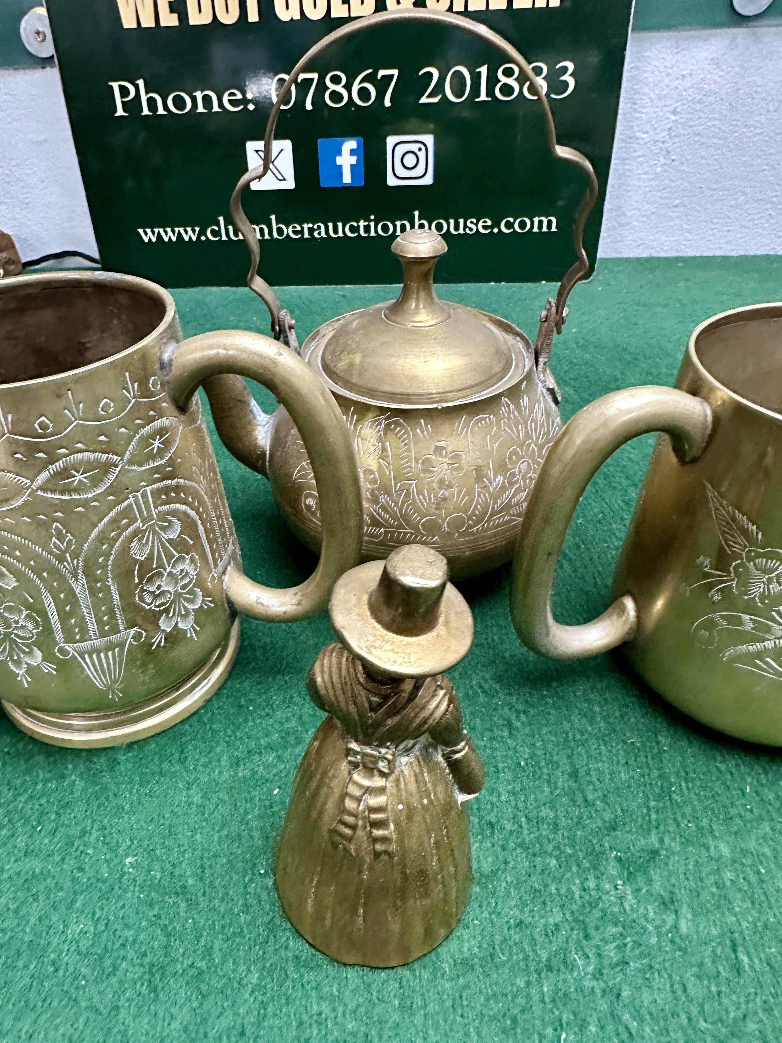 A group of decorative brassware comprising a lidded kettle, two tankards, and a small hand bell. The kettle and tankards are constructed from brass and feature hand-etched or incised floral, foliate, and geometric patterns, in a style often associated with Moroccan or Indian metalwork. The lidded kettle includes a fixed side handle and a shaped swing top handle with a finial lid. The two tankards feature similar etched decoration and curved handles. The small hand bell is cast in brass in the form of a woman in traditional Welsh costume, featuring a tall hat and a detailed apron. No maker’s marks, signatures, or hallmarks are visible on the exterior surfaces.
