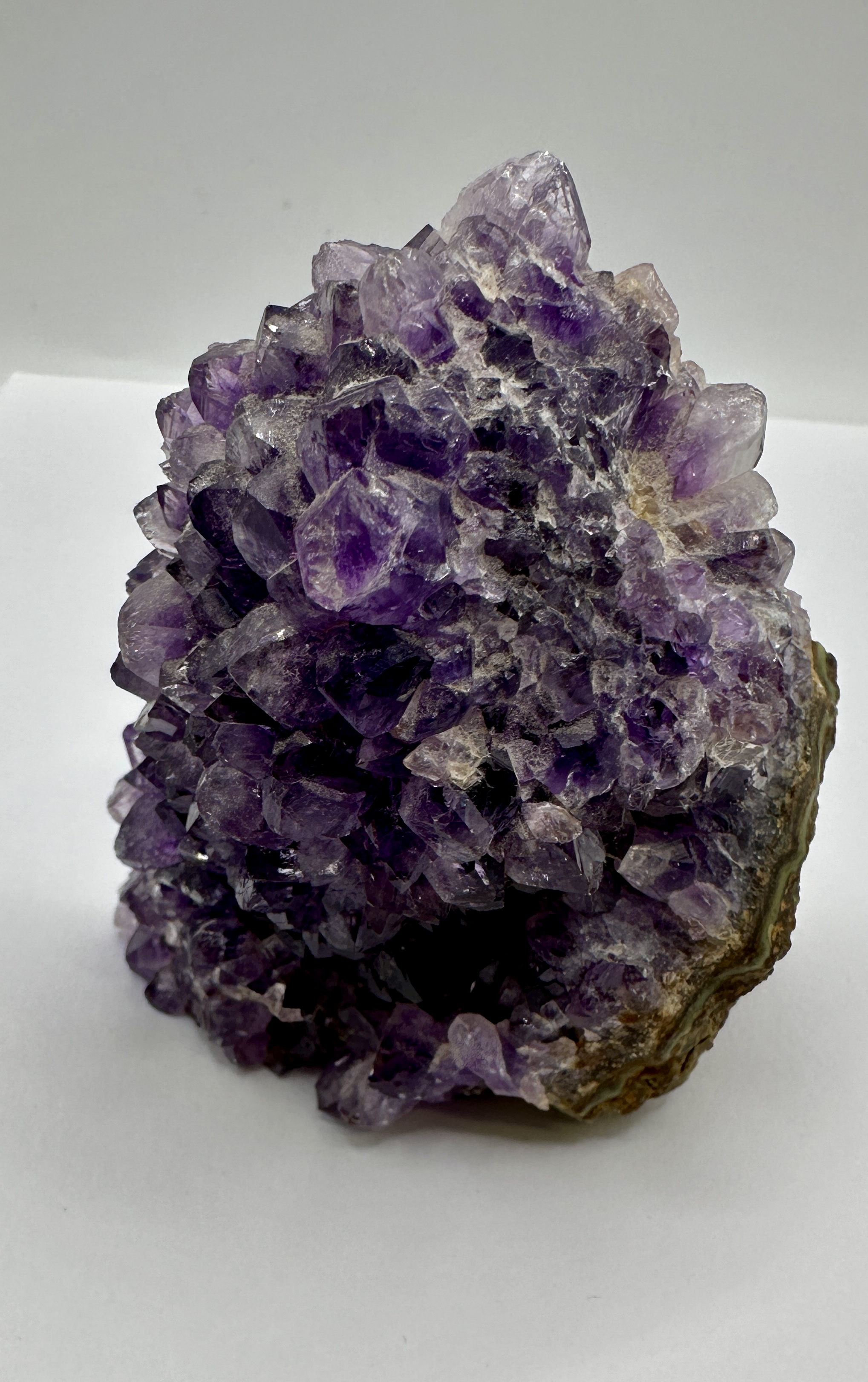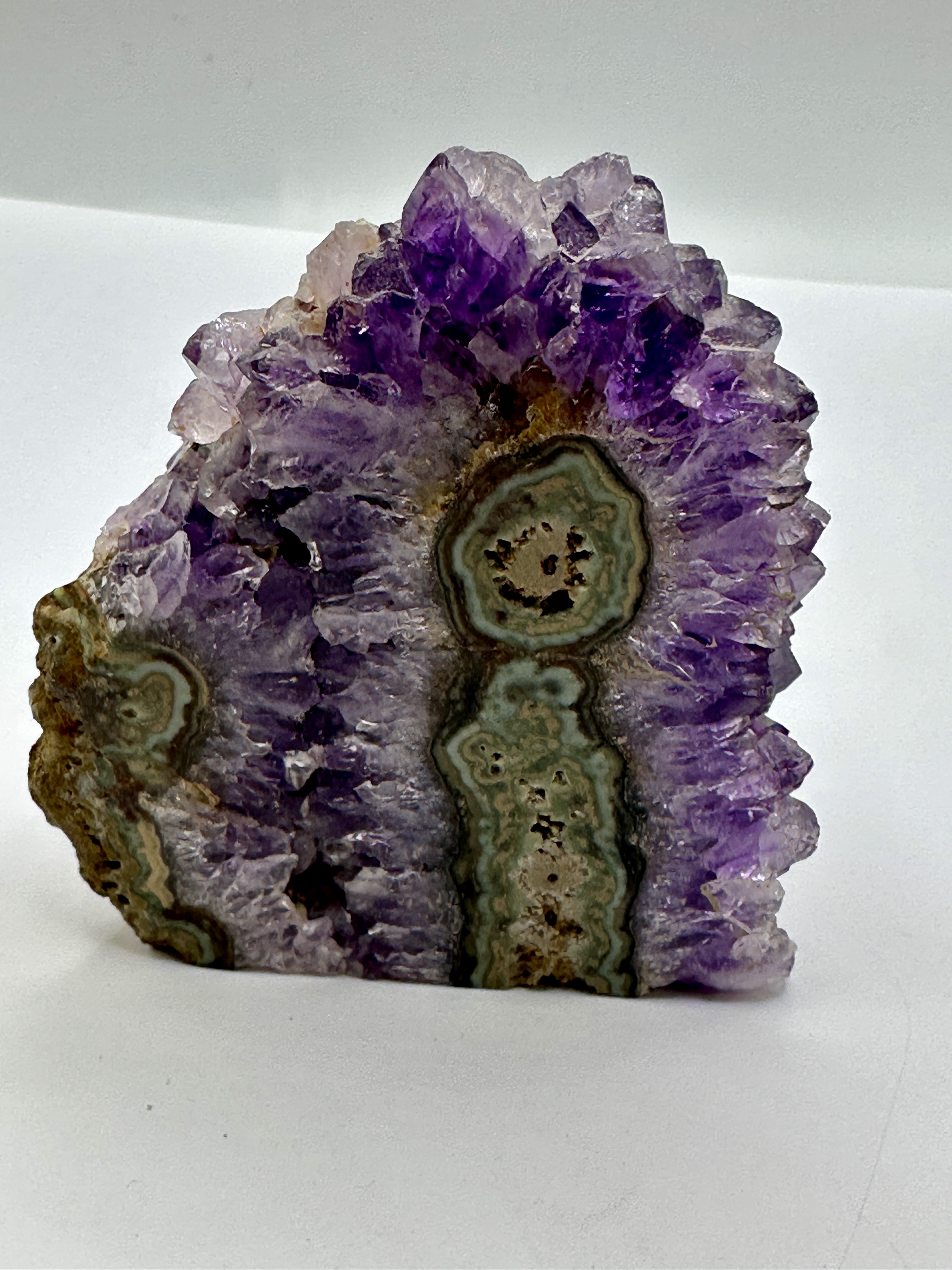 A natural amethyst stalactite crystal cluster featuring a dense concentration of well-defined amethyst crystals with a deep purple hue. The reverse side is cut and polished flat to reveal a geological cross-section of the stalactitic core. This polished face displays concentric agate banding in shades of sage green, cream, and brown, forming three distinct eyes from which the quartz crystals have grown. The specimen is free-standing on a flat-cut base. The form and colouration are characteristic of amethyst specimens recovered from Artigas, Uruguay.