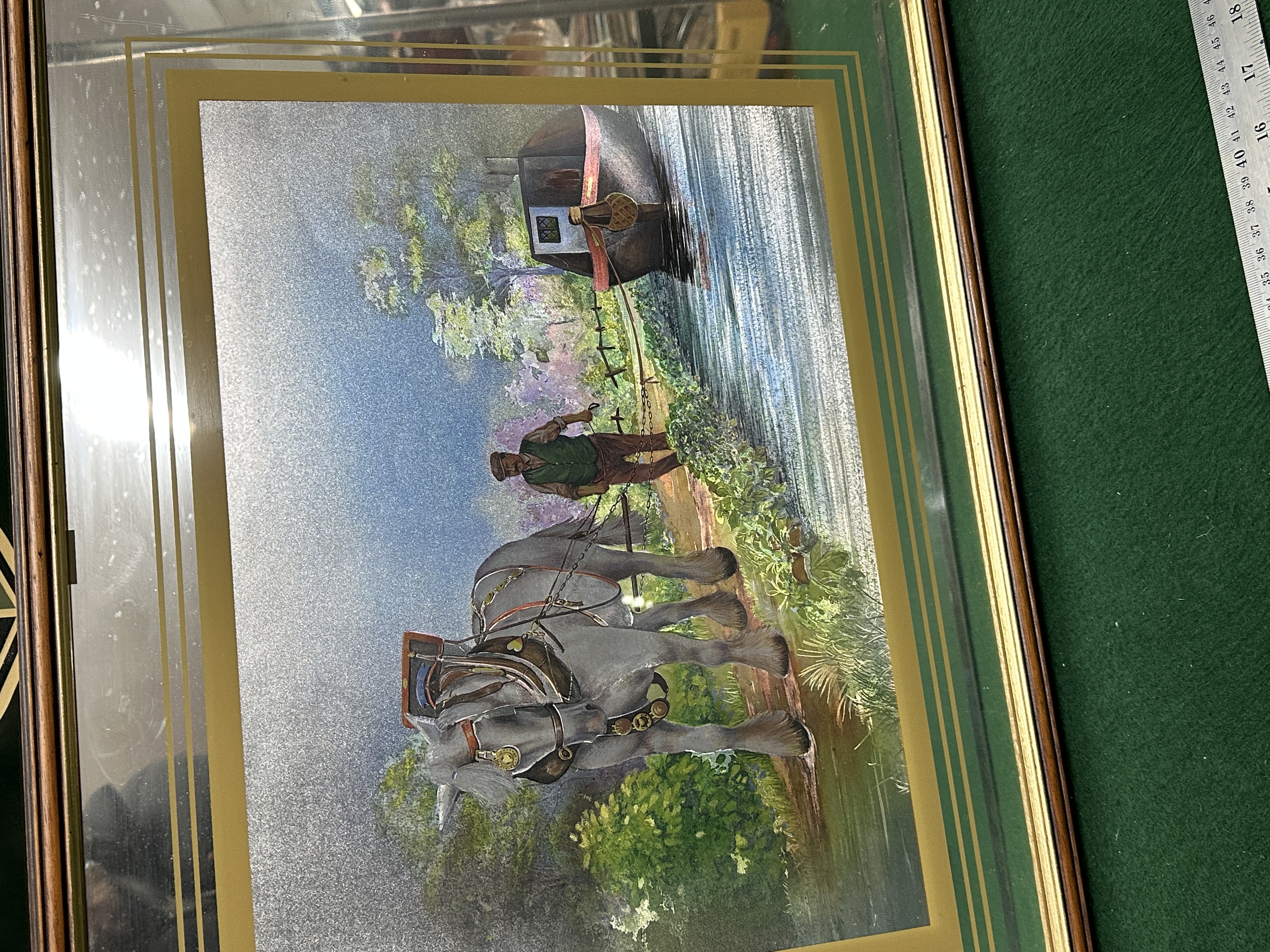 A decorative screenprint on a mirrored glass substrate, depicting a traditional English canal scene. The composition features a heavy horse in harness towing a narrowboat along a waterway, led by a man dressed in a green waistcoat and flat cap. The central image is surrounded by a triple-banded gilt slip and wide mirrored borders. The work is housed in a dark wood-effect frame with a gilt-lined inner edge. No artist signature, edition number, or publisher marks are visible on the front of the piece.