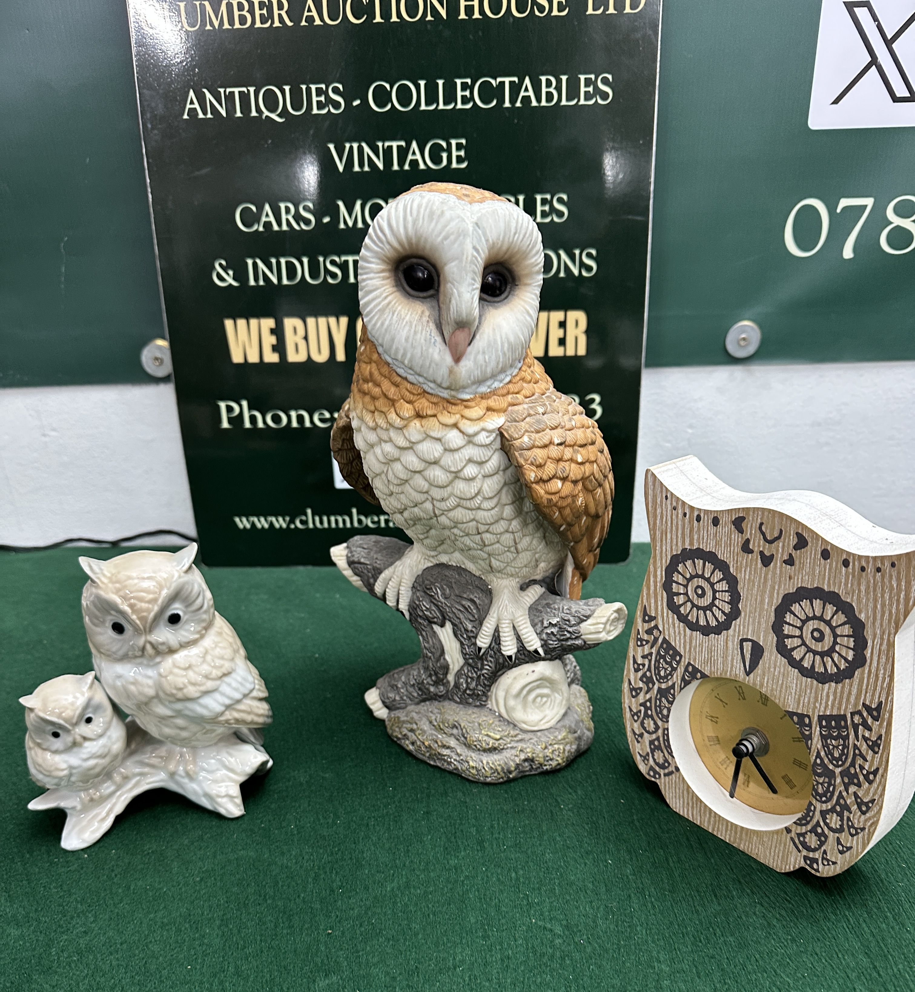 A collection of three owl-themed decorative items. The lot includes a novelty mantel clock in the form of a stylized owl, constructed from a composite material with a white finish and printed black and brown decorative patterns. The clock features a circular gold-tone dial with black Roman numeral hour markers and black baton hands, housing a likely quartz movement. Also included is a realistically modeled figurine of a barn owl perched on a branch, finished in naturalistic colours and likely made of painted resin. The final item is a small glazed ceramic figurine depicting two owls on a branch. No maker’s marks or signatures are visible on any of the pieces.