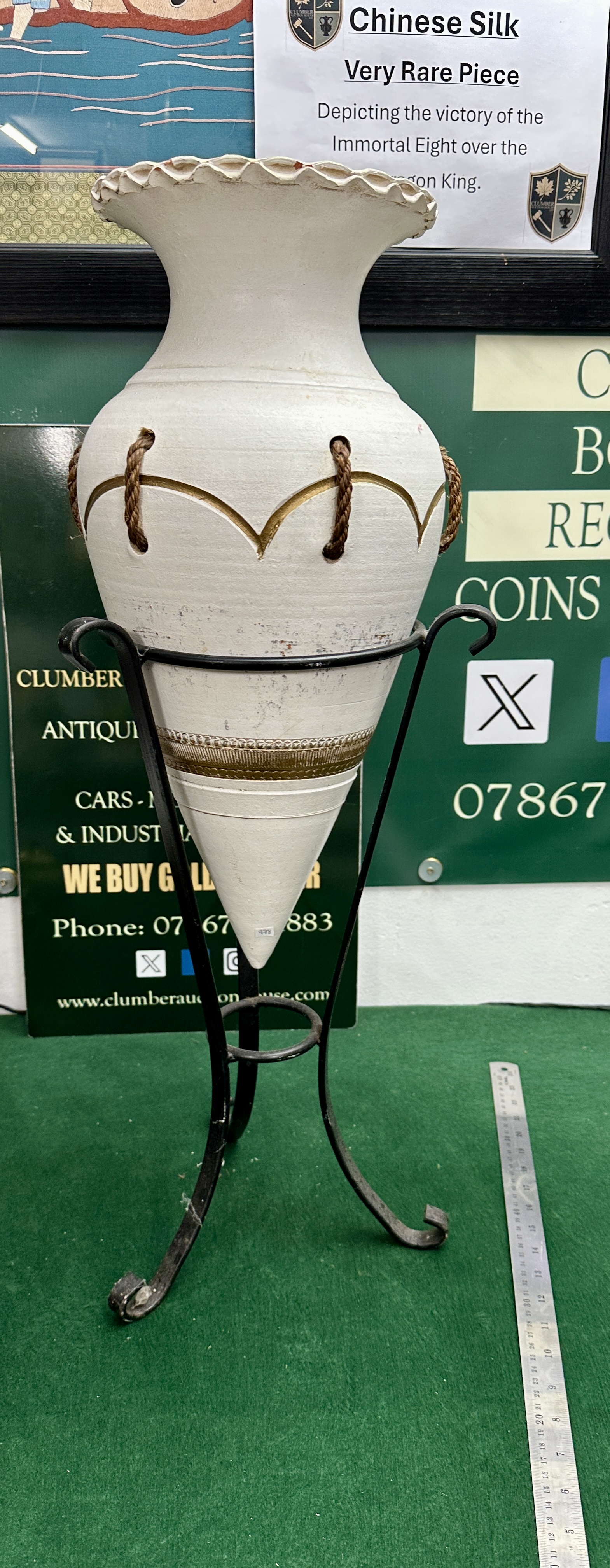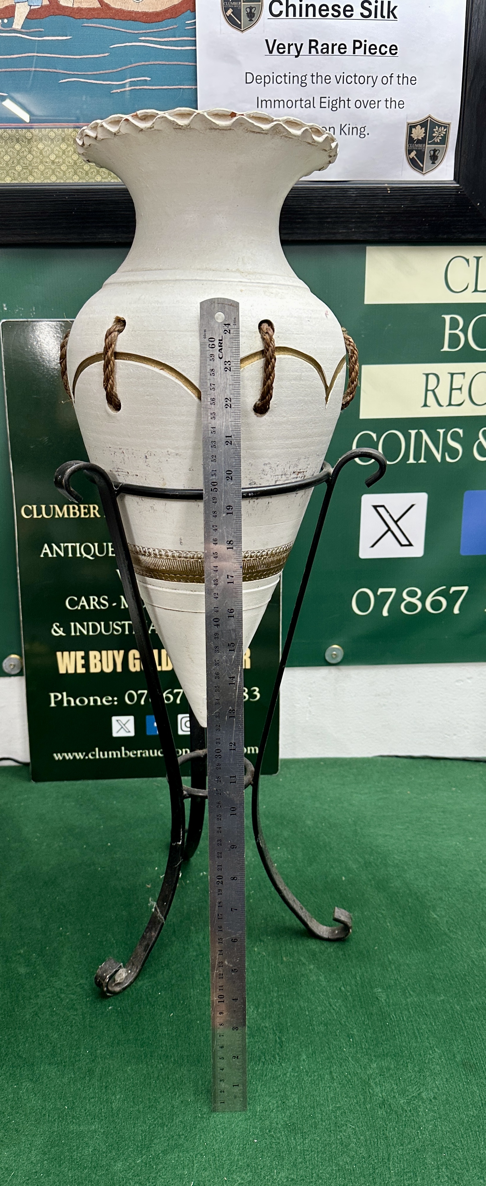 A decorative ceramic vase of tapering conical amphora form with a pointed base, presented on a separate metal stand. The vessel is constructed from a light-coloured ceramic featuring a matte white-painted finish accented with gold-toned highlights. The design includes a wide flared neck terminating in a scalloped rim, an incised wavy band around the shoulder, and a band of impressed geometric patterns to the lower section. Two braided brown rope handles are threaded through piercings at the shoulder. The assembly is supported by a black-painted metal tripod stand with scrolled feet. No maker’s marks or signatures are visible; a small adhesive label with the numerals 478 is present near the base.