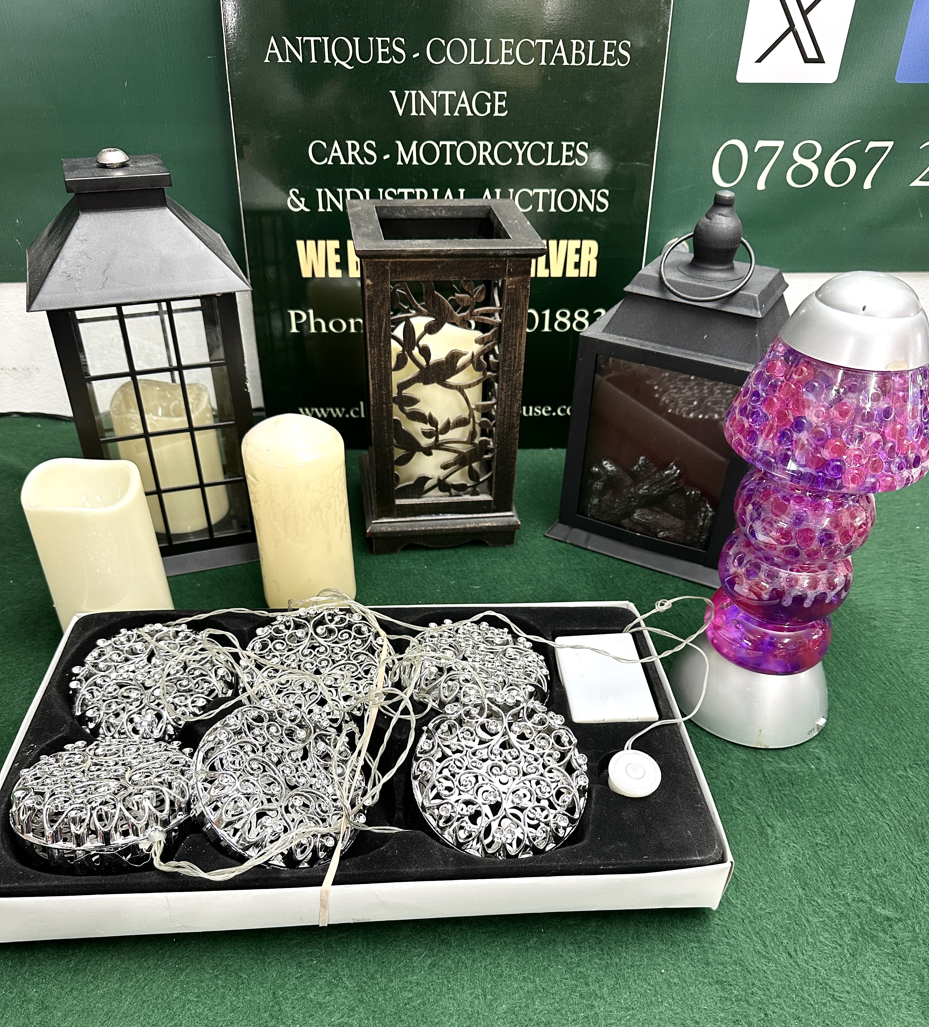 A group lot of contemporary decorative lighting and home accessories, including a set of battery-operated LED string lights with silver-toned filigree globe covers resembling the designs of Kurt S. Adler. The collection also features a black-finished metal and glass coach-style lantern containing a cream-coloured LED pillar candle, and two standalone cream-coloured LED pillar candles with a wax-effect finish. Also included is a rustic-style lantern with a dark wood-effect frame and metal fretwork panels depicting a bird and branch motif, housing an internal LED candle. The lot further contains a contemporary black decorative lantern with glass panels and an internal faux-log ember effect. Additionally, there is a novelty bead lamp with a silver-toned plastic base and cap, the body filled with translucent purple and pink gel beads. No maker’s marks are visible on any of the items.