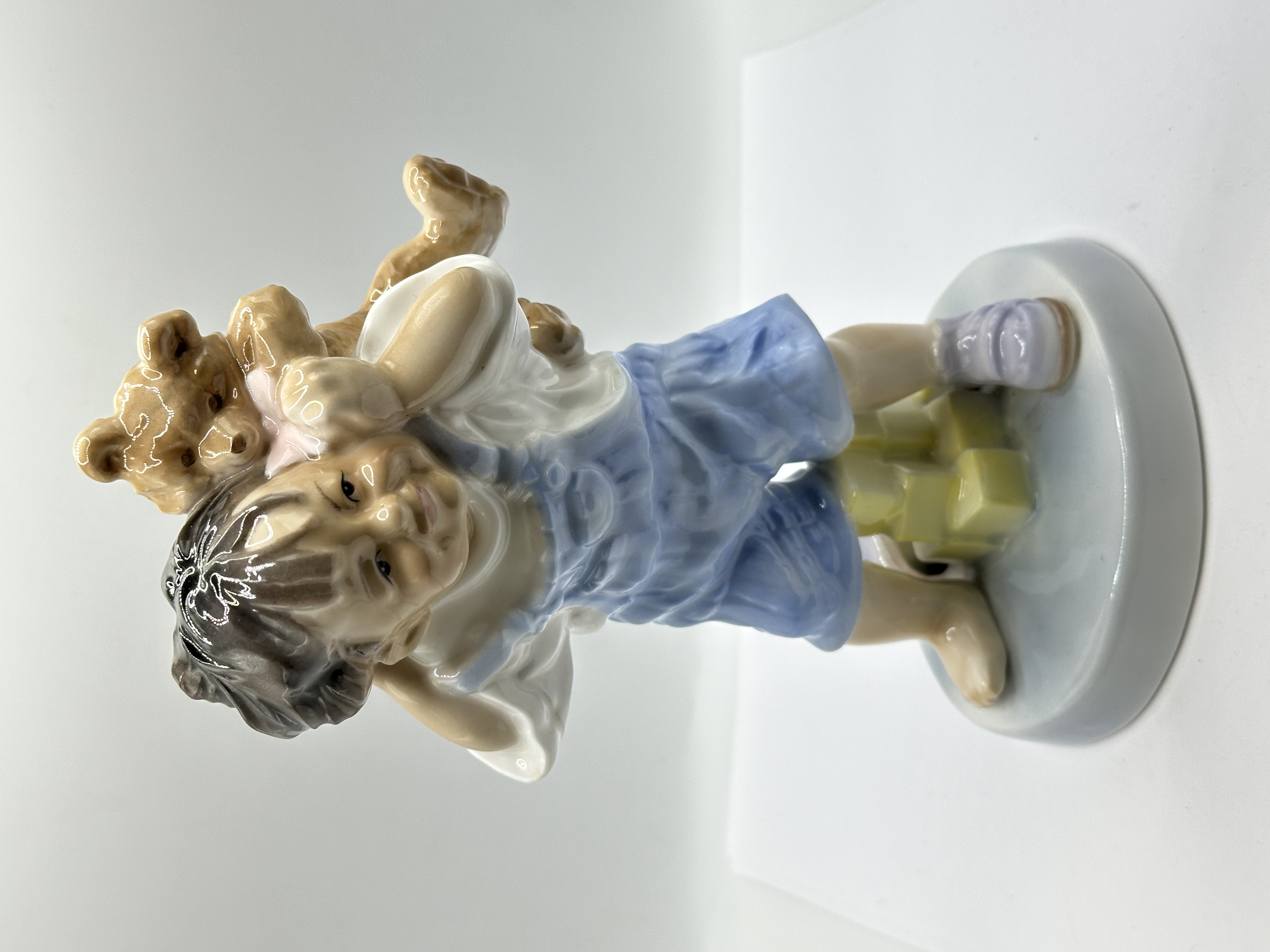 The figurine is in excellent condition with no visible chips, cracks, or crazing. The glaze and painted details are well-preserved. A small paper inventory label is present on the base.