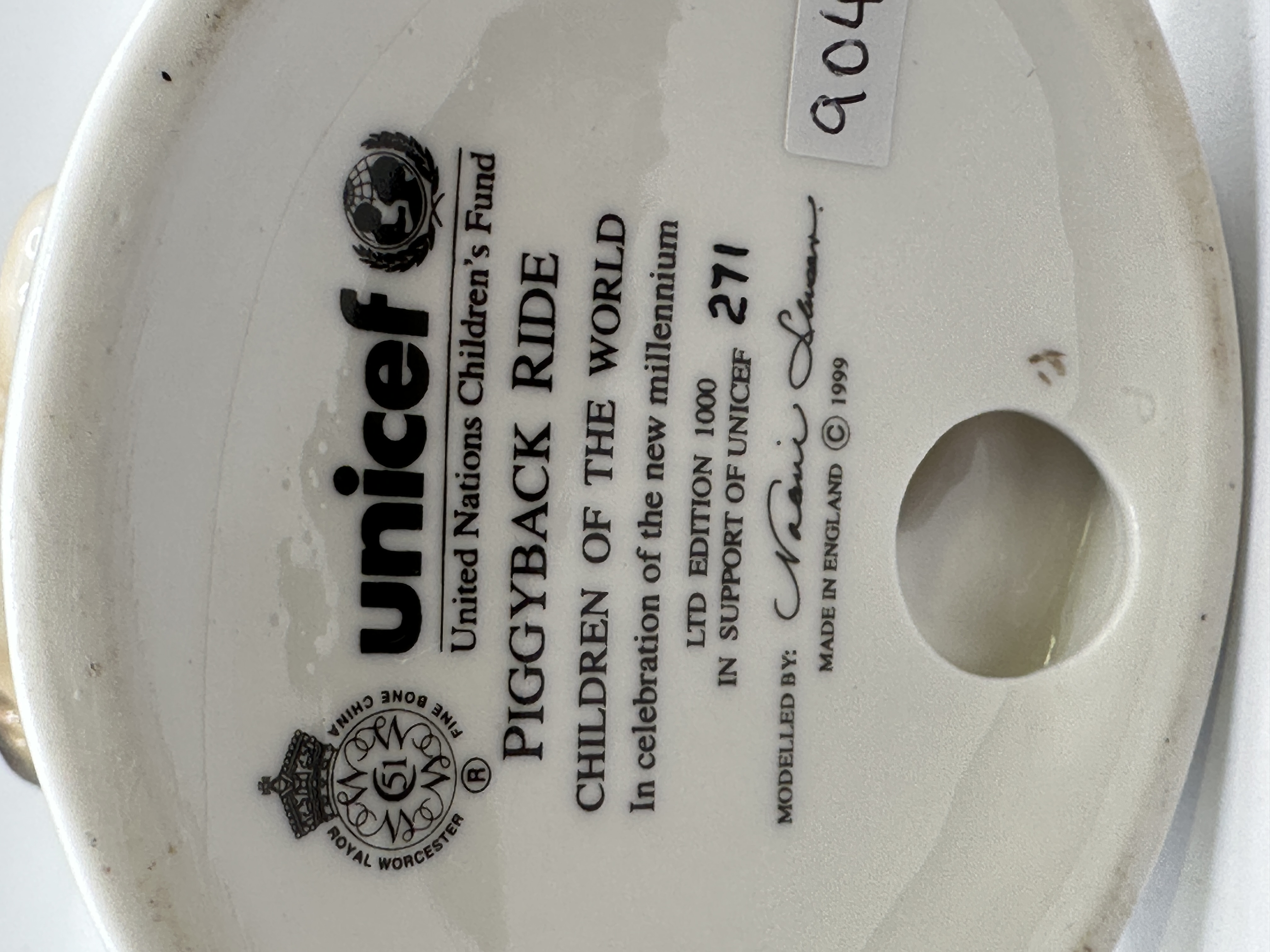Glazed fine bone china figurine titled Piggyback Ride, manufactured by Royal Worcester in England. The piece was released in 1999 as part of the Children of the World series in support of UNICEF. The figurine depicts a smiling child with dark hair wearing a white t-shirt and light blue dungarees, carrying a tan-coloured teddy bear on their back. The figure stands on a circular white base alongside three stacked yellow toy blocks. The underside features the Royal Worcester crown mark with the number 51, the UNICEF logo, and printed text identifying the model name, series, and sculptor Naomi Lawson. This example is numbered 271 from a limited edition of 1000.