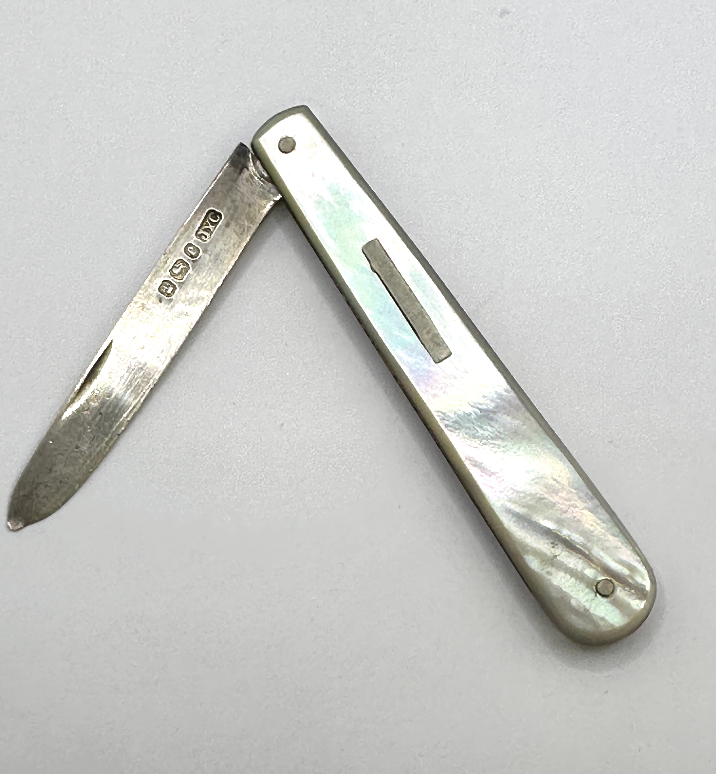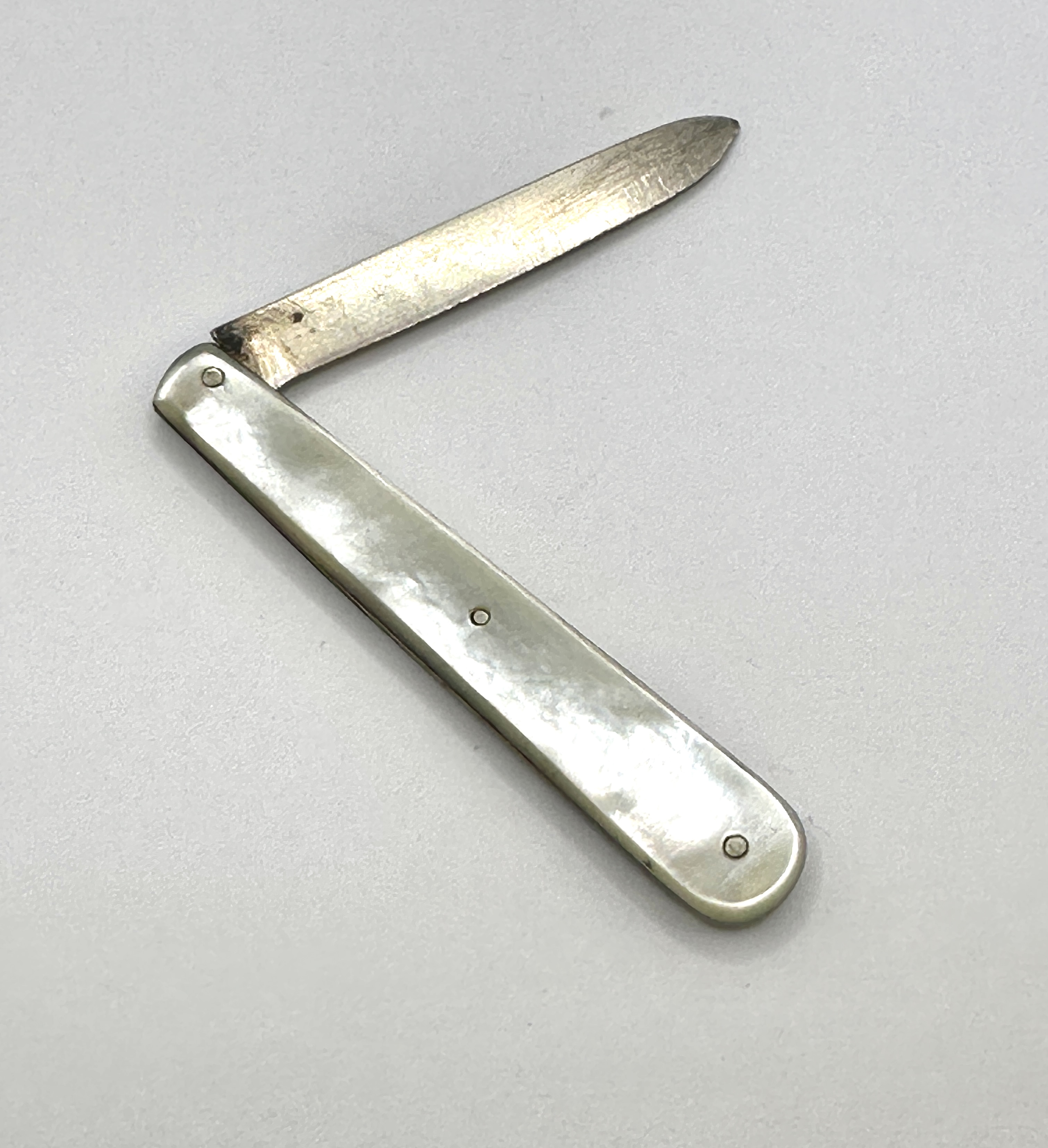 The 925 silver blade shows surface tarnishing and oxidation, particularly at the pivot point. The edge is in good condition with no visible nicks. The mother-of-pearl scales are well-preserved with no chips or cracks. The folding action is functional.