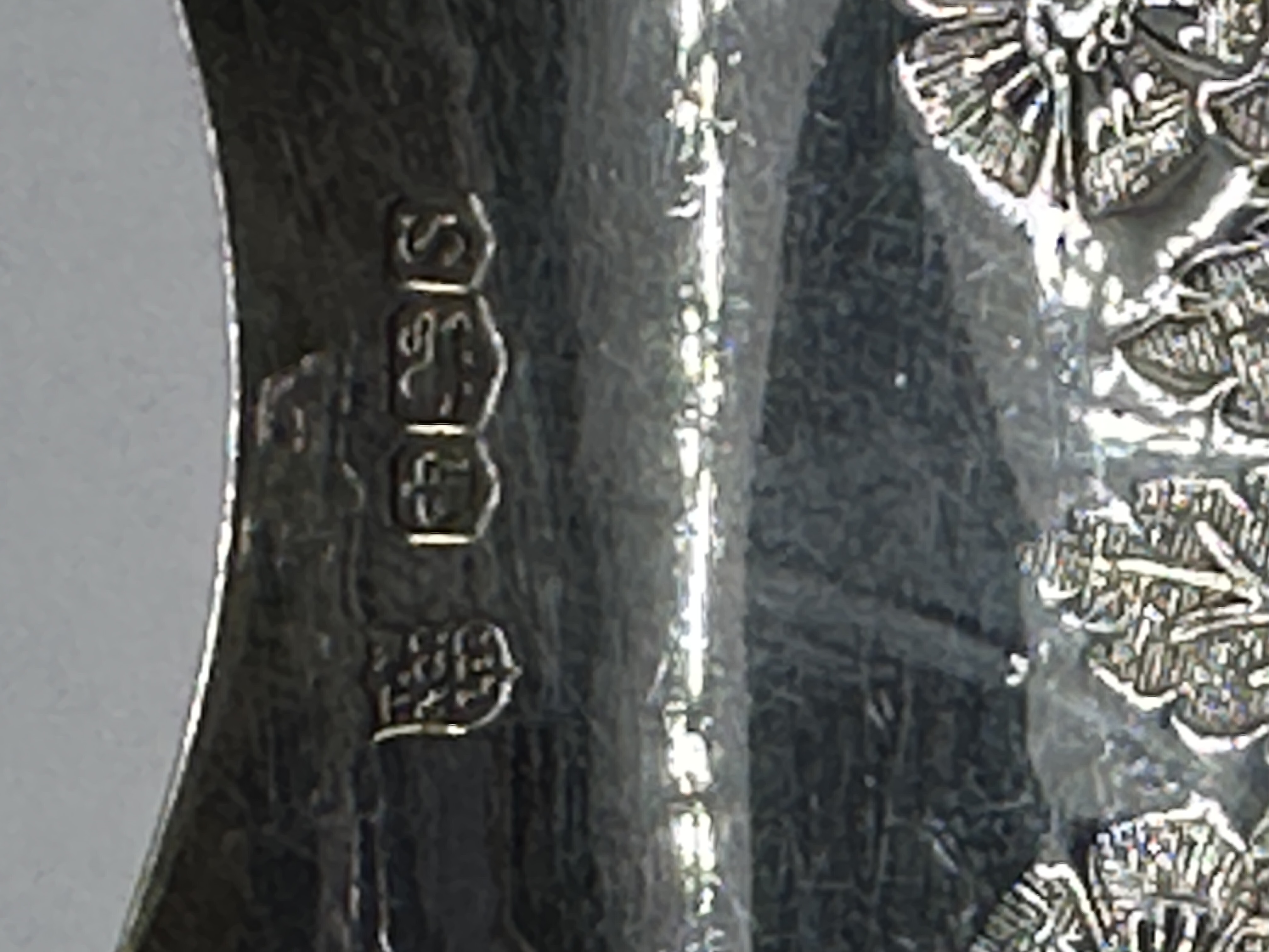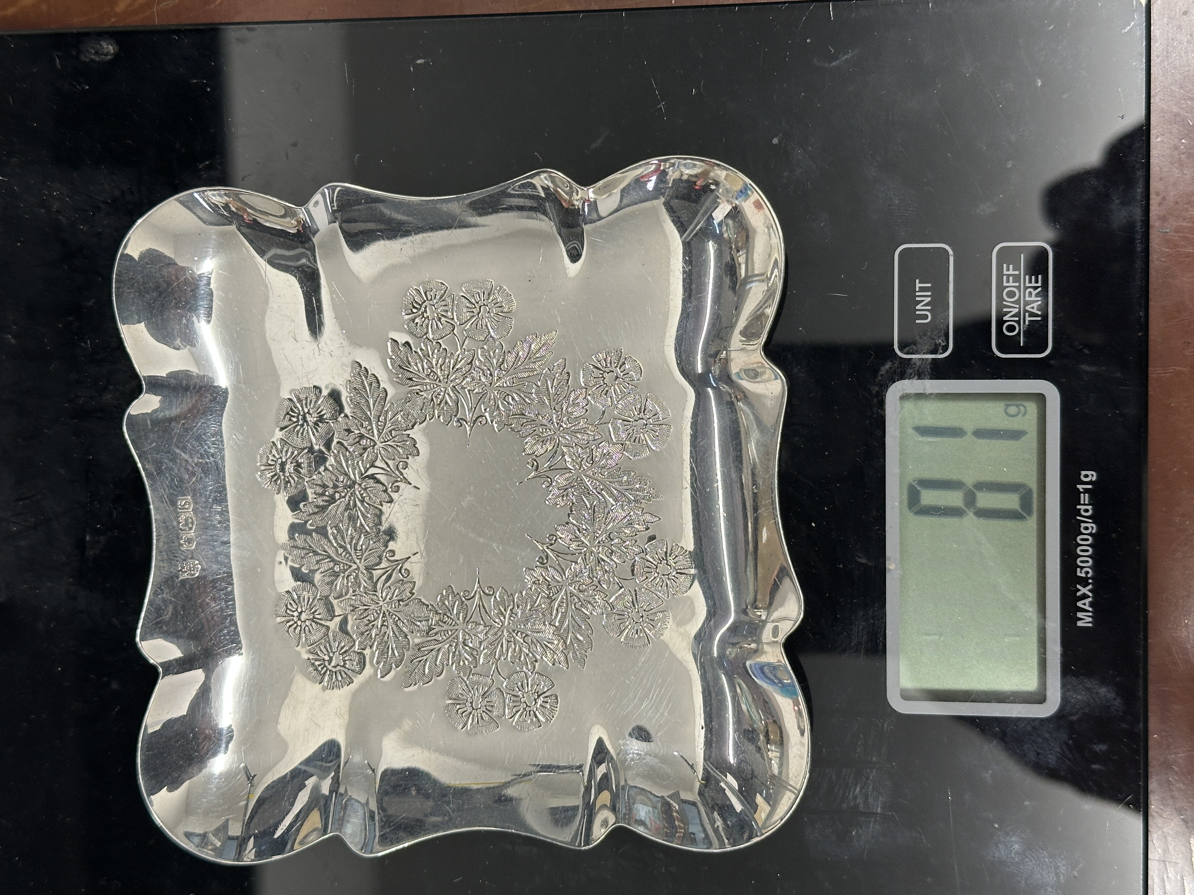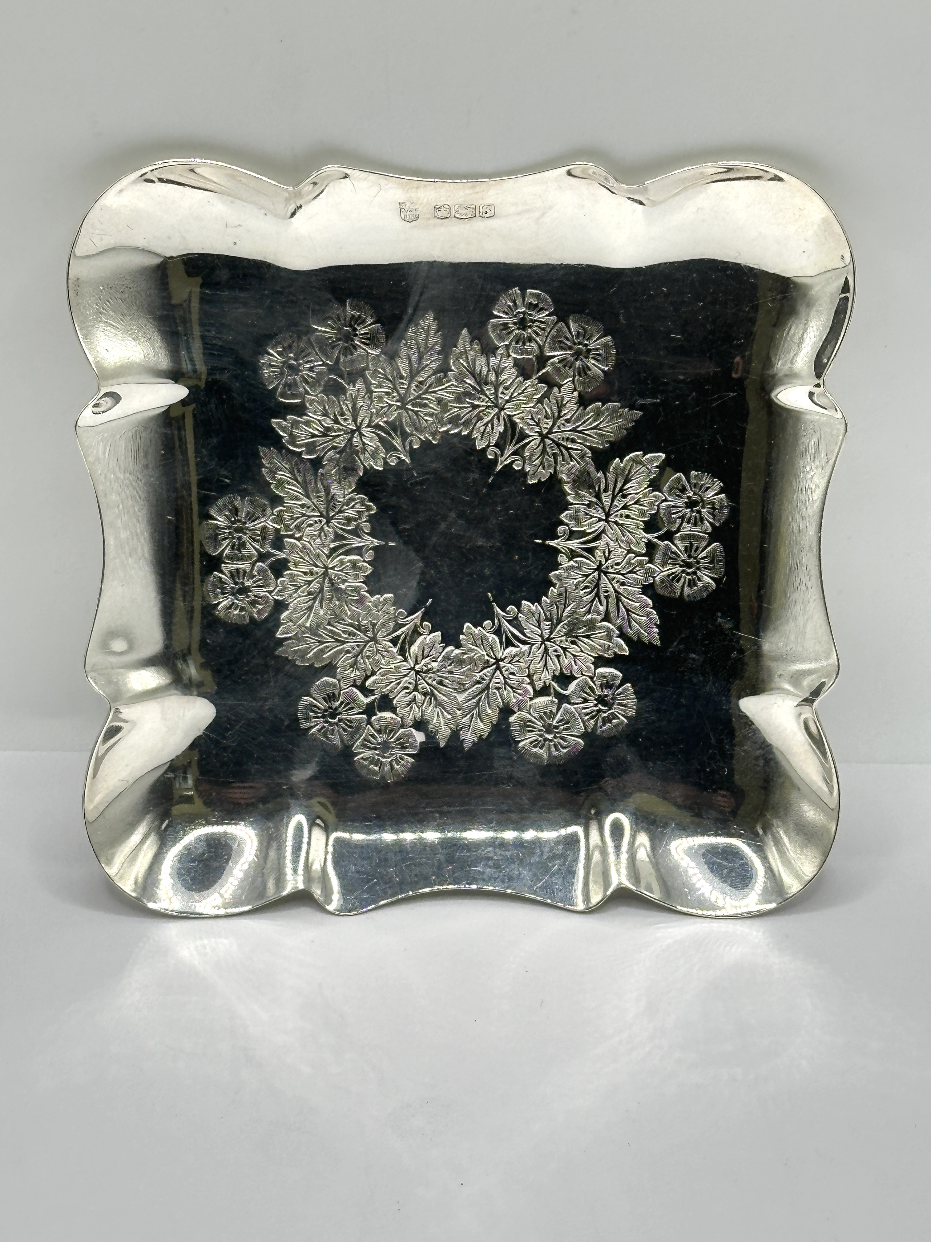 This 925 silver item is a late Victorian square dish or pin tray of small proportions. The piece is of square form featuring a decorative undulating and crimped rim. The centre is embellished with a chased and embossed floral and foliate wreath, depicting detailed leaves and blooming flower heads in a naturalistic style characteristic of the late 19th century. The interior rim bears a full set of British hallmarks including the maker mark C S for Saunders and Shepherd (Cornelius Desormeaux Saunders and James Francis Hollings Shepherd), the anchor for the Birmingham assay office, the lion passant for sterling silver, and the date letter S for 1892.