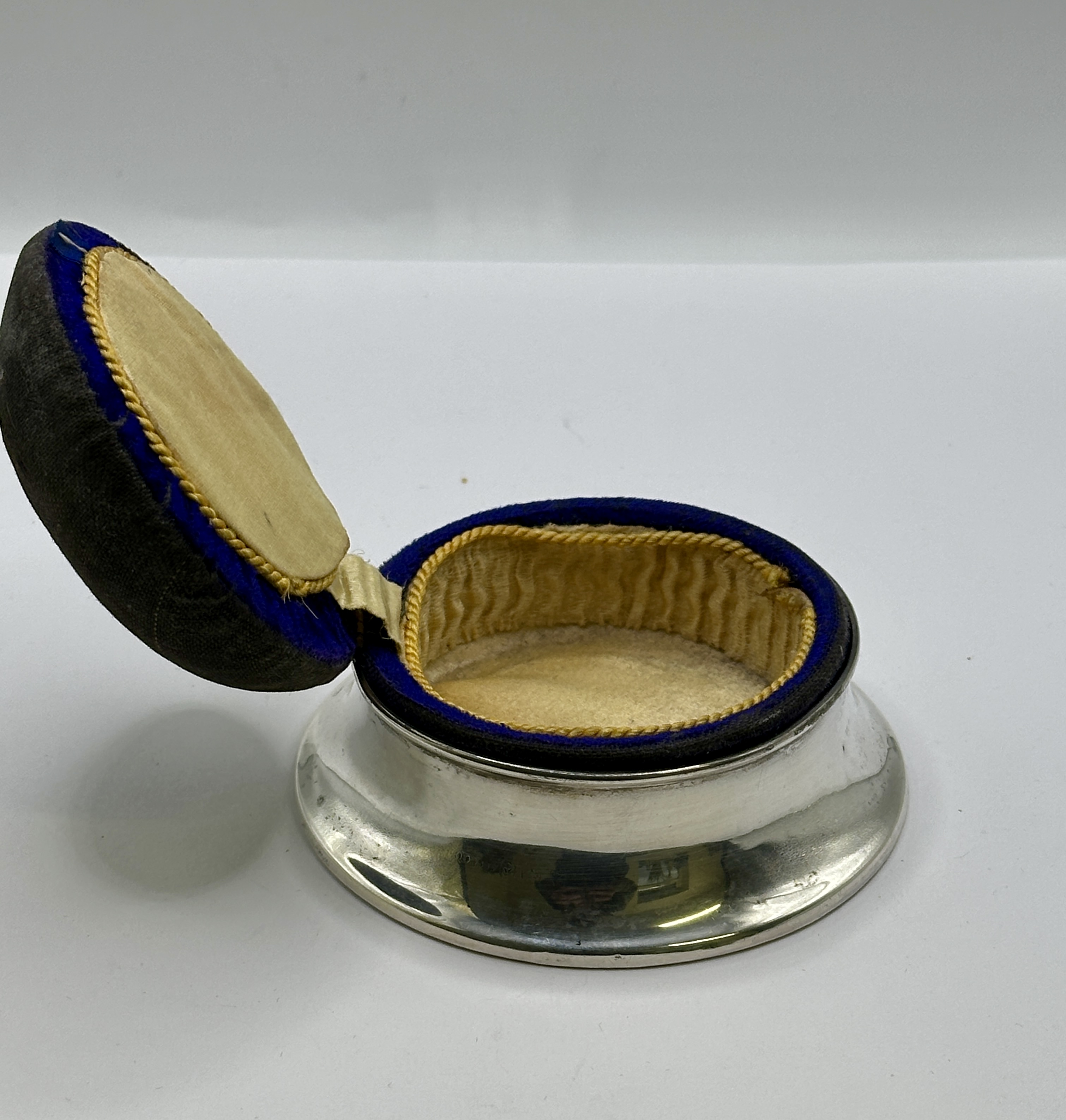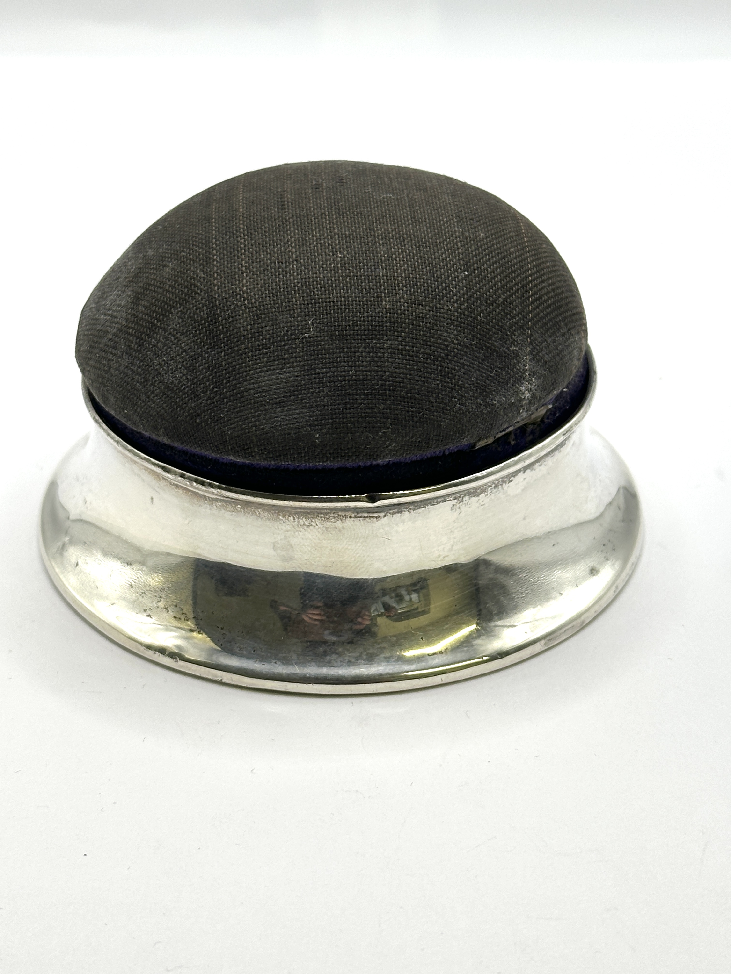 A 925 silver pincushion box of circular form, attributed to Birks. The piece features a flared, hollow-form base with a polished finish. The domed lid is upholstered in a dark, woven fabric, designed to function as a pincushion. The hinged lid opens to reveal a small interior compartment lined with gold-toned gathered silk and finished with a coordinating braided cord trim. While visually consistent with known examples by the Canadian silversmith Birks, no hallmarks or maker’s marks are visible in the provided images.