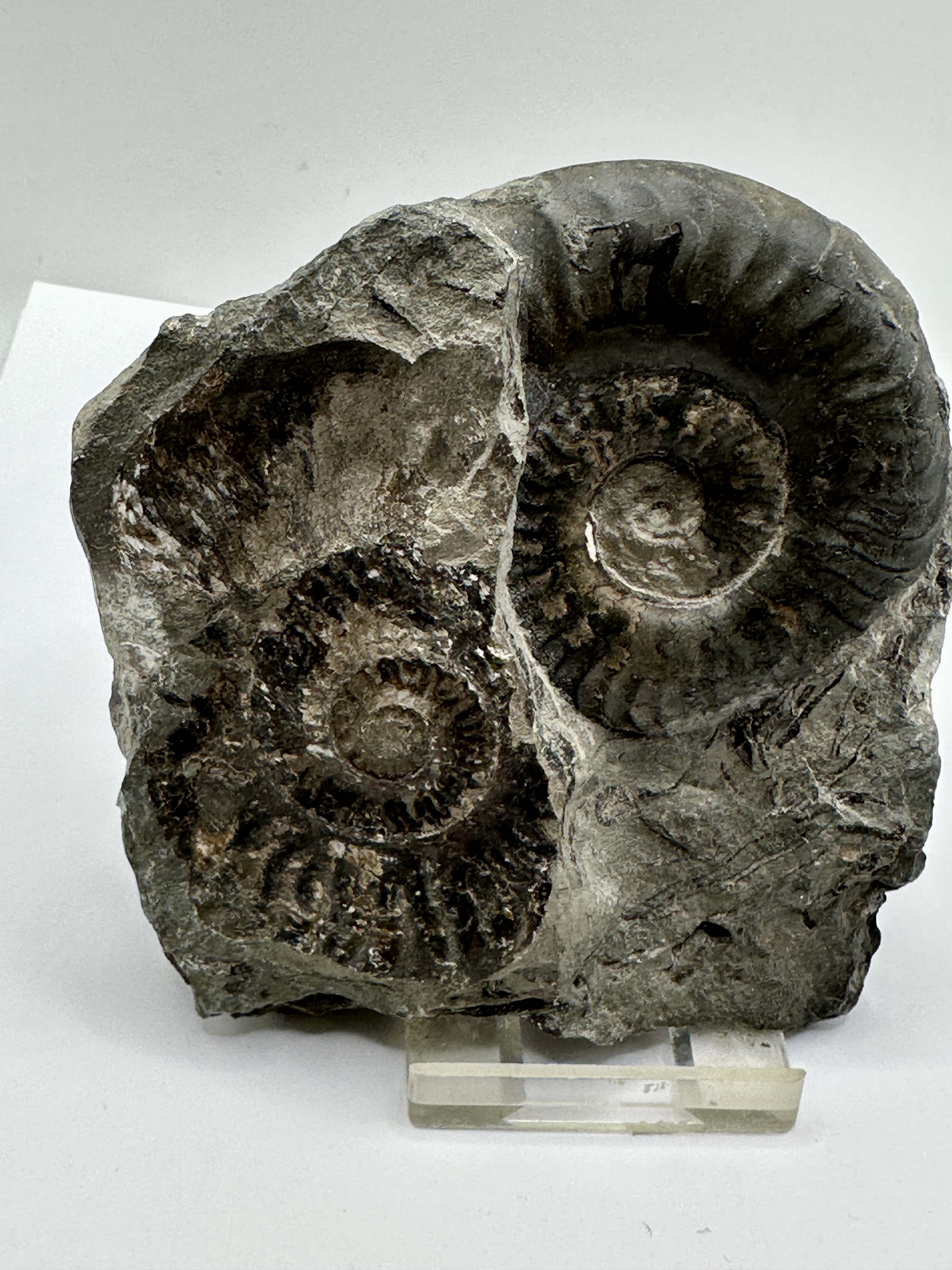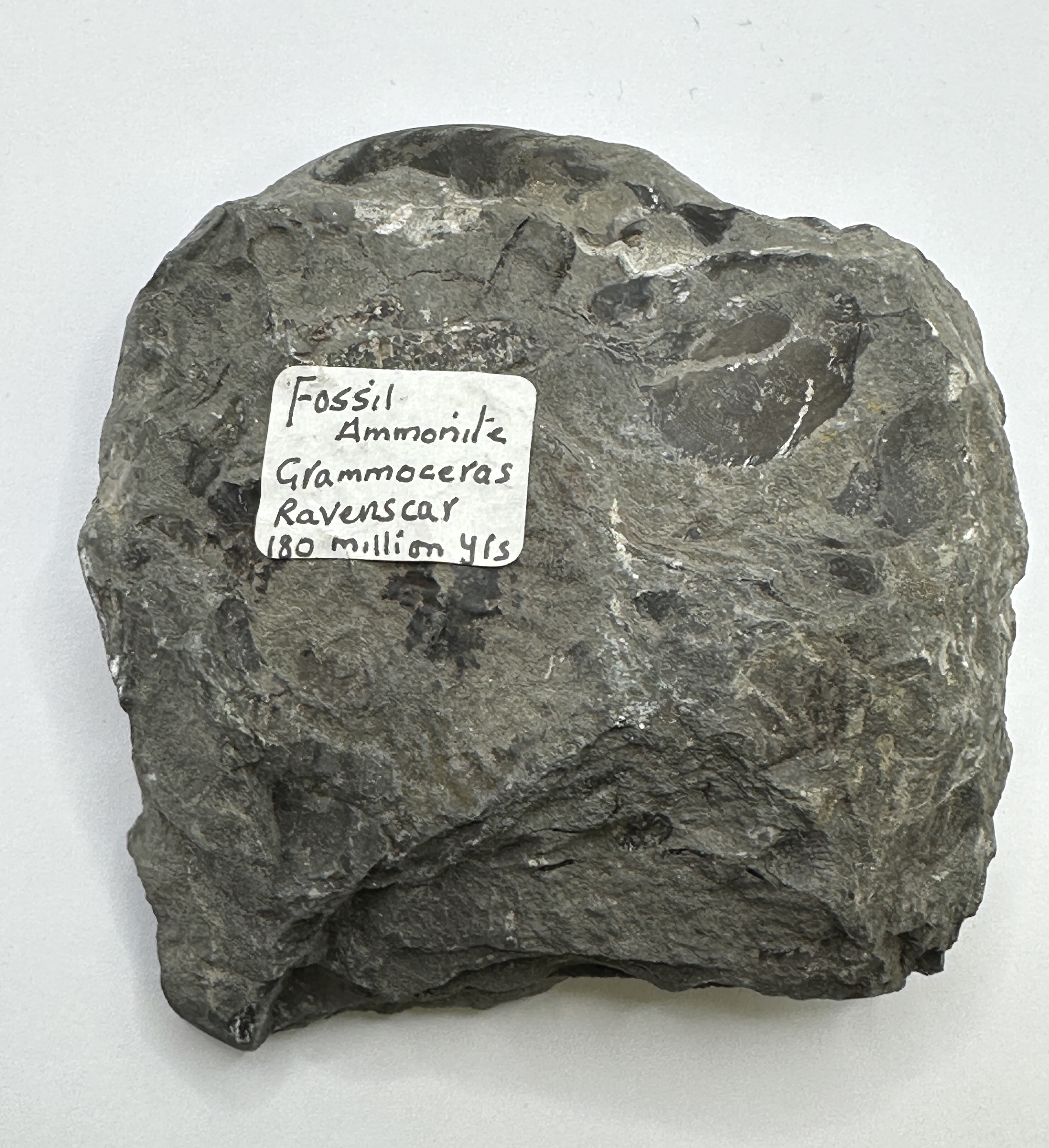 Two fossilised Grammoceras ammonites preserved within a dense grey sedimentary rock matrix. This specimen originates from Ravenscar, North Yorkshire, UK, and dates to the Toarcian stage of the Lower Jurassic period, approximately 180 million years ago. The upper right specimen displays well-defined, slightly curved ribbing characteristic of the genus, while the lower left specimen is partially embedded, showing a clear impression of the coiled form. The matrix remains in its natural, unpolished state with irregular edges. The specimen is presented on a clear acrylic display stand. A white paper label is adhered to the reverse of the matrix with handwritten black ink text reading Fossil Ammonite Grammoceras Ravenscar 180 million yrs.