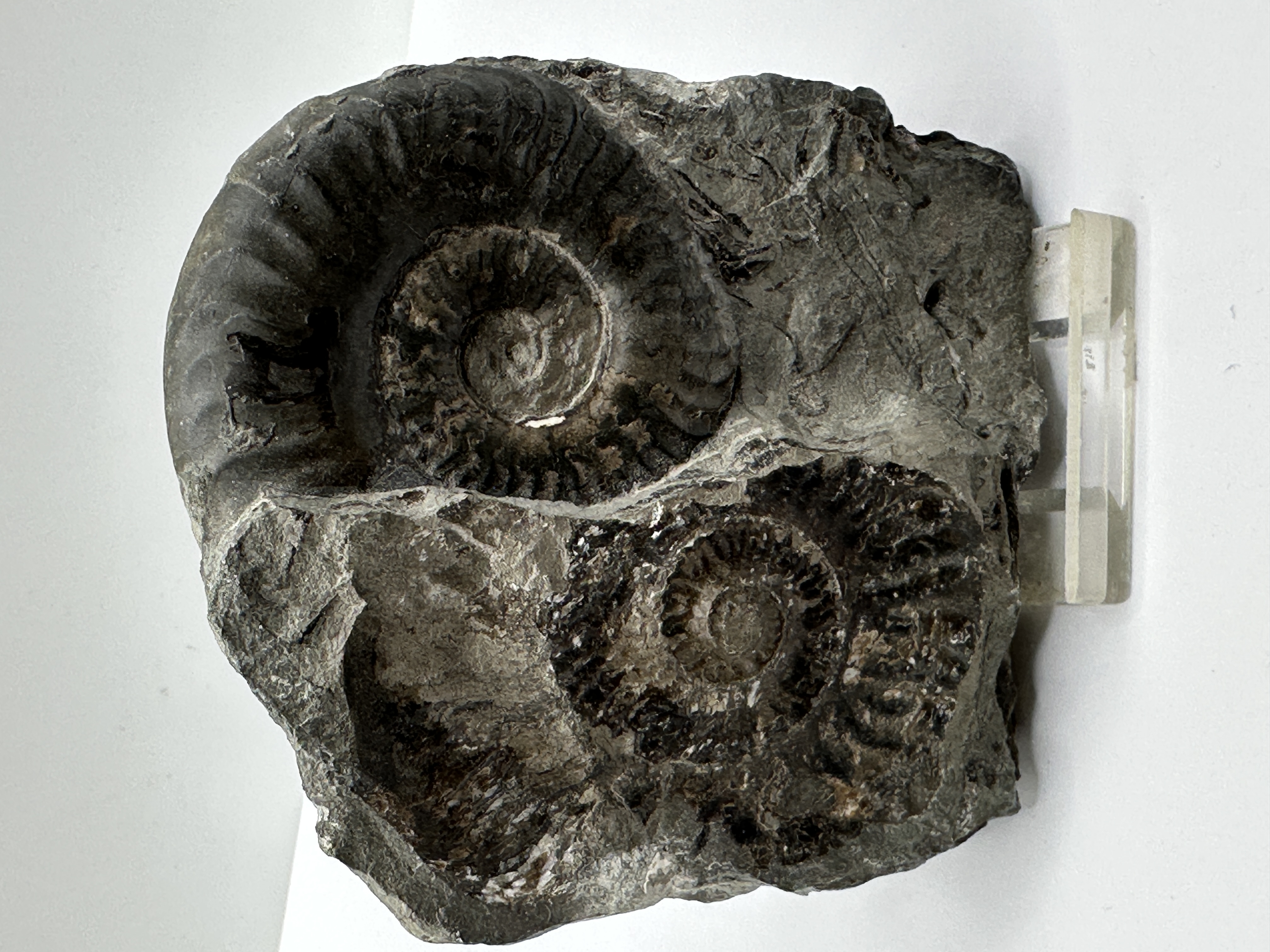 The specimen is stable and well-preserved within the host rock. There is natural surface wear and minor fracturing to the matrix consistent with fossils collected from coastal localities. The ammonite details remain clear and well-defined.