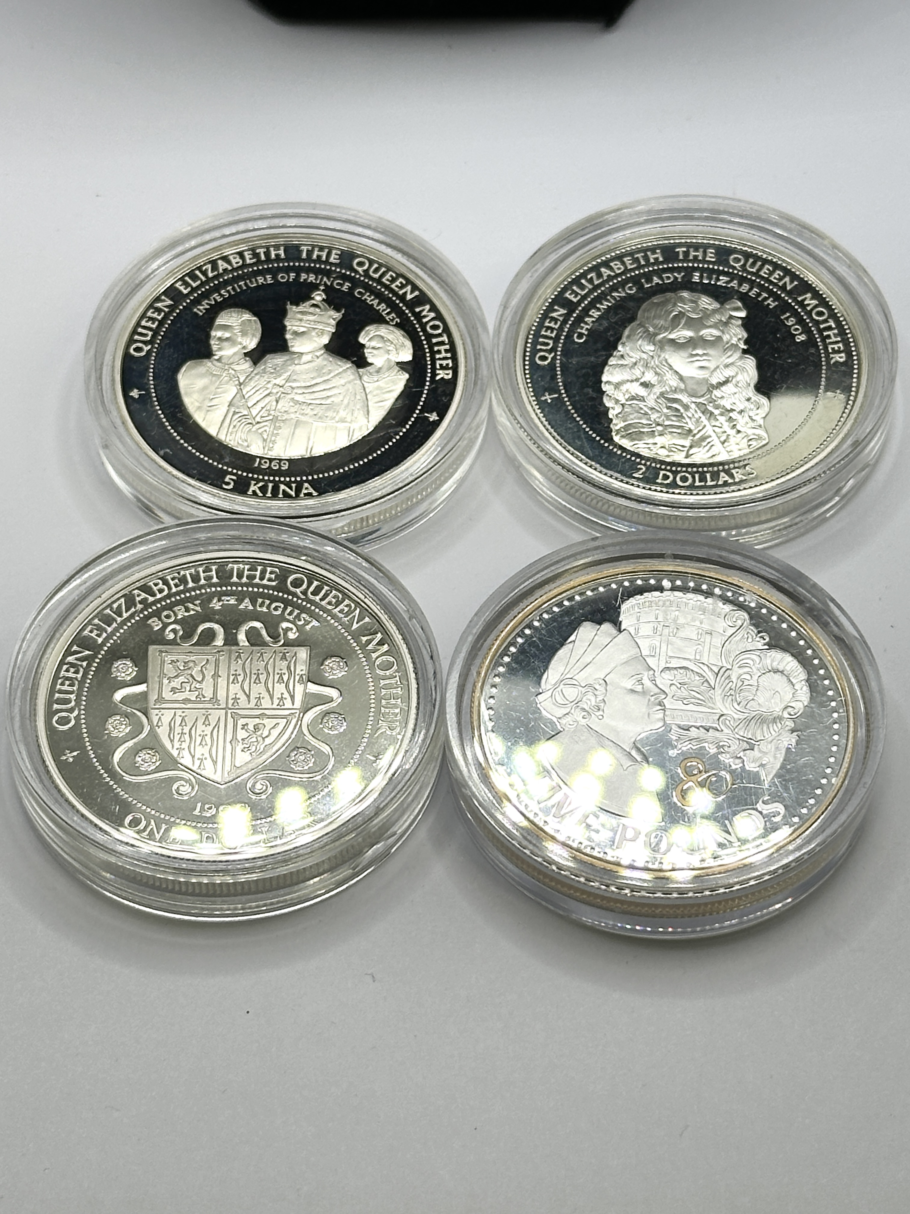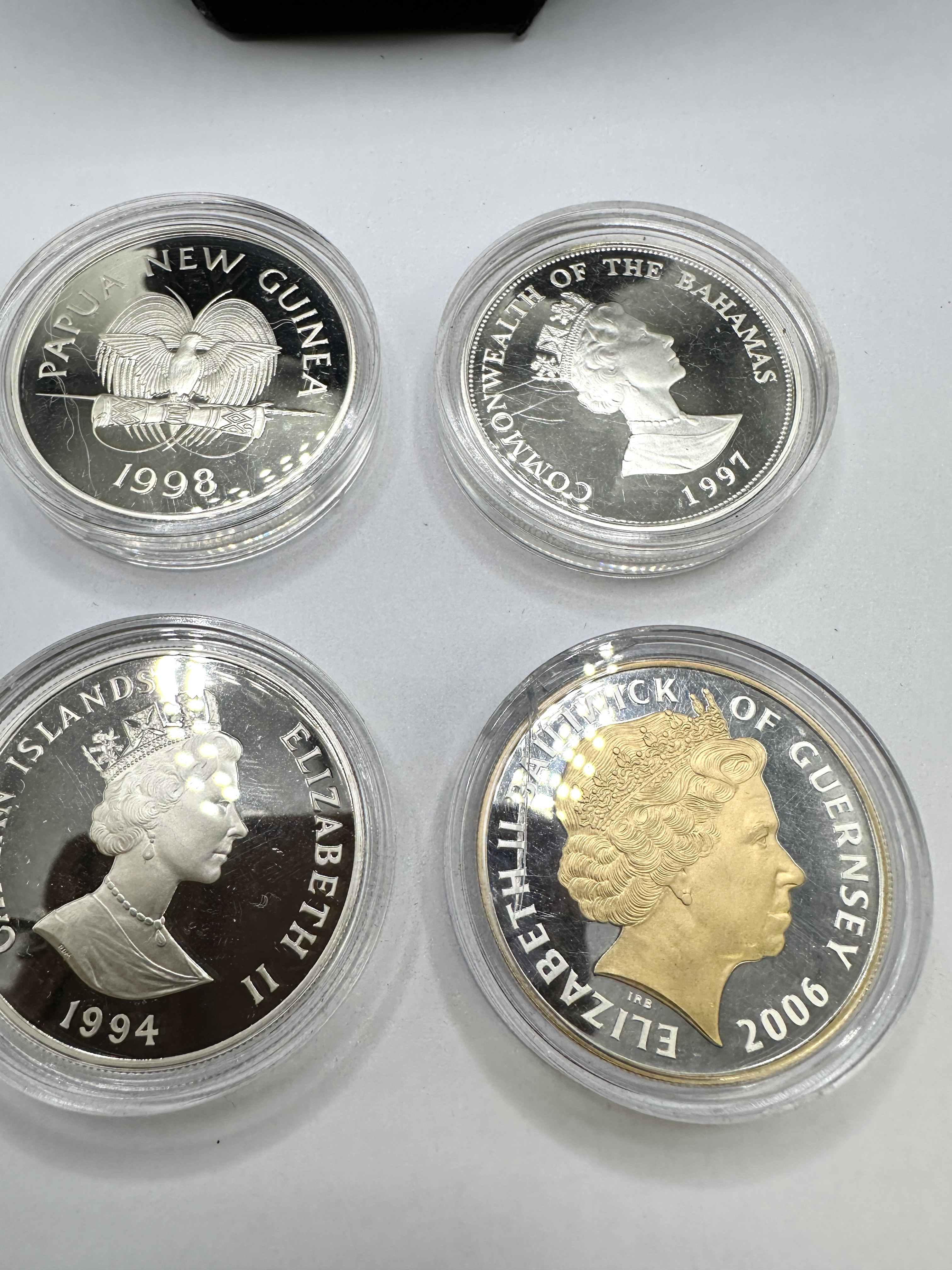 This collection of 925 silver commemorative coins comprises various issues from Papua New Guinea, the Commonwealth of The Bahamas, Solomon Islands, and the Bailiwick of Guernsey. The group includes a Papua New Guinea 1998 5 Kina featuring a national emblem obverse and a 1969 investiture reverse. The Commonwealth of The Bahamas 1997 2 Dollars features a Raphael Maklouf obverse and a 1908 portrait reverse. The Solomon Islands 1994 One Dollar features a Raphael Maklouf obverse and a coat of arms reverse. The Bailiwick of Guernsey 2006 Five Pounds features a selectively gilded Ian Rank-Broadley obverse and a portrait of Queen Elizabeth The Queen Mother on the reverse. All coins are struck with a proof finish, characterised by mirrored fields and frosted devices, and are housed in individual protective plastic capsules.