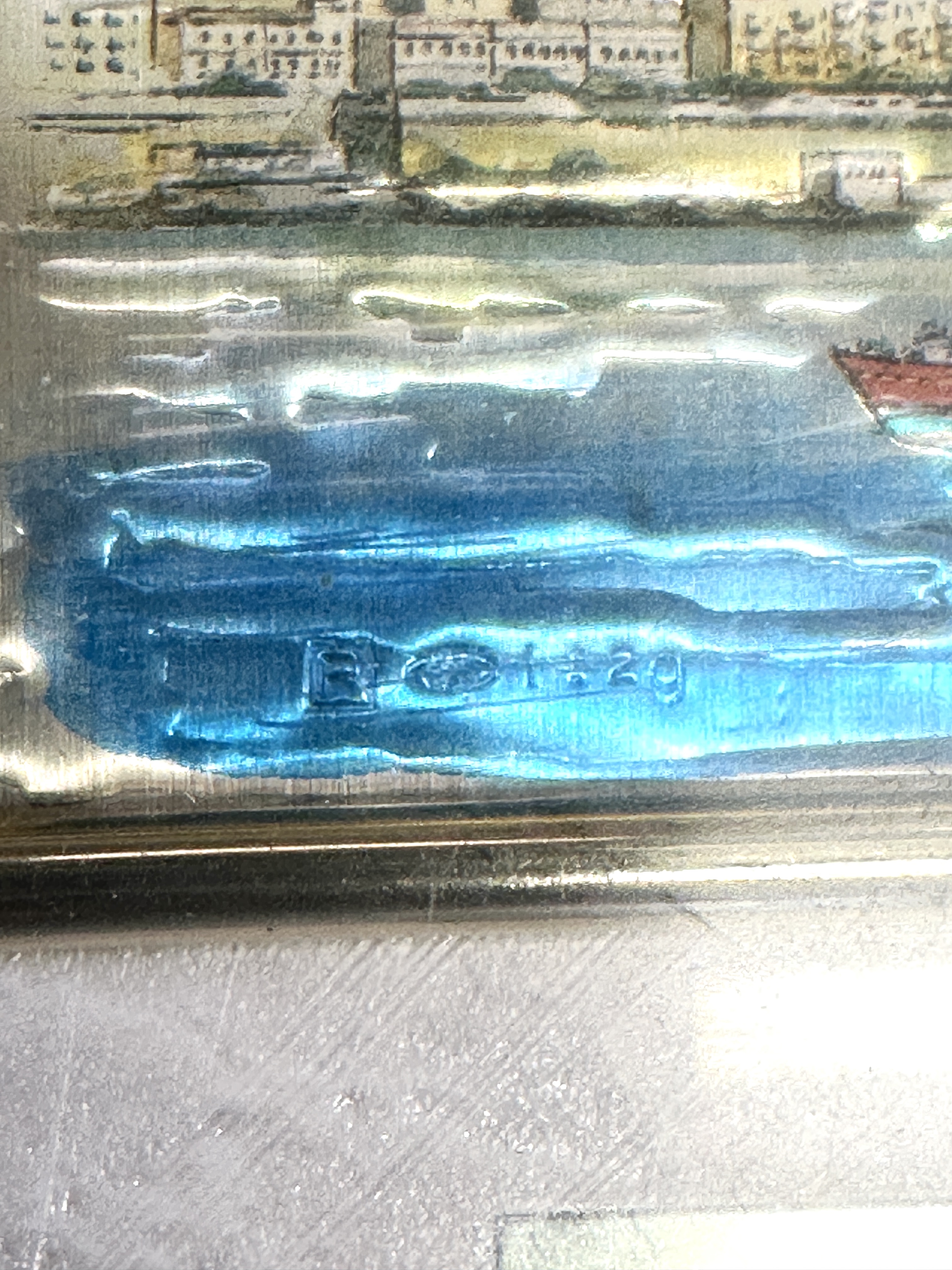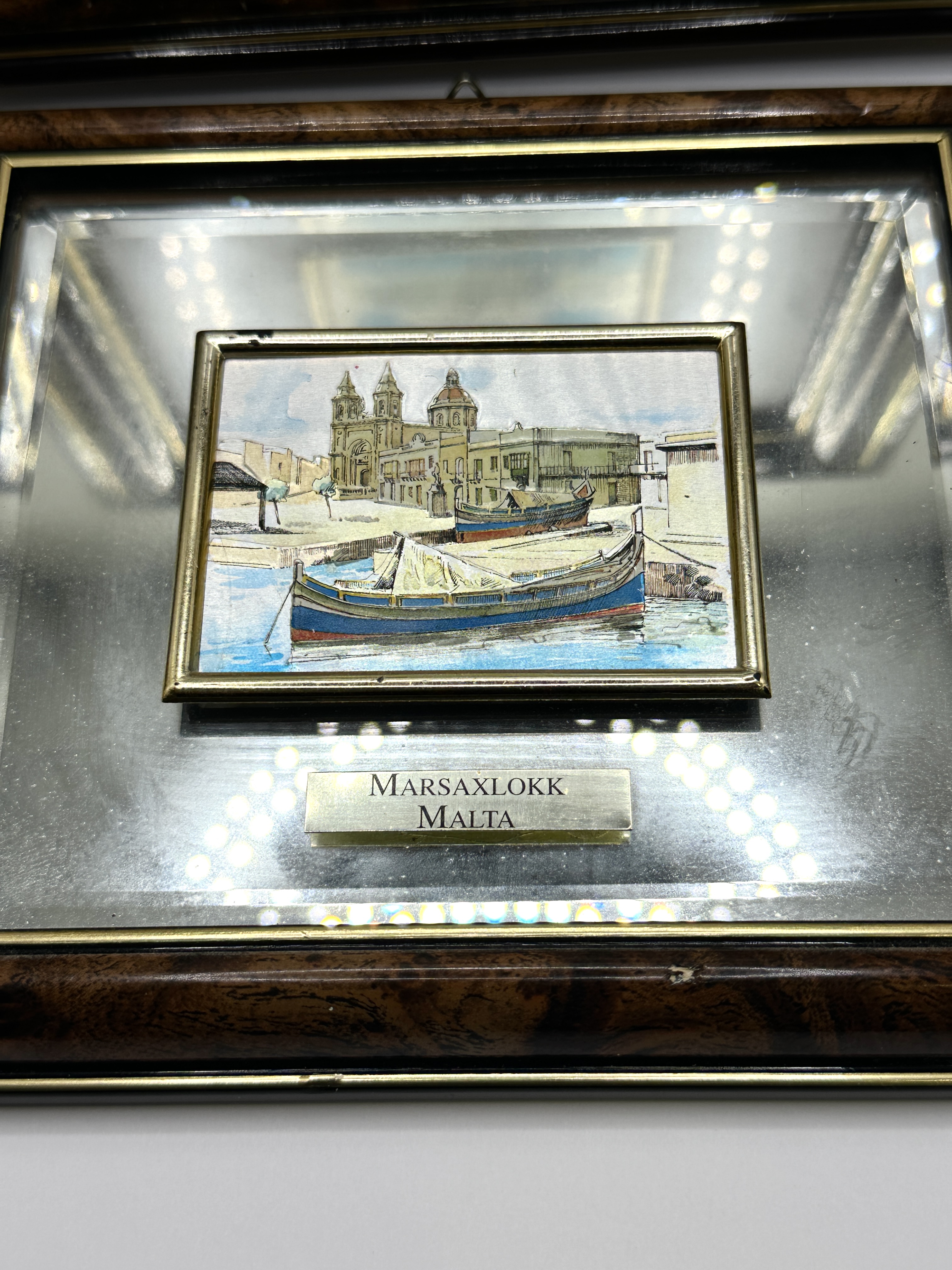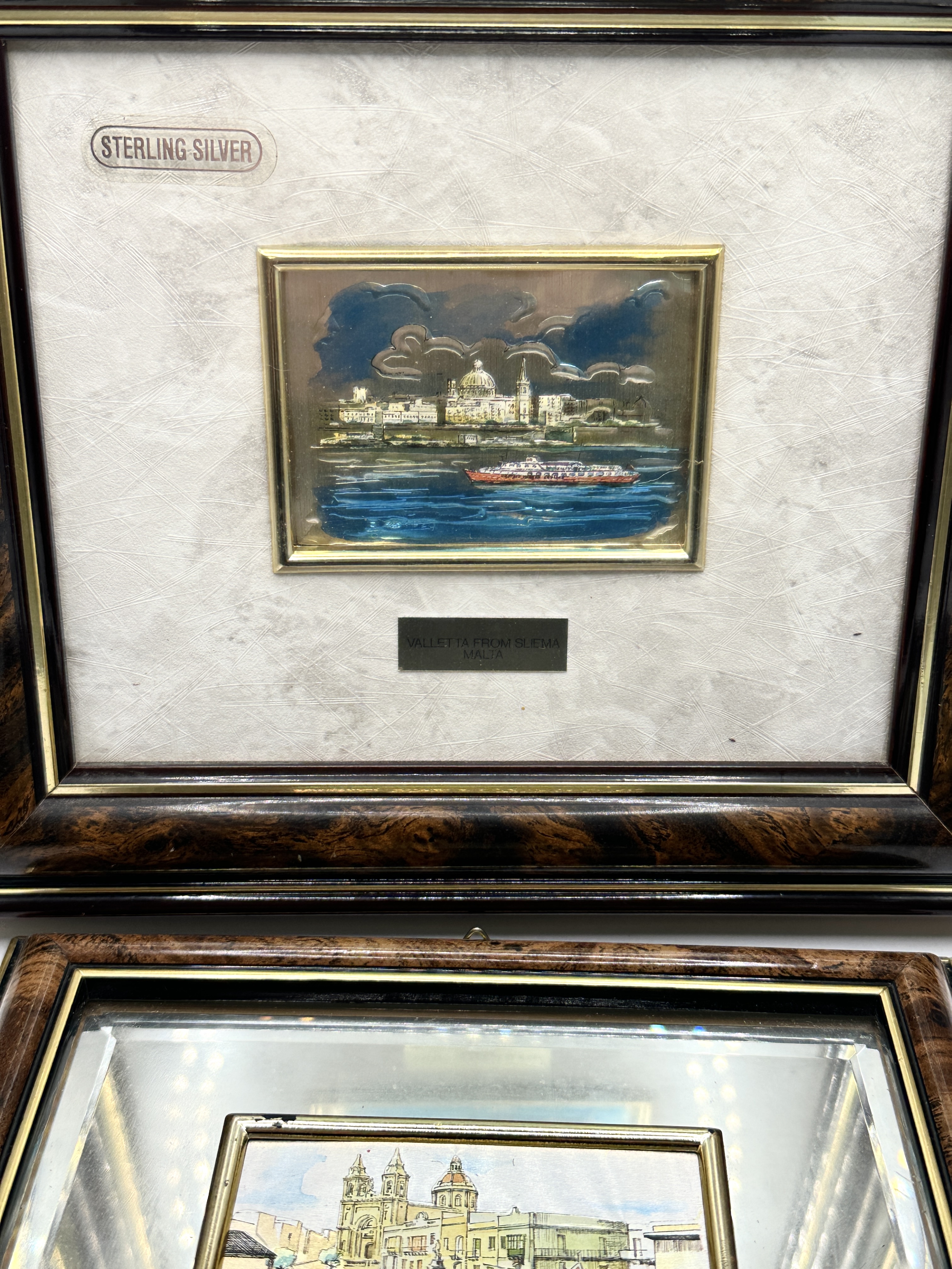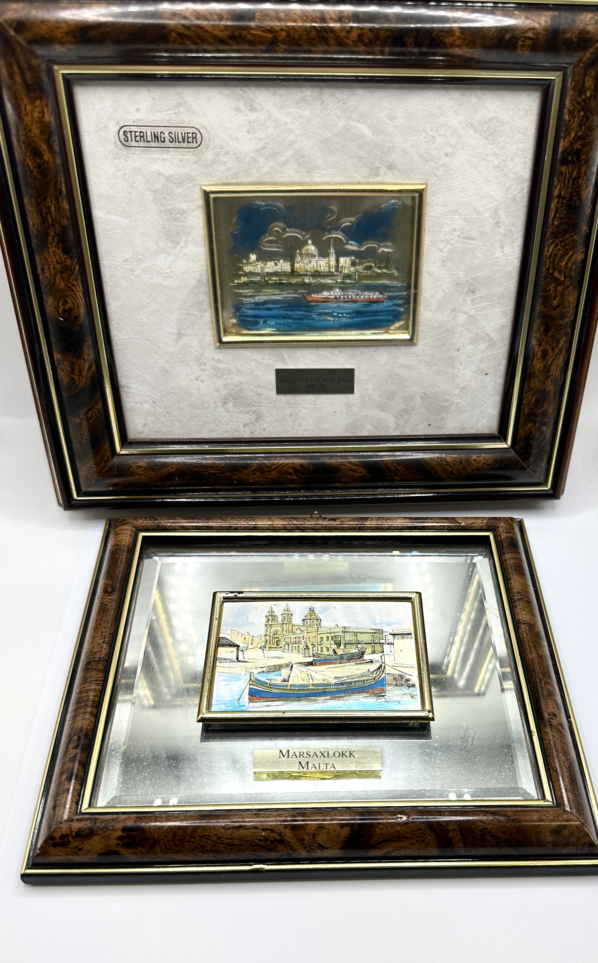 A pair of framed miniature bas-relief pictures crafted from 925 silver, depicting iconic scenes from Malta. The first piece, titled Valletta from Sliema, illustrates the city skyline featuring the dome of the Basilica of Our Lady of Mount Carmel and a ferry in the foreground. The second piece, titled Marsaxlokk, depicts the traditional fishing village with Luzzu boats in the harbour and the Parish Church in the background. Both scenes are worked in relief with polychrome accents to the sea, sky, and architectural details. The Valletta picture bears embossed hallmarks including a rectangular maker’s mark, an oval mark containing a Maltese cross, and the numerals 925 indicating silver fineness. A sticker on the mount also denotes Sterling Silver. The Valletta scene is set within an off-white textured mount with a metal title plaque, while the Marsaxlokk scene is set within a mirrored mount with a matching title plaque. Both items are housed in matching burr wood-effect frames with gilt inner slips.