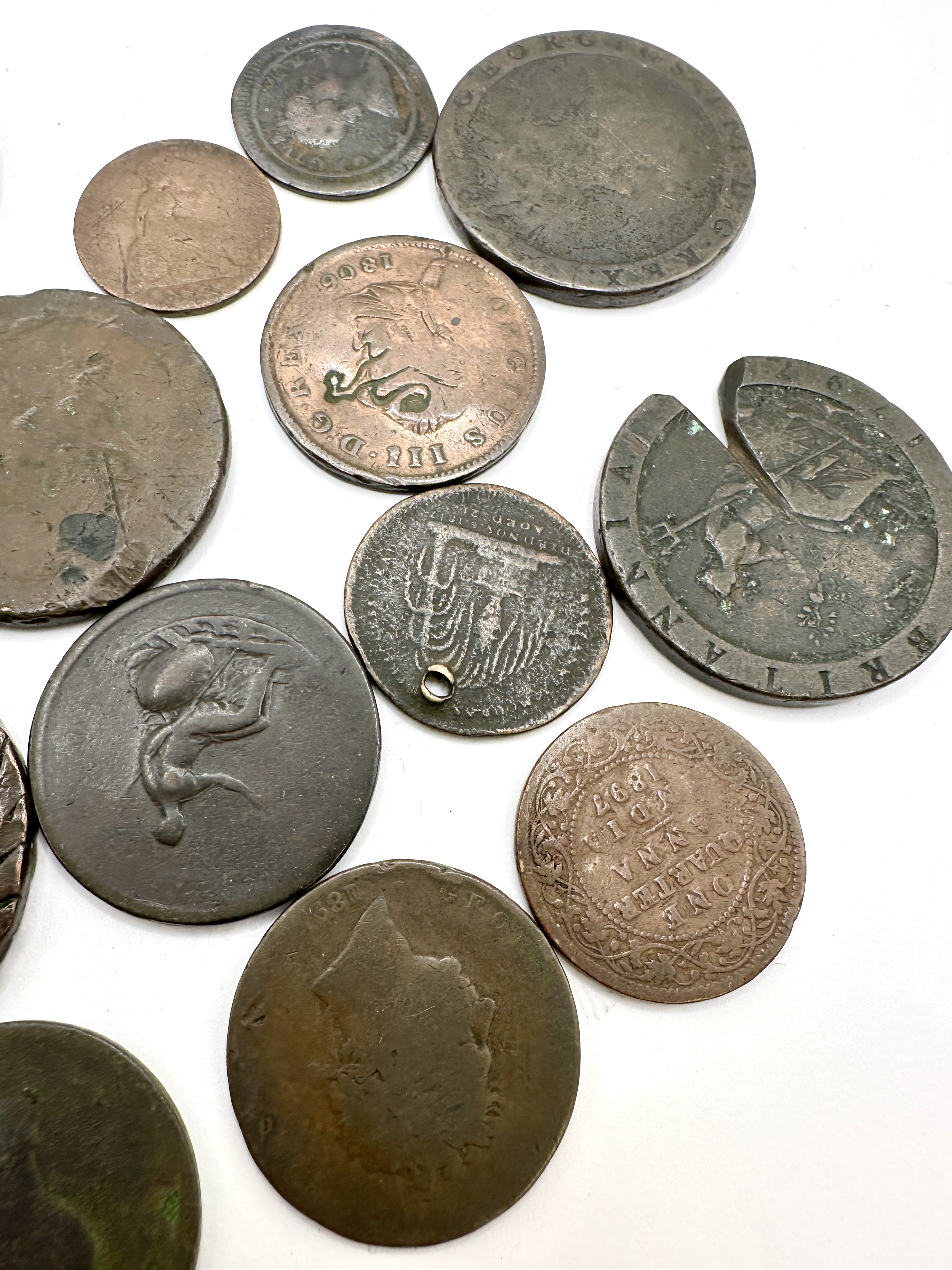 A collection of copper-alloy coins and tokens, primarily UK and British Colonial issues. The group includes a British India one-quarter anna dated 1887, featuring a floral wreath reverse. Included is a George III copper coin dated 1806 with a laureate bust obverse. The lot contains a Princess Charlotte memorial type token, dated 6 November 1817, with a suspension hole. Several George III copper issues are present, including a Cartwheel type coin with a significant triangular segment removed and others featuring a Britannia reverse. One piece features an ornamental notched border and a worn central portrait. Visible legends on multiple items include GEORGIUS III D G REX. The 1797 Cartwheel issues represent the first British coins produced by steam-powered machinery at the Soho Mint.