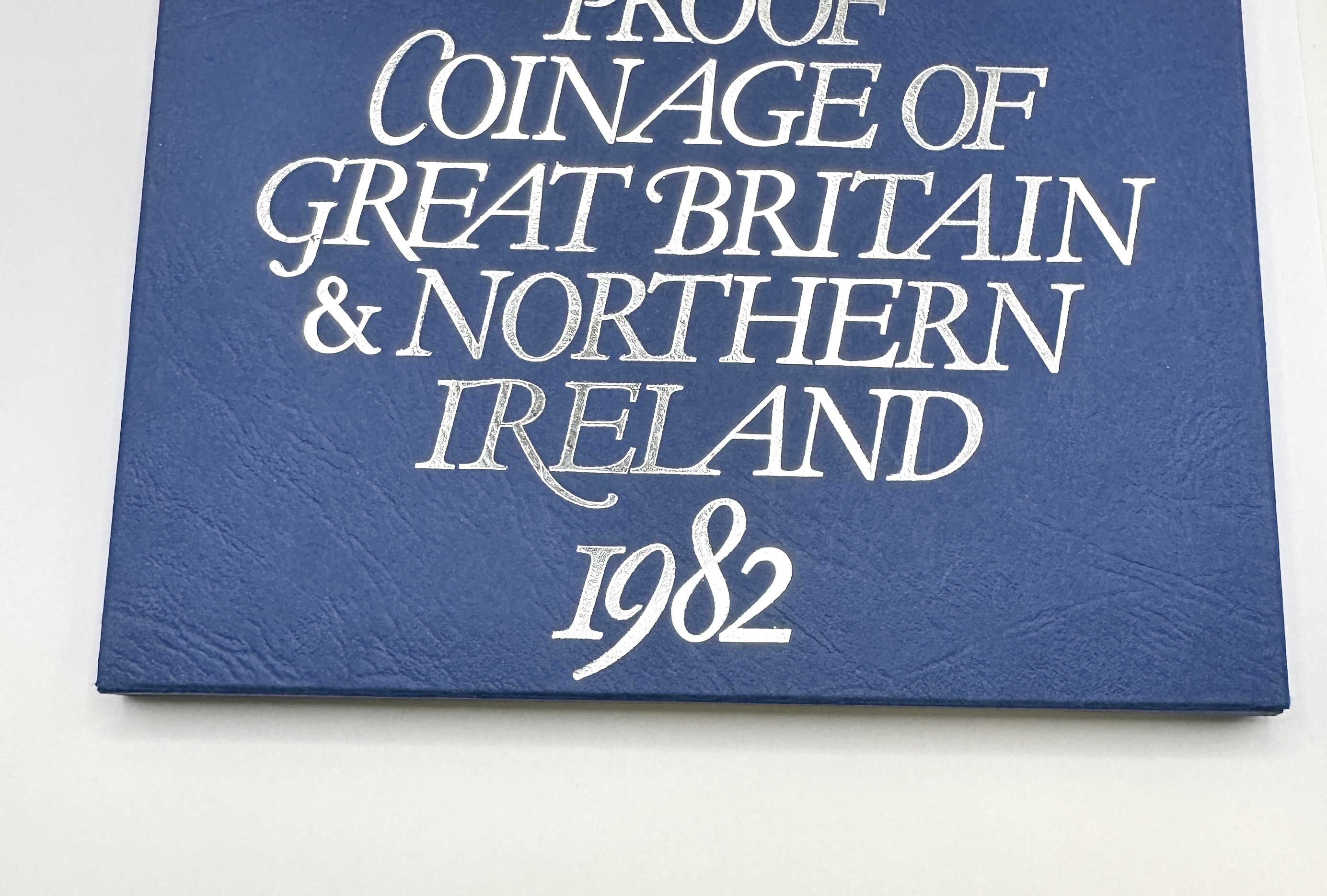 A Royal Mint 1982 United Kingdom annual proof coin set. The item consists of a blue textured leatherette presentation folder featuring silver-coloured foil lettering on the front cover. The inscription reads PROOF COINAGE OF GREAT BRITAIN & NORTHERN IRELAND 1982. This annual set was issued by the Royal Mint and contains the circulating denominations of the year struck to proof quality. This specific year marks the introduction of the twenty pence coin to the UK currency system.