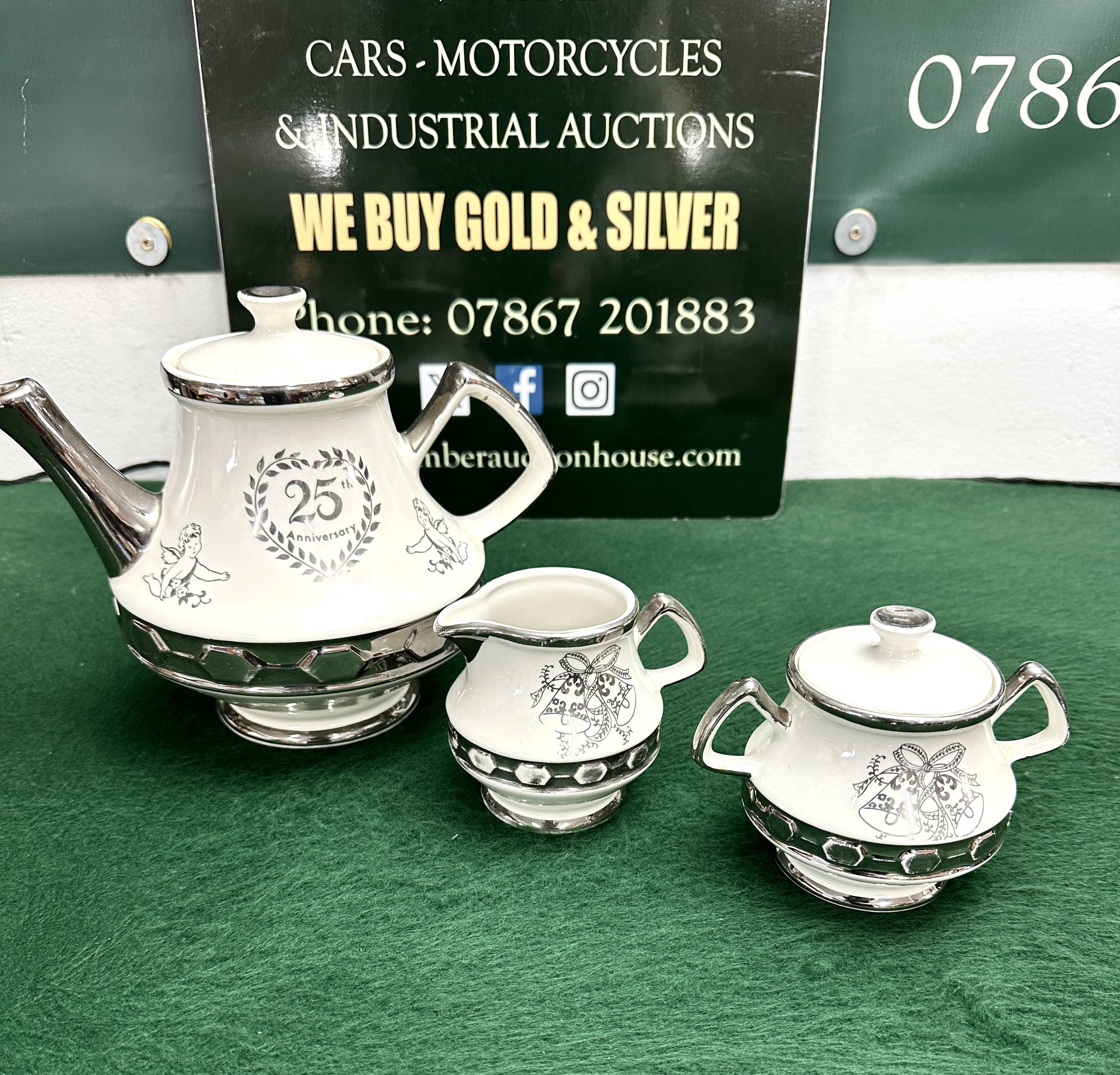 A three-piece ceramic tea set manufactured by Gibson in Staffordshire, England, for the Taunton Vale Company. The set is constructed from glazed white earthenware and was produced to commemorate a 25th Silver Wedding Anniversary. The collection comprises a lidded teapot, a milk jug, and a lidded sugar bowl. The teapot is decorated with a silver-toned transfer print featuring a central laurel wreath containing the inscription 25th Anniversary, flanked by two cherubs. The milk jug and sugar bowl are decorated with silver-toned wedding bell motifs tied with ribbons. Each piece features a wide, silver-coloured luster band around the base with a raised honeycomb geometric pattern. The handles, spouts, rims, and lid finials are finished in matching silver-toned luster. The base of the cream jug bears a black printed mark featuring the words A TAUNTON VALE COMPANY in a semi-circle above a crown symbol, with a banner containing the name GIBSON followed by the words STAFFORDSHIRE ENGLAND.