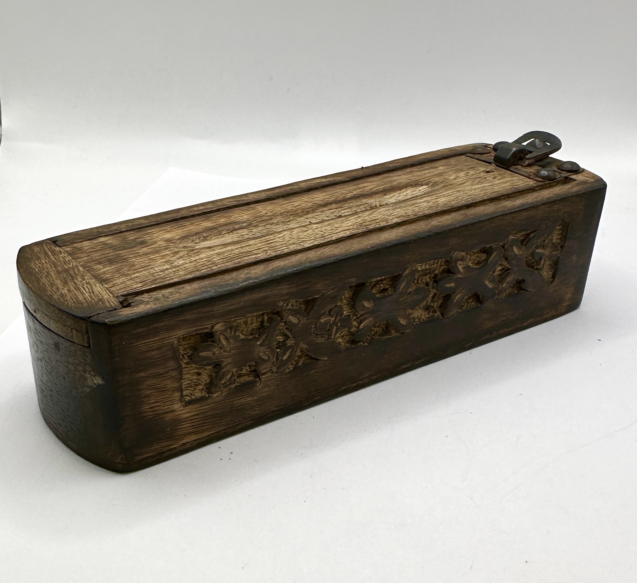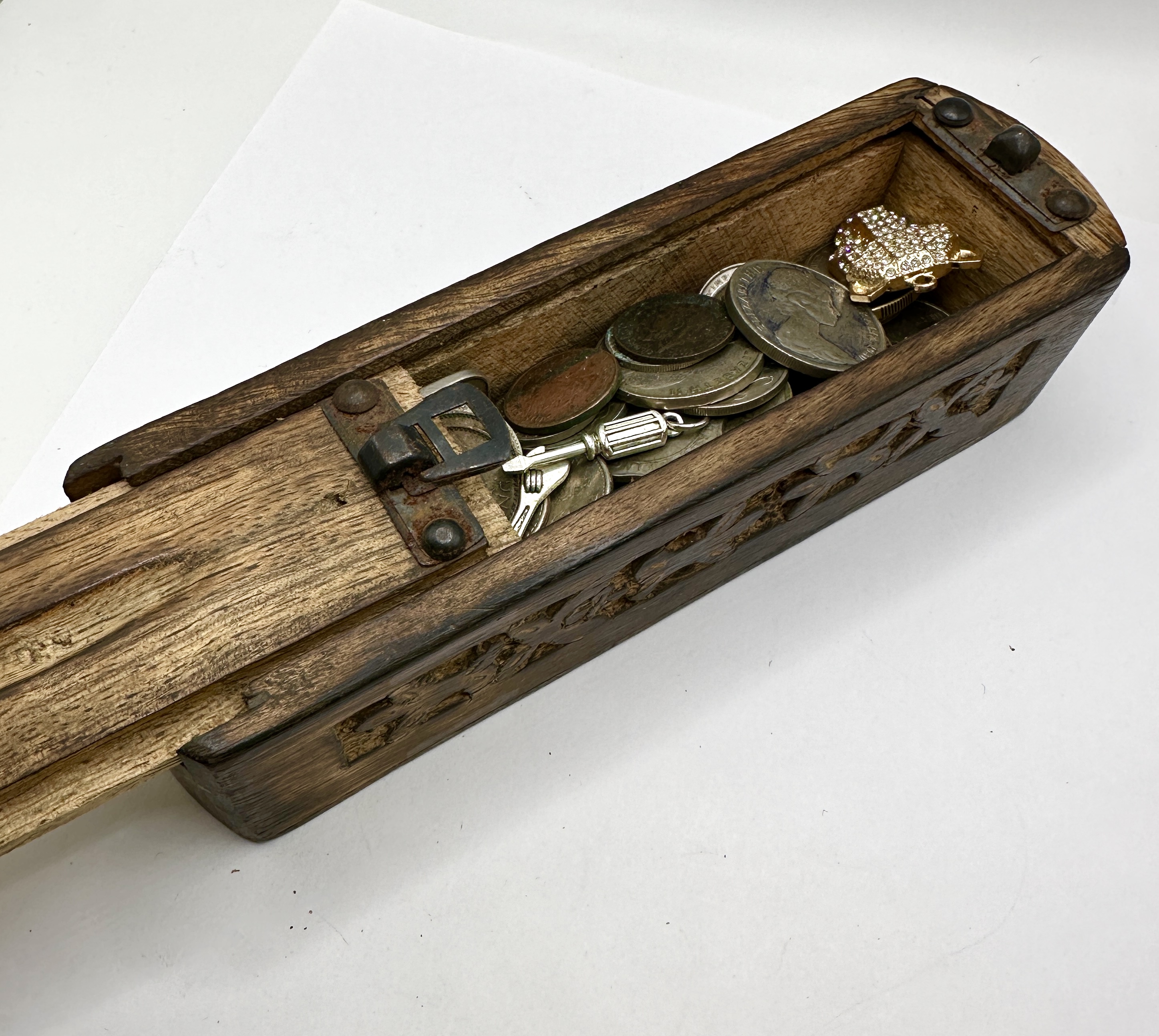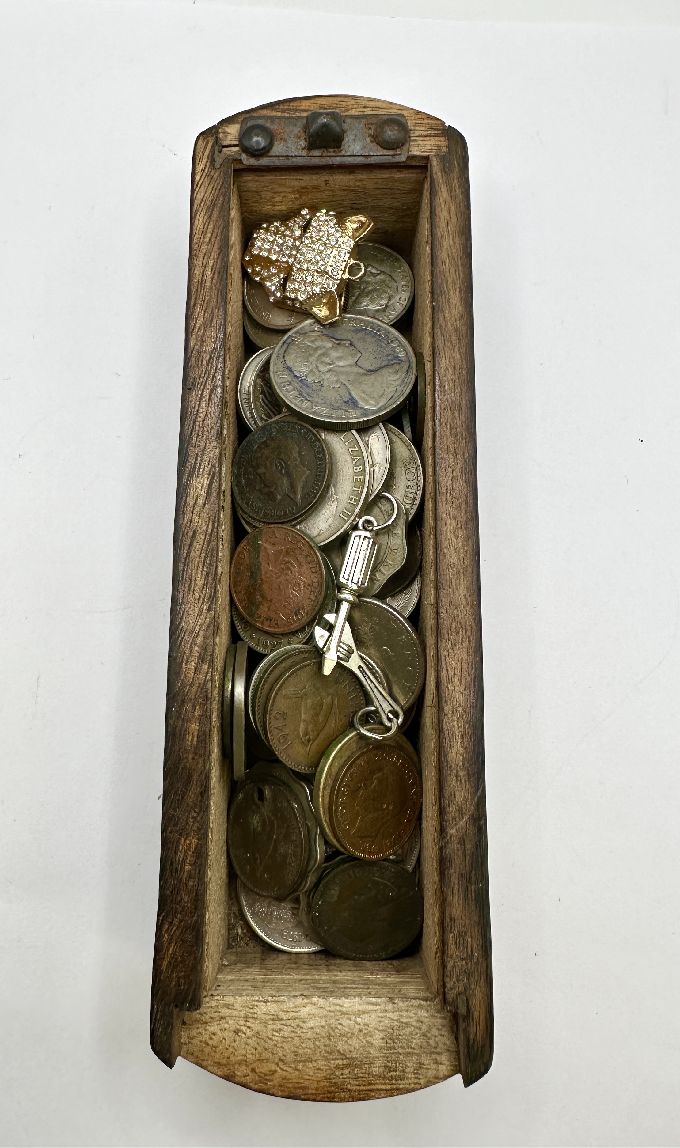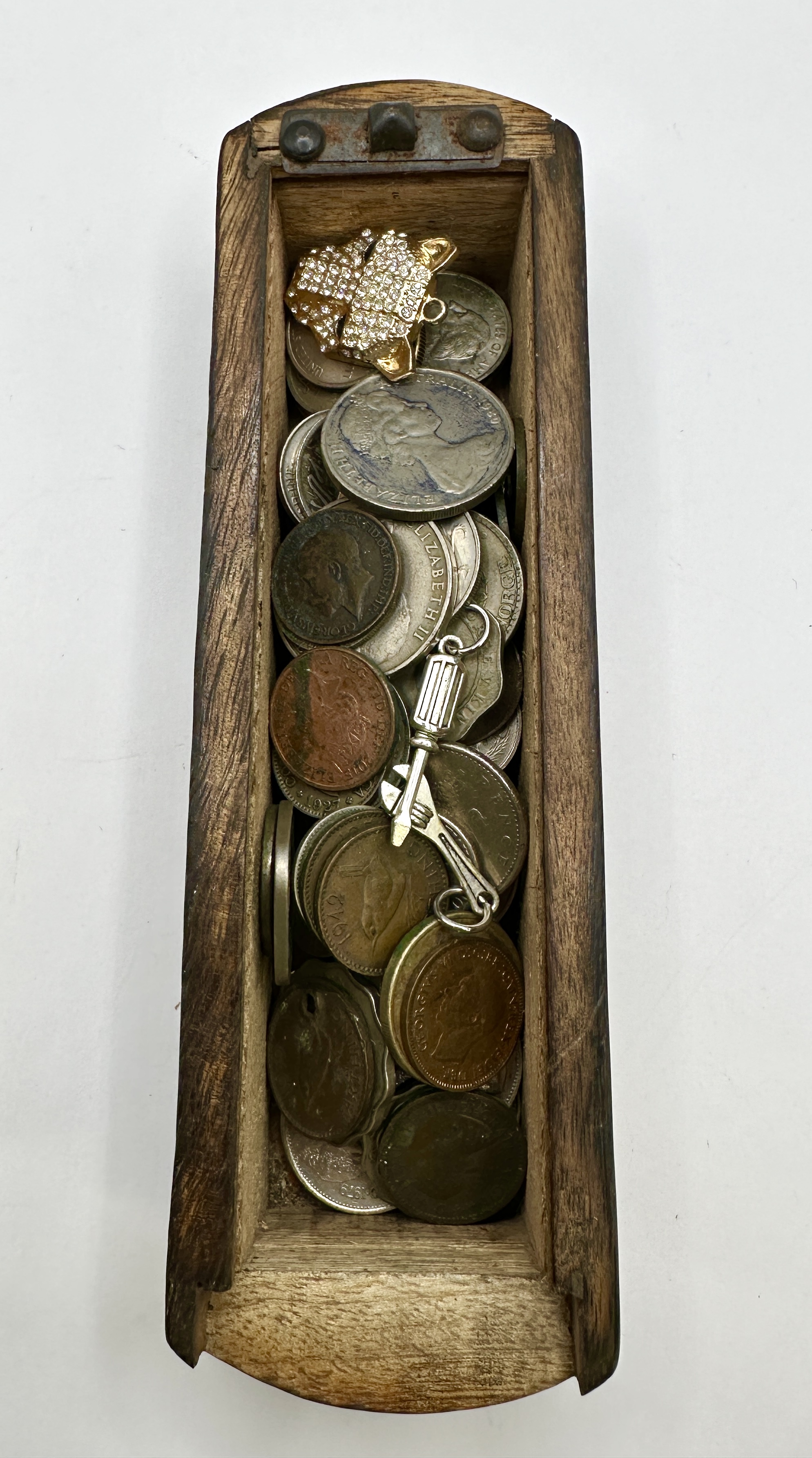 A collection of numismatic items and small jewellery pieces presented within a rectangular carved wooden box. The box features a sliding lid secured by a patinated metal latch and is decorated with a carved foliate pattern along the sides. The numismatic portion of the lot includes various British and Commonwealth coins in copper-toned and silver-toned metals. Identifiable pieces include a 1927 UK penny depicting a seated Britannia, a 1942 Australian shilling featuring a ram, and a 1980 Australian coin. Multiple coins bear the effigy of King George VI. Accompanying the coins are two small items: a gold-toned leopard-head pin pavé-set with clear stones and a silver-toned charm fashioned as an adjustable wrench.