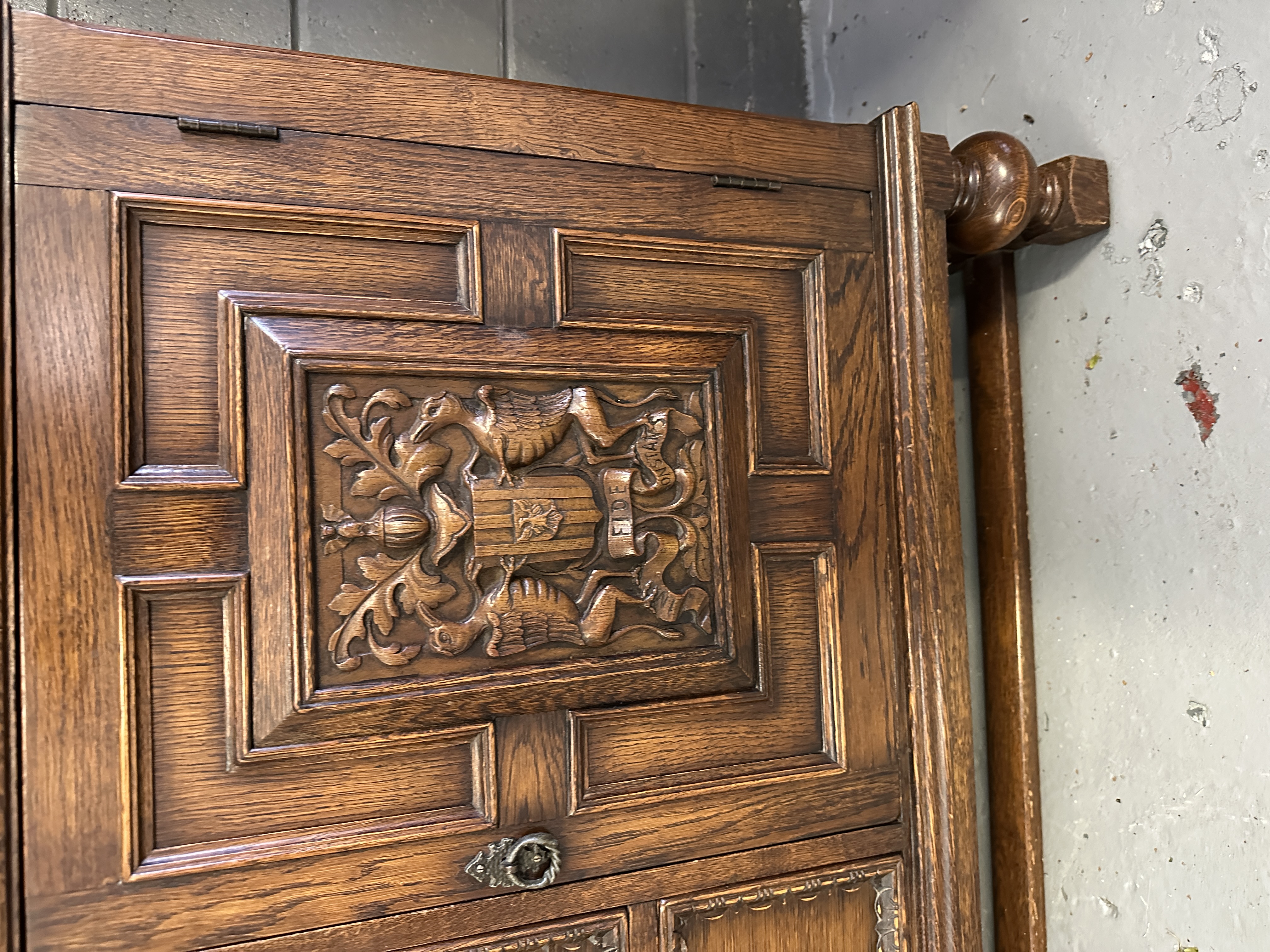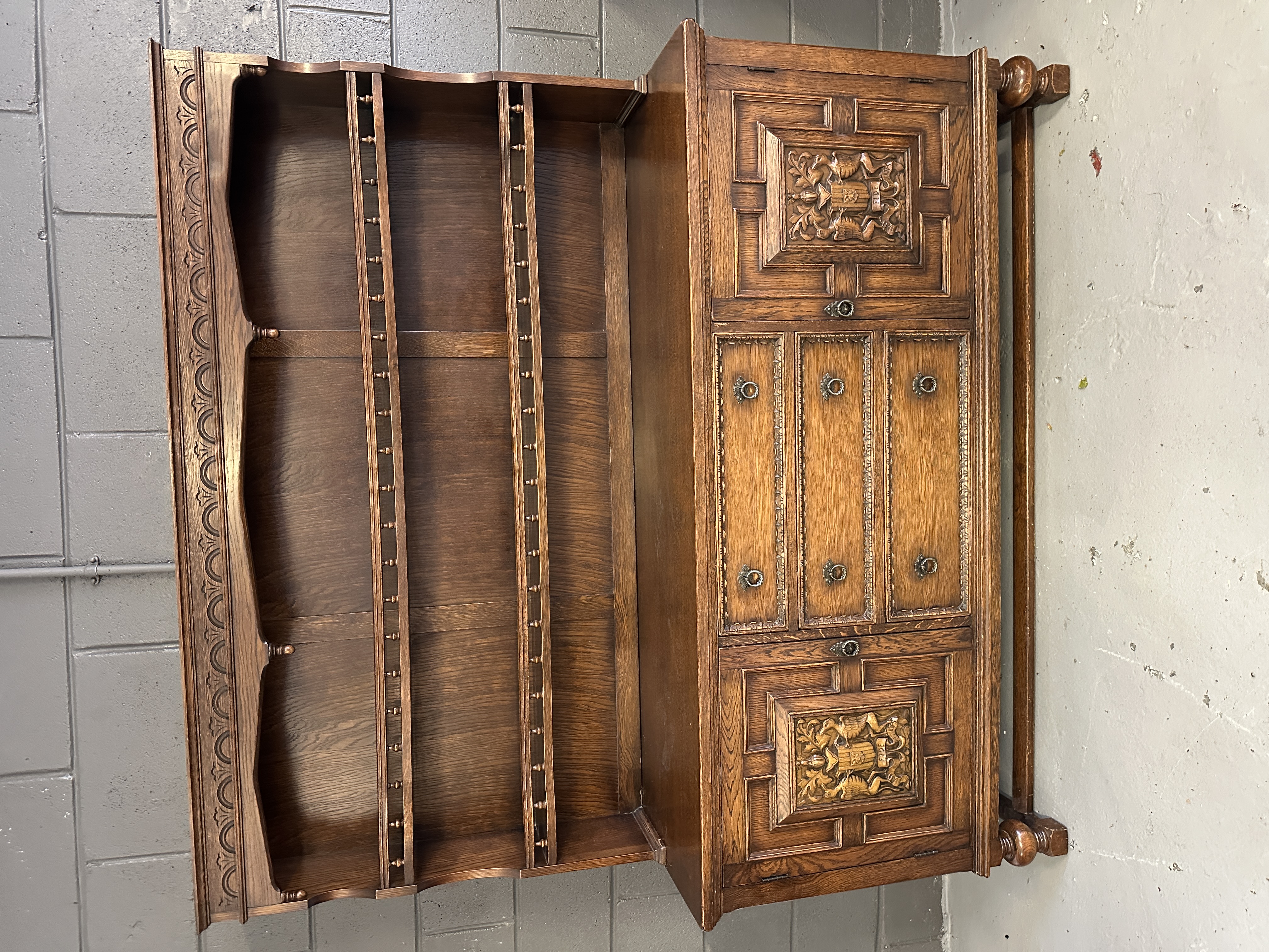 A carved oak dresser and plate rack in the Jacobean Revival style. The tiered upper section features three shelves beneath a carved lunette frieze. The base comprises three central drawers flanked by two cupboard doors. The doors are decorated with deeply carved relief panels depicting heraldic motifs, including a central shield and mythical creatures. A carved banner bears the Latin motto Fide Constans. The unit is finished with geometric strapwork moulding and is supported by turned bun feet joined by a stretcher. The drawers are fitted with metal ring-pull hardware. The piece is primarily of oak construction. Also included is a collection of novelty ceramic teapots, including one modelled as a fireplace with a cat and another as a sofa with figures.