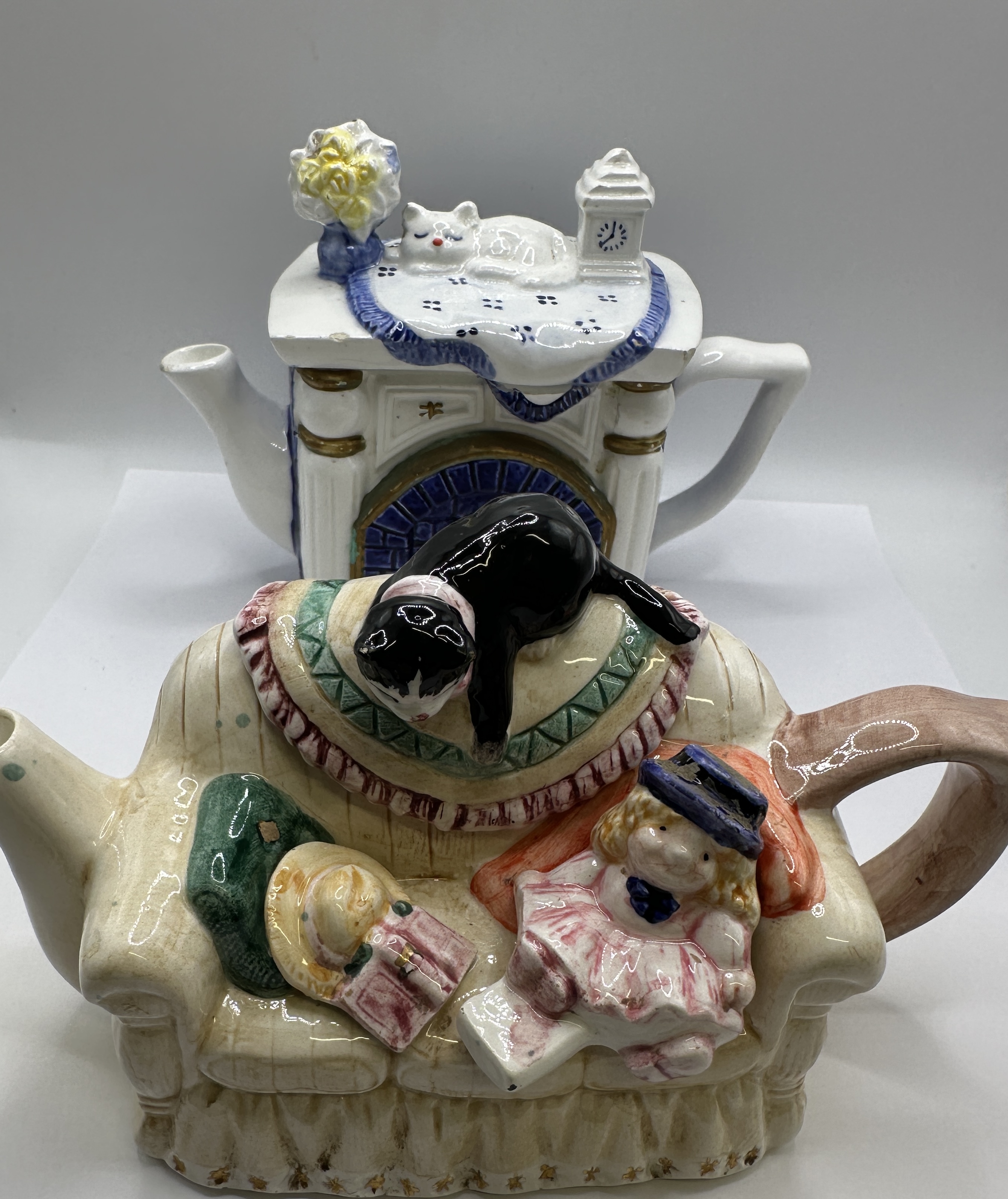 The dresser is structurally sound with minor scuffs and surface wear to the finish consistent with age and use. The ceramic teapots show minor surface marks and wear.