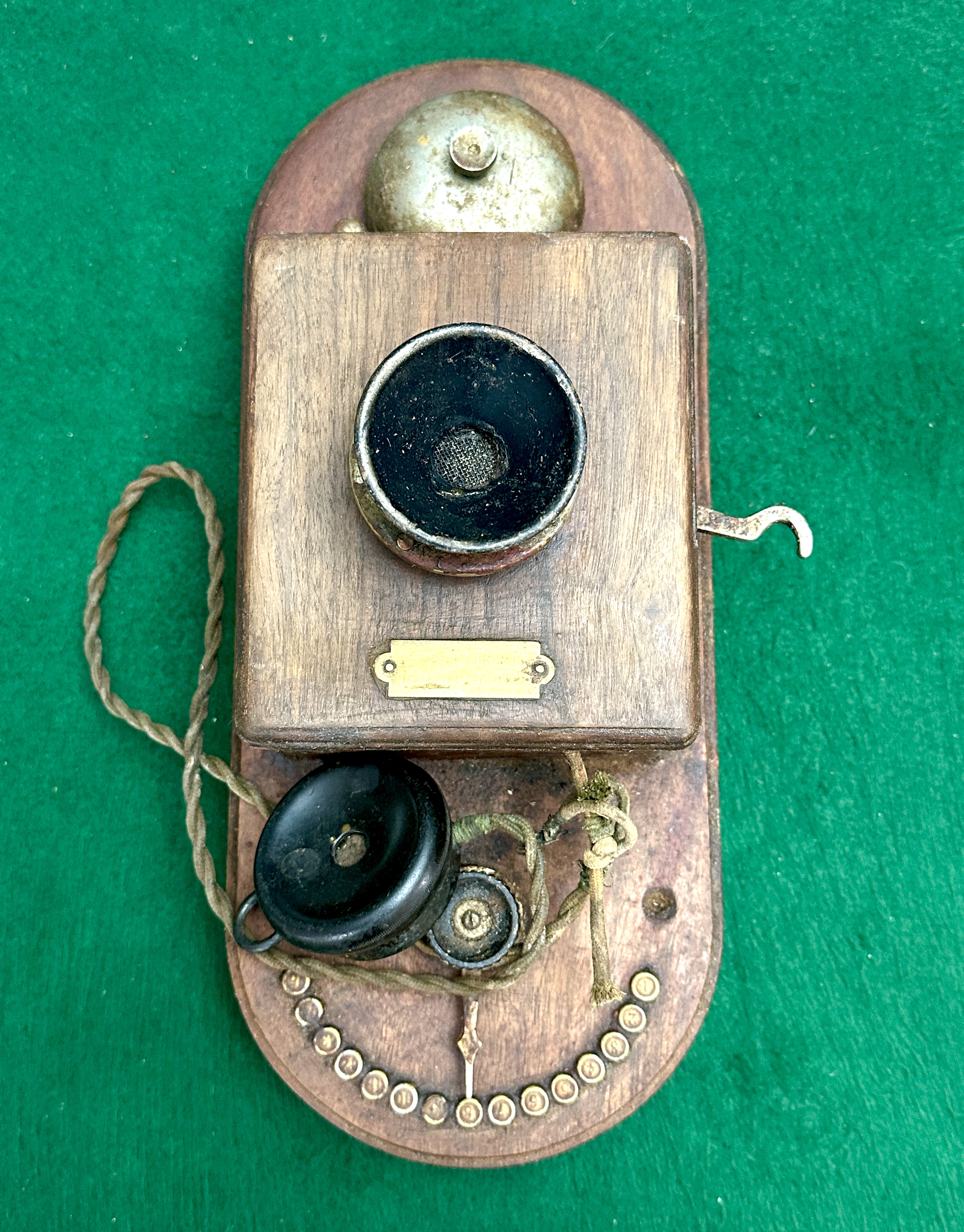 The wooden cabinet and base show significant age-related wear, including surface scuffs, scratches, and a buildup of grime. The metal components, specifically the brass bell and selector studs, exhibit tarnish and oxidation. One of the selector studs is missing or damaged. The braided fabric cord for the receiver is severely frayed and partially detached from the main unit. This item is offered as a historical artefact; the internal wiring is aged, and the working status is unknown and untested.