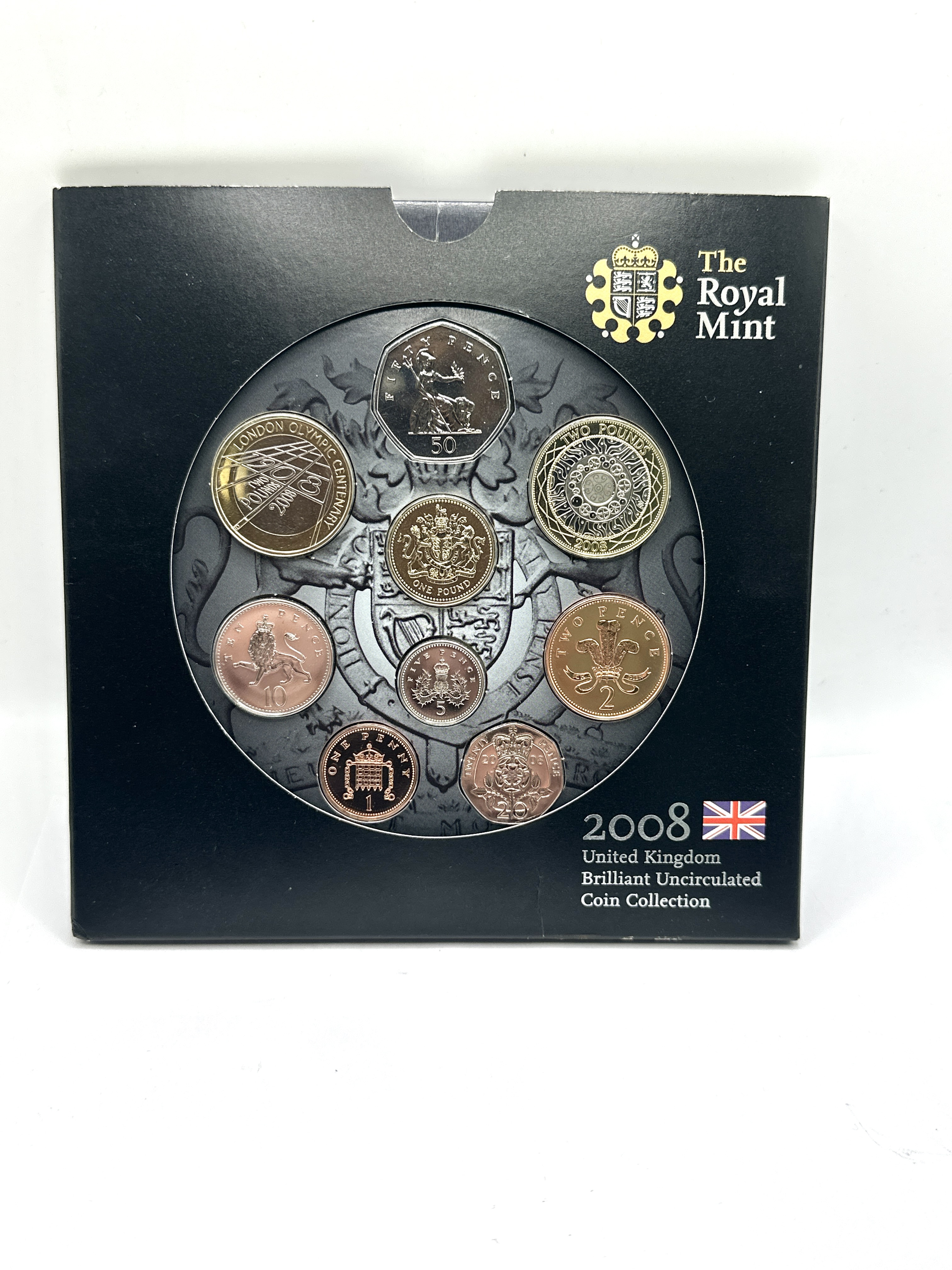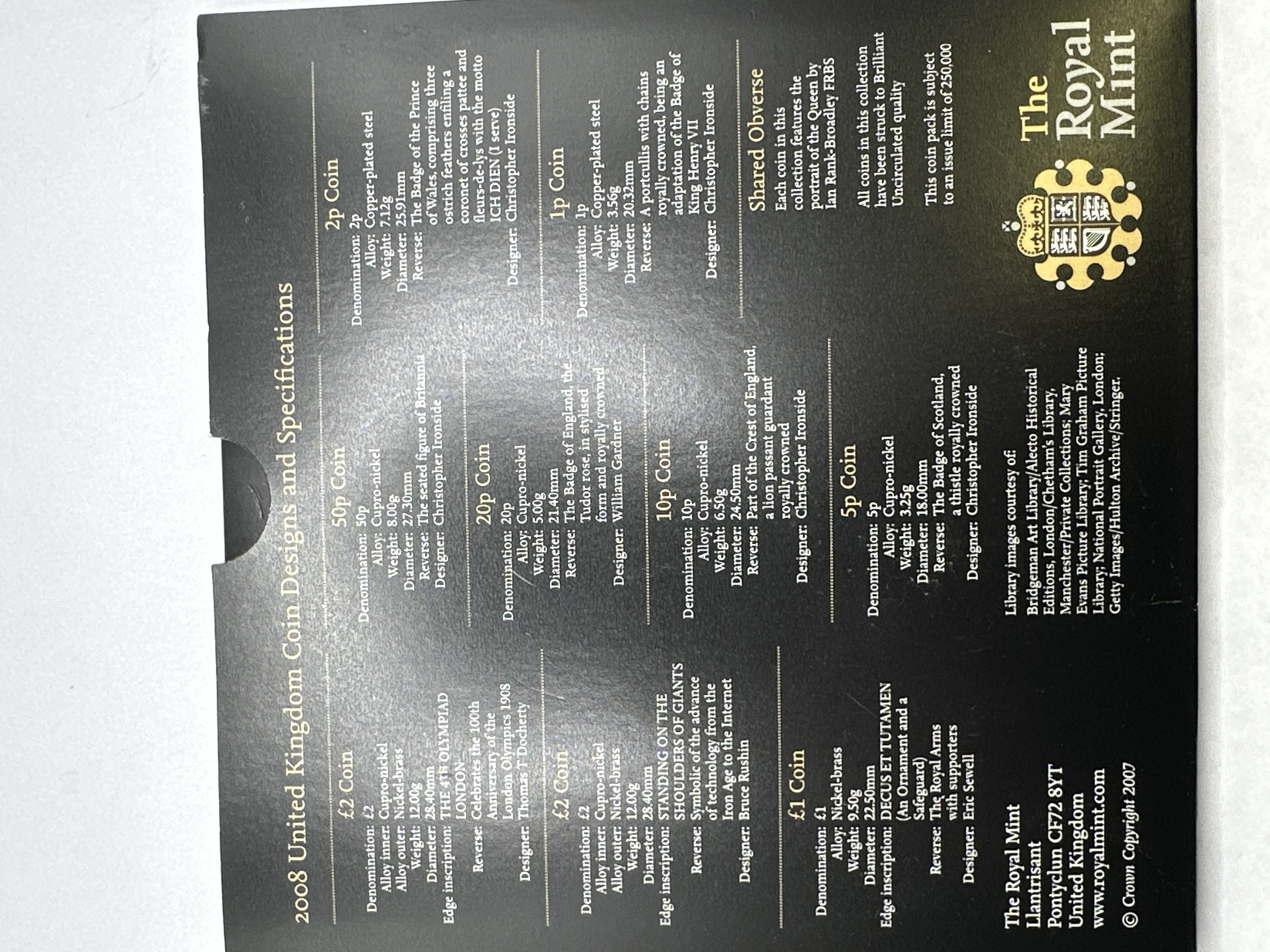 A collection of 2008 United Kingdom decimal coinage issued by The Royal Mint, presented in the original black card display folder. The set comprises coins struck to Brilliant Uncirculated standard. Included are two different two pound coins: one commemorating the centenary of the 1908 London Olympic Games and the standard Standing on the Shoulders of Giants design. The collection also contains the one pound coin featuring the Royal Arms, and the Emblems of Britain series for the fifty pence, twenty pence, ten pence, five pence, two pence, and one penny denominations. The reverse of the folder provides technical specifications for each coin, including alloy compositions of cupro-nickel, nickel-brass, and copper-plated steel, along with diameters, weights, and designer attributions. The folder bears The Royal Mint logo and a 2007 crown copyright. This coin pack is subject to an issue limit of 250,000.