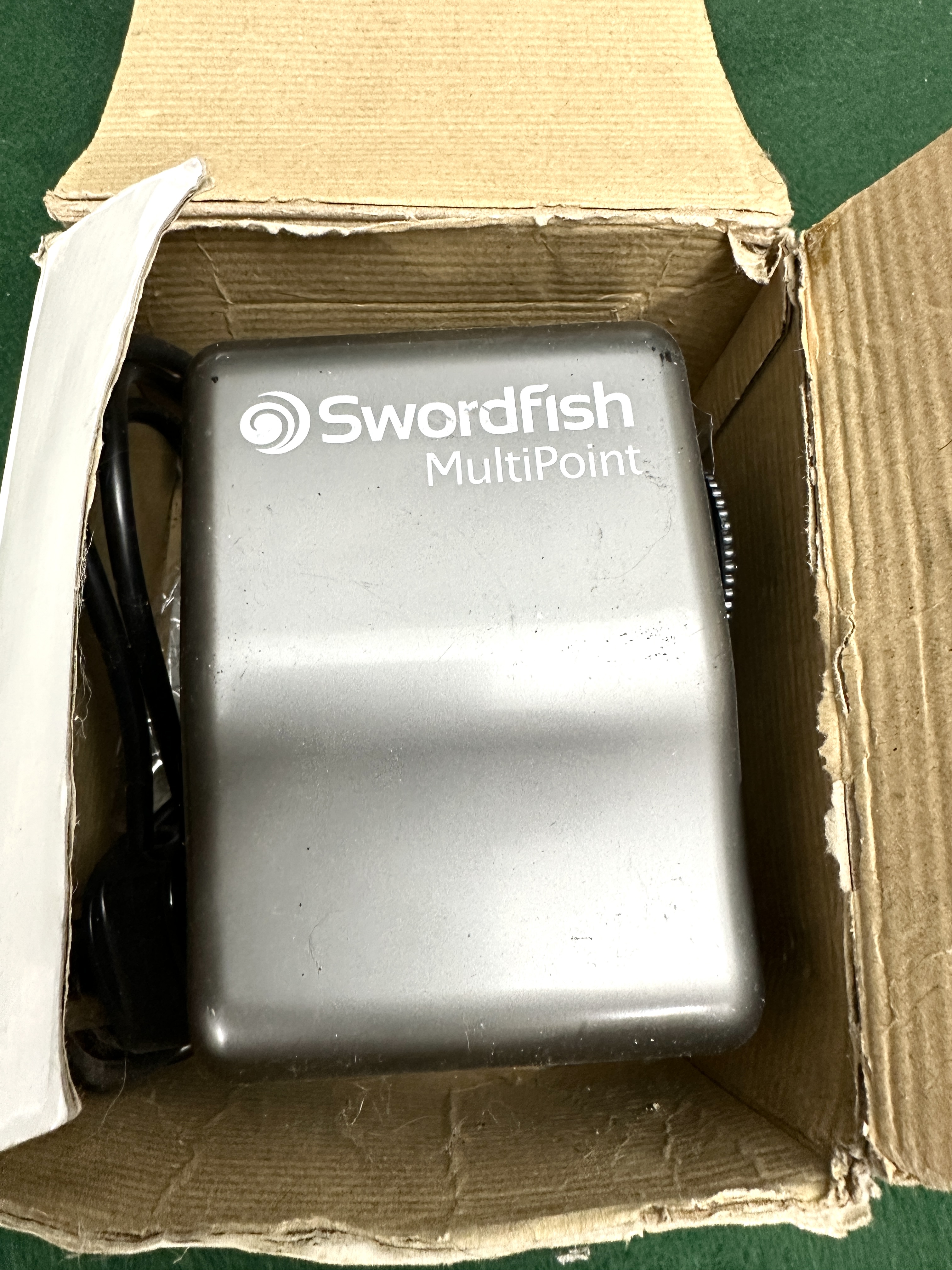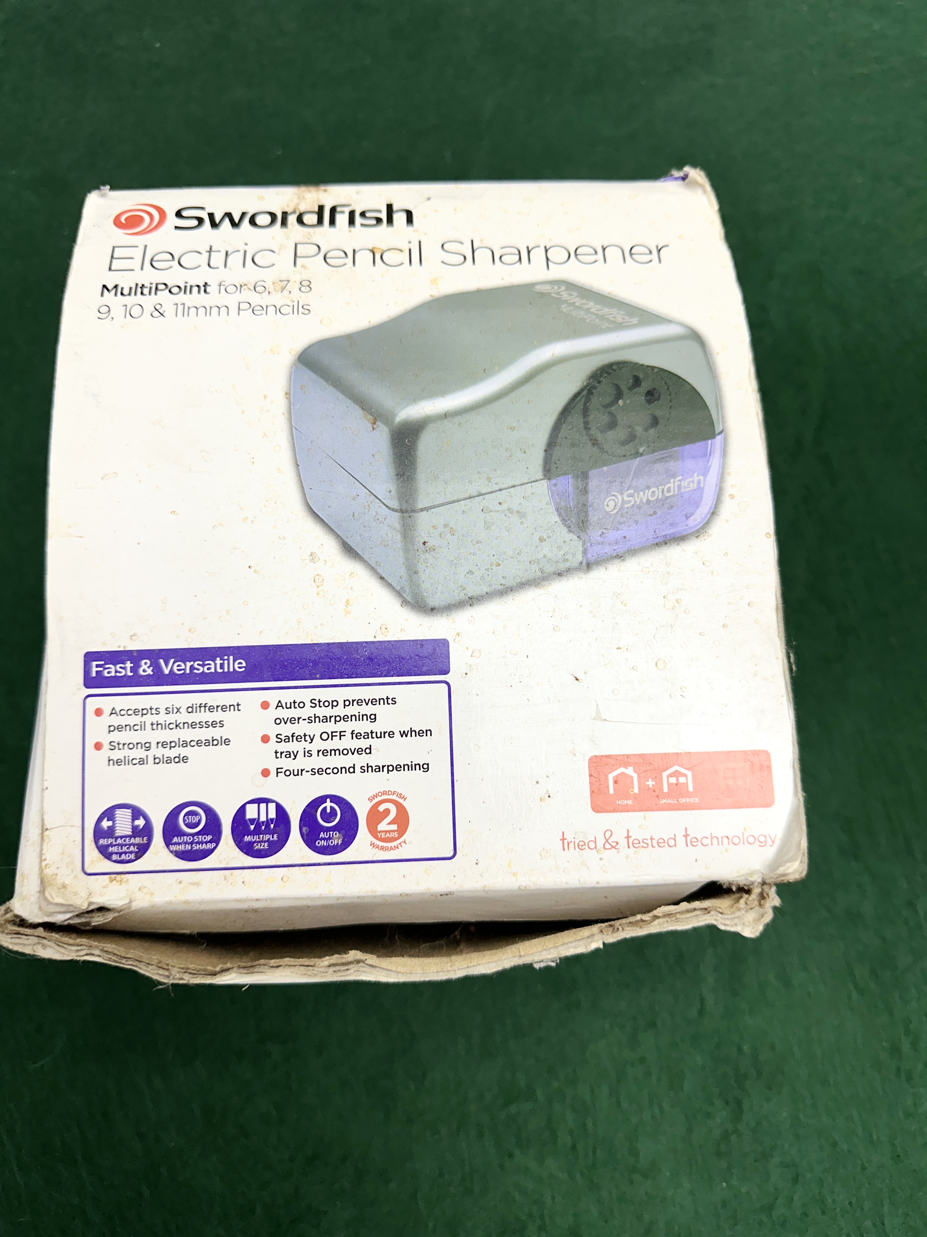 Customer Returns. The sharpener shows visible surface scuffing and dust consistent with previous handling or use. The original retail box is in poor condition, exhibiting significant tearing, wear, and surface soiling.