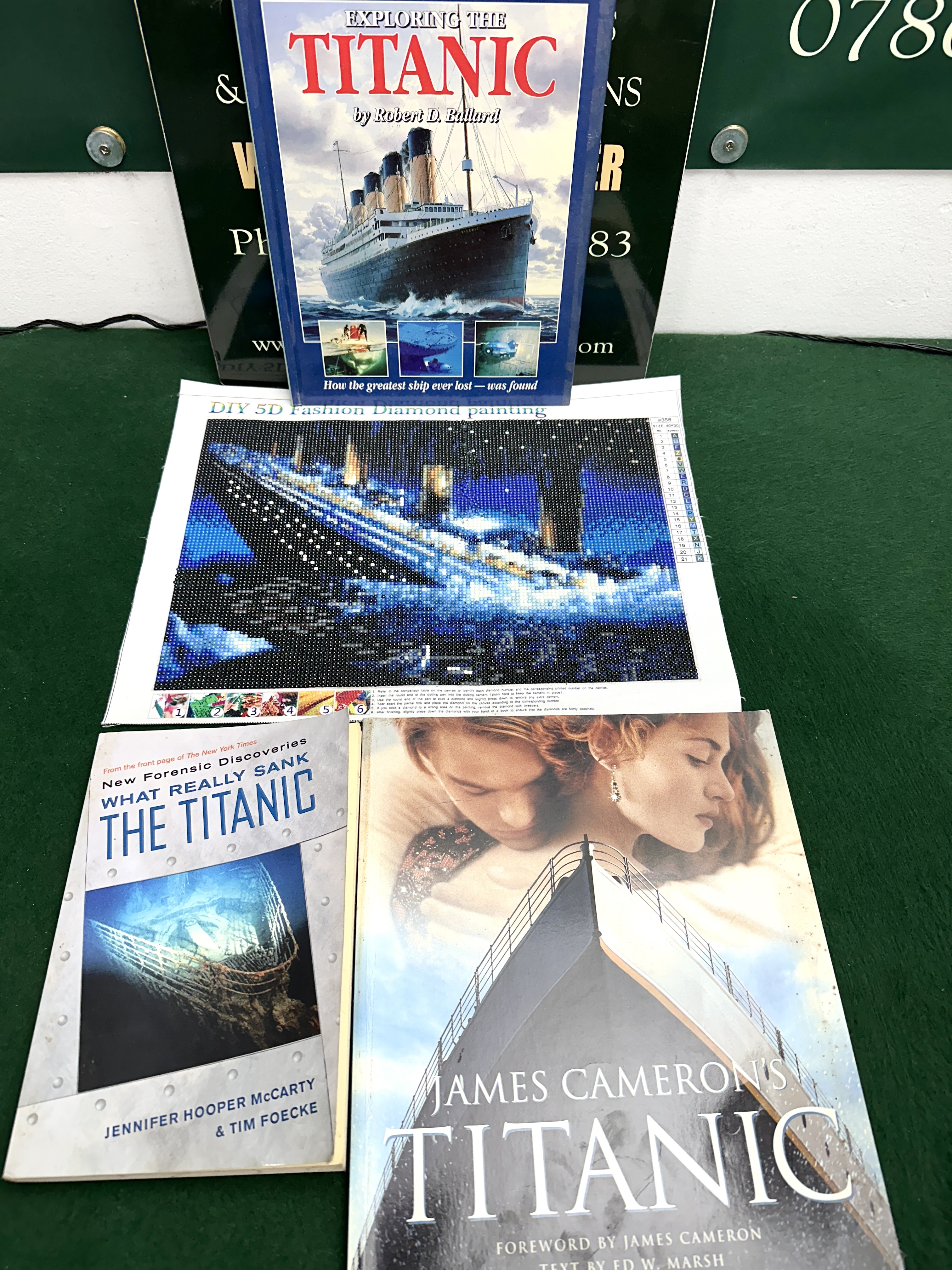 A collection of printed volumes and a craft item concerning the RMS Titanic. The group includes: Robert D. Ballard, Exploring the Titanic, Madison Press Books/Scholastic, 1988, quarto, pictorial boards, ISBN 0590419536; Jennifer Hooper McCarty and Tim Foecke, What Really Sank the Titanic: New Forensic Discoveries, Citadel Press, 2008, softcover, ISBN 0806528958; and Ed W. Marsh, James Cameron’s Titanic, HarperPerennial, 1997, large-format softcover with foreword by James Cameron, ISBN 0060953071. The collection is accompanied by a DIY 5D Fashion Diamond painting canvas, attributed to Artulio, featuring a nocturnal depiction of the vessel with a printed colour key and instructions to the border.