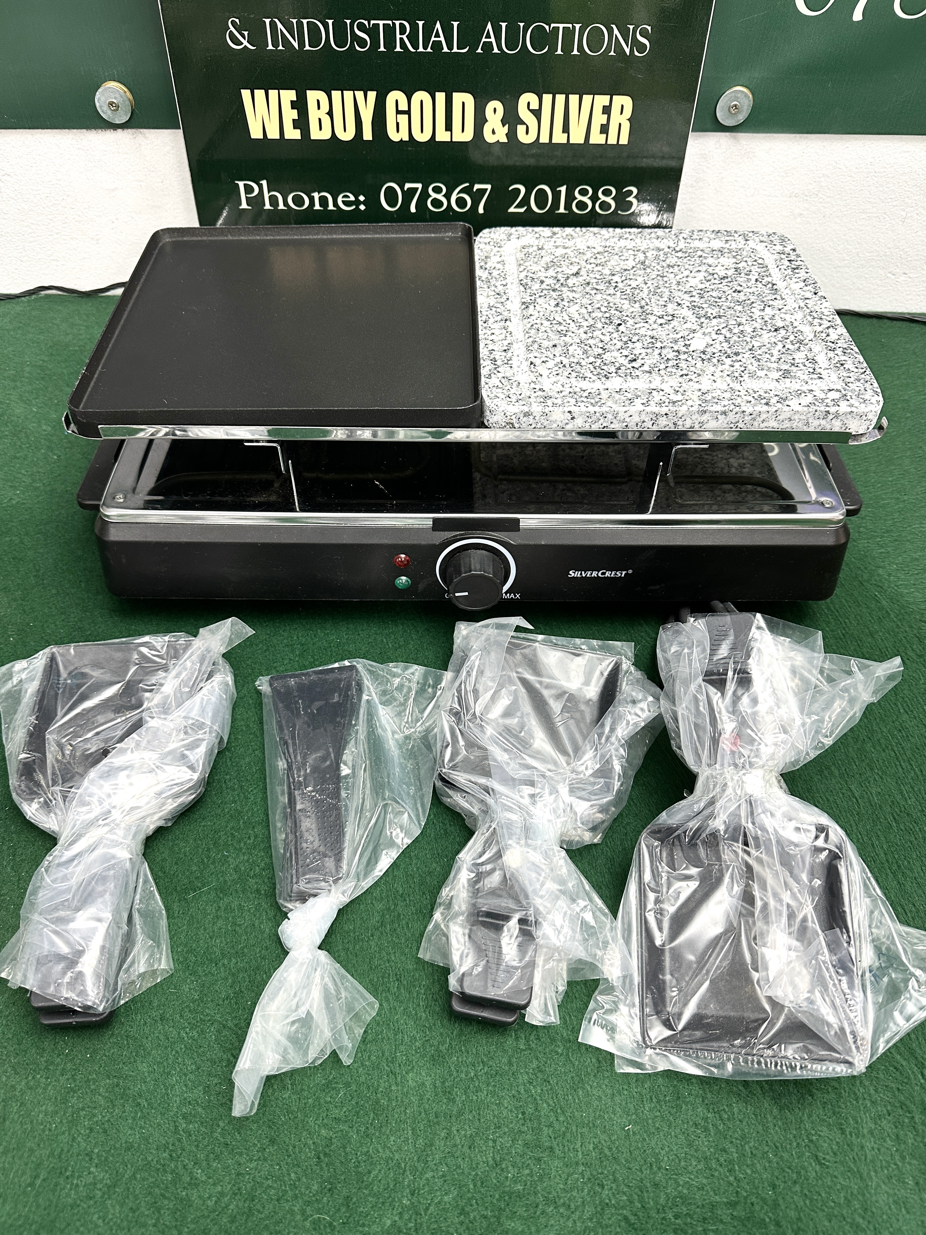 A SilverCrest electric raclette grill featuring a dual-top cooking surface comprising a non-stick metal griddle plate and a natural stone slab. The unit is finished with a black base and a chrome-effect metal frame. The front control panel includes the SilverCrest brand mark, a variable temperature control dial, and red and green indicator lights. This appliance is hardwired with a standard UK power cable. Included is a collection of individual raclette pans and plastic spatulas, many of which remain in their original protective plastic packaging.