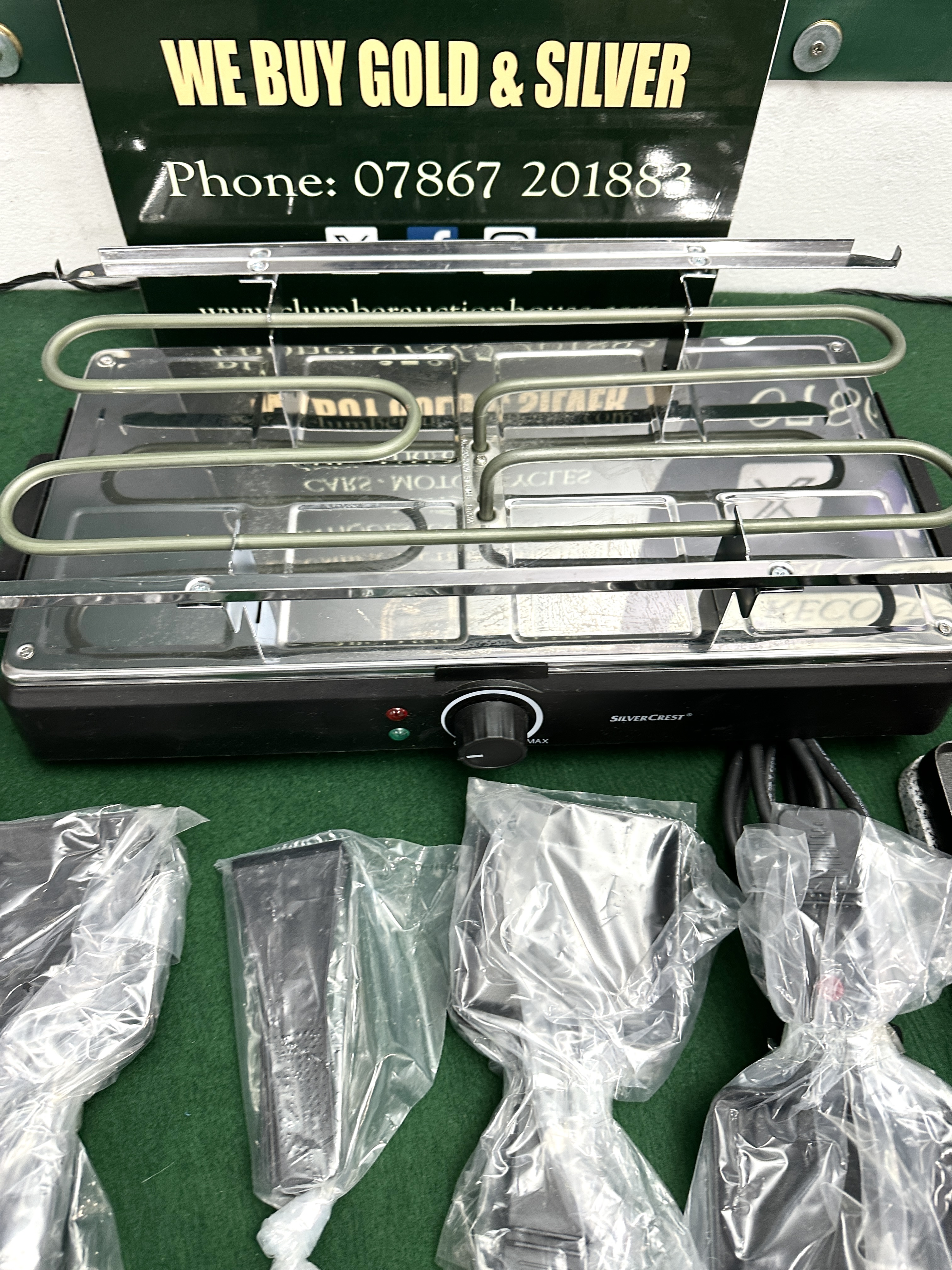 The item is in very good cosmetic condition, appearing potentially unused. The heating element and cooking surfaces show no visible signs of use. The unit is sold as untested for electrical safety and functional operation.