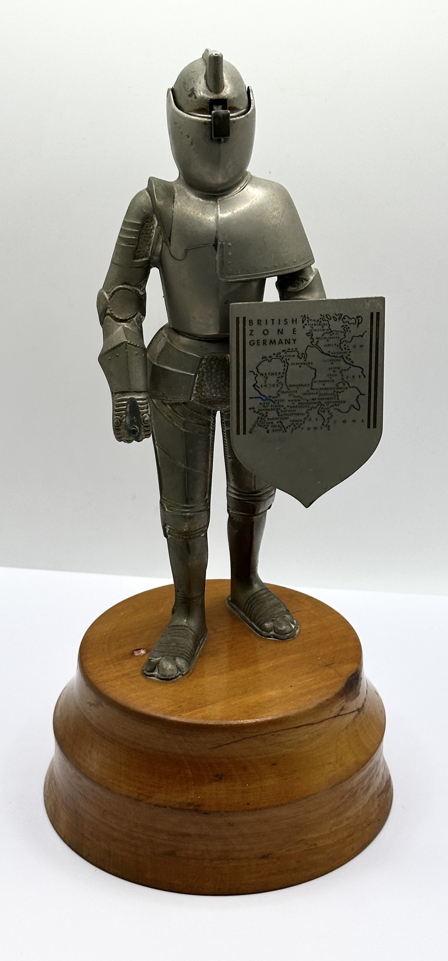 A post-WWII commemorative musical table lighter in the form of a standing knight in full plate armour, produced in Germany circa 1945-1955. This type of souvenir ware is frequently attributed to the manufacturer Weltzunder. The figure is fashioned from cast metal with a pewter-tone finish and is mounted on a stepped, circular wooden base. The helmet features an adjustable visor with a black striking trigger for the integrated lighter mechanism. The knight holds a heater-style shield featuring a detailed transfer-printed map of the British Zone of Occupation. The map identifies key regional locations including Flensburg, Schleswig, Kiel, Oldenburg, Bremen, Munster, Osnabruck, Hanover, Brunswick, Paderborn, Gottingen, Kassel, Essen, Dortmund, Duisburg, Dusseldorf, Cologne, Aachen, and Bonn. The surrounding territories are labelled Netherlands, Belgium, and U S Zone. The underside of the base houses a metal winding key for the musical movement and a circular aperture for sound resonance. A single stamped numeral 3 is present on the underside of the base.