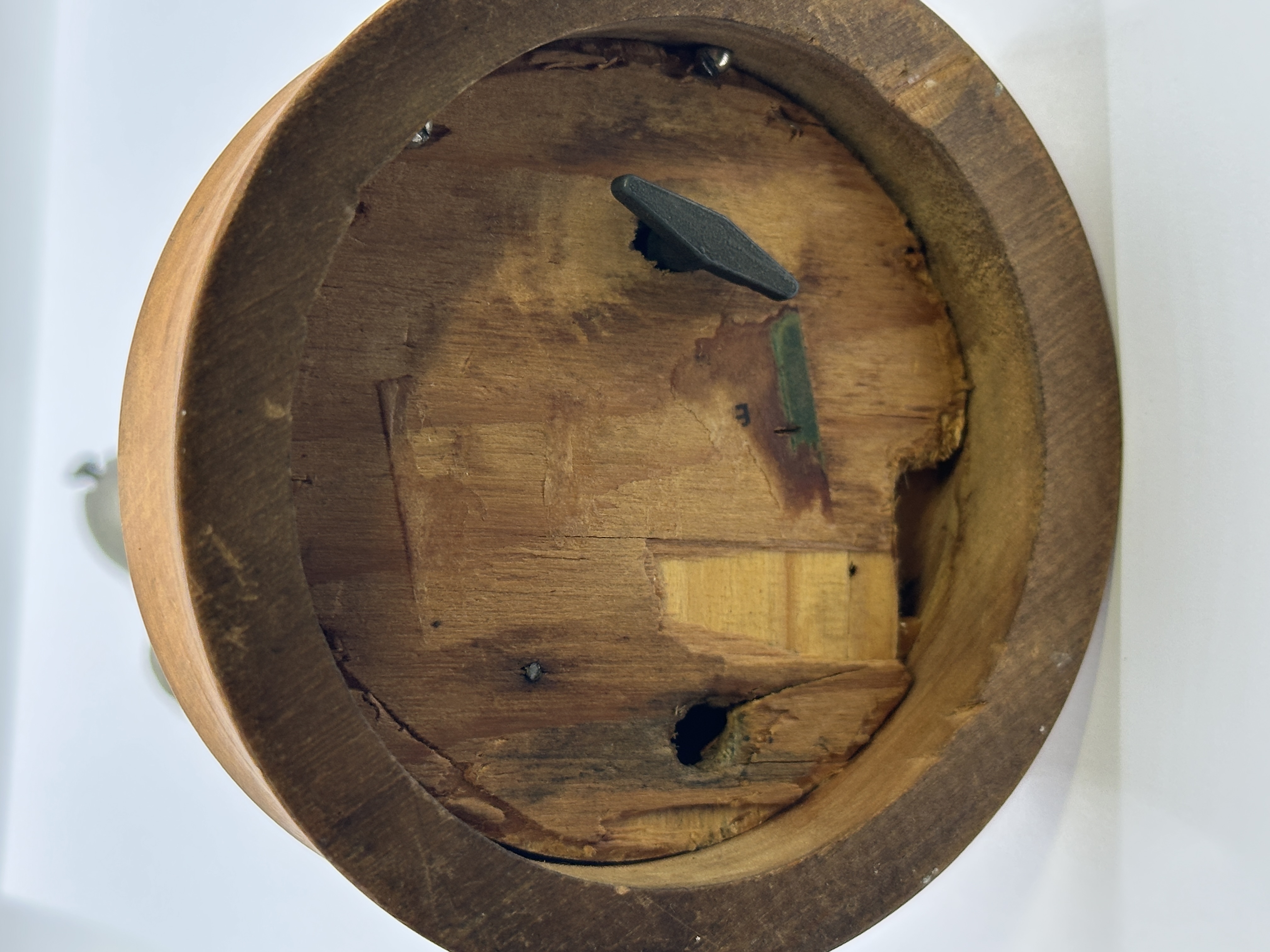 The cast metal figure shows a natural dull patina with minor surface oxidation and wear consistent with age. The visor mechanism is functional. The internal lighter and musical movement are present but remain untested. The turned wooden base is structurally sound, showing a small nick on the top surface near the right foot. The shield transfer is well-preserved, remaining clear and legible with minimal loss.