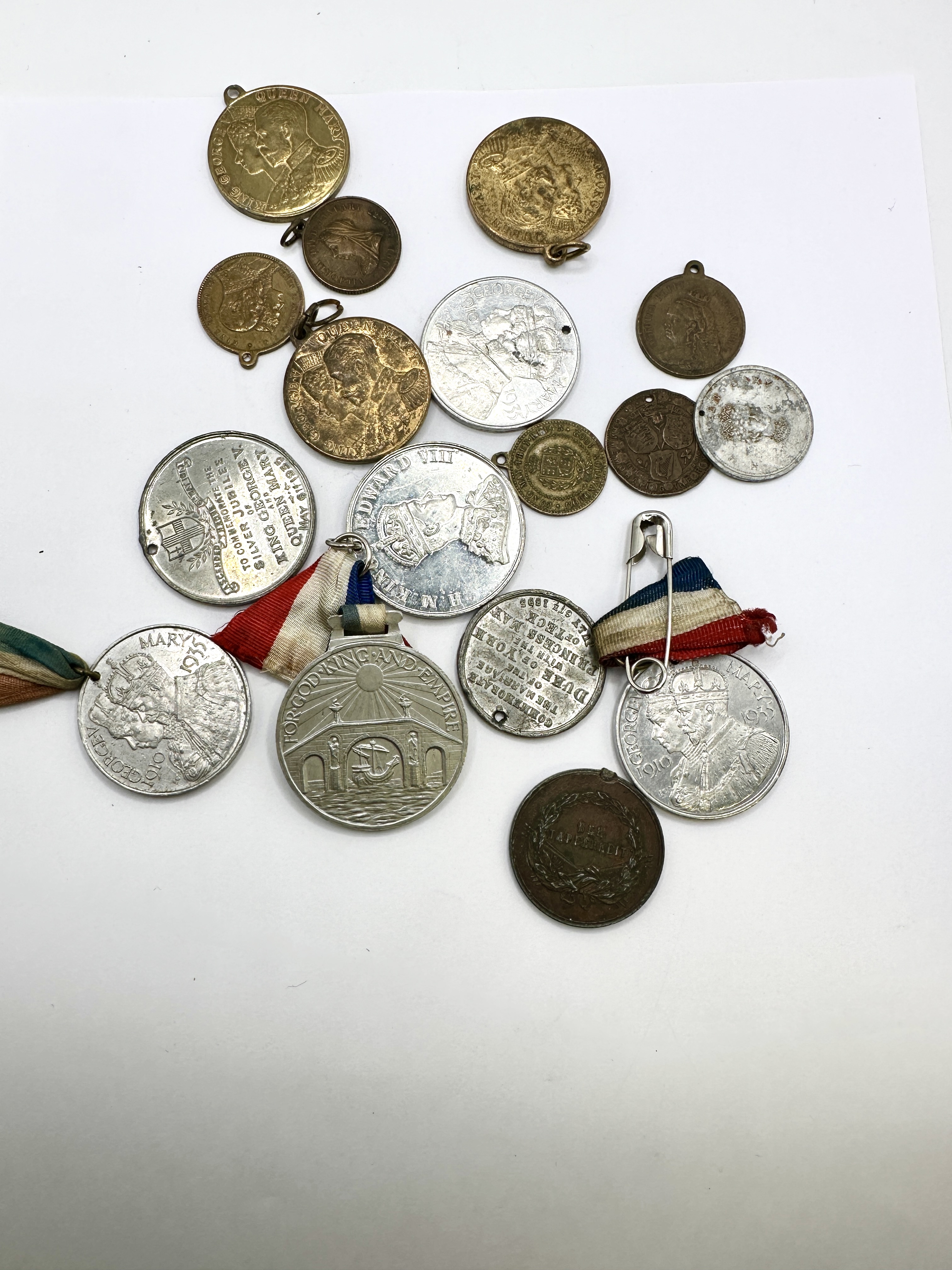 The collection is in mixed condition with visible signs of age and handling. The British Empire Medal shows surface wear and moderate tarnish, with the ribbon appearing aged and frayed at the edges. Several of the silvered base metal commemorative medallions exhibit significant wear to the plating, exposing the underlying brass or copper. Various items show surface oxidation, pitting, and scratches. Some medallions are missing their original suspension rings or ribbons. The Austro-Hungarian medal displays an even dark patina with minor surface marks.