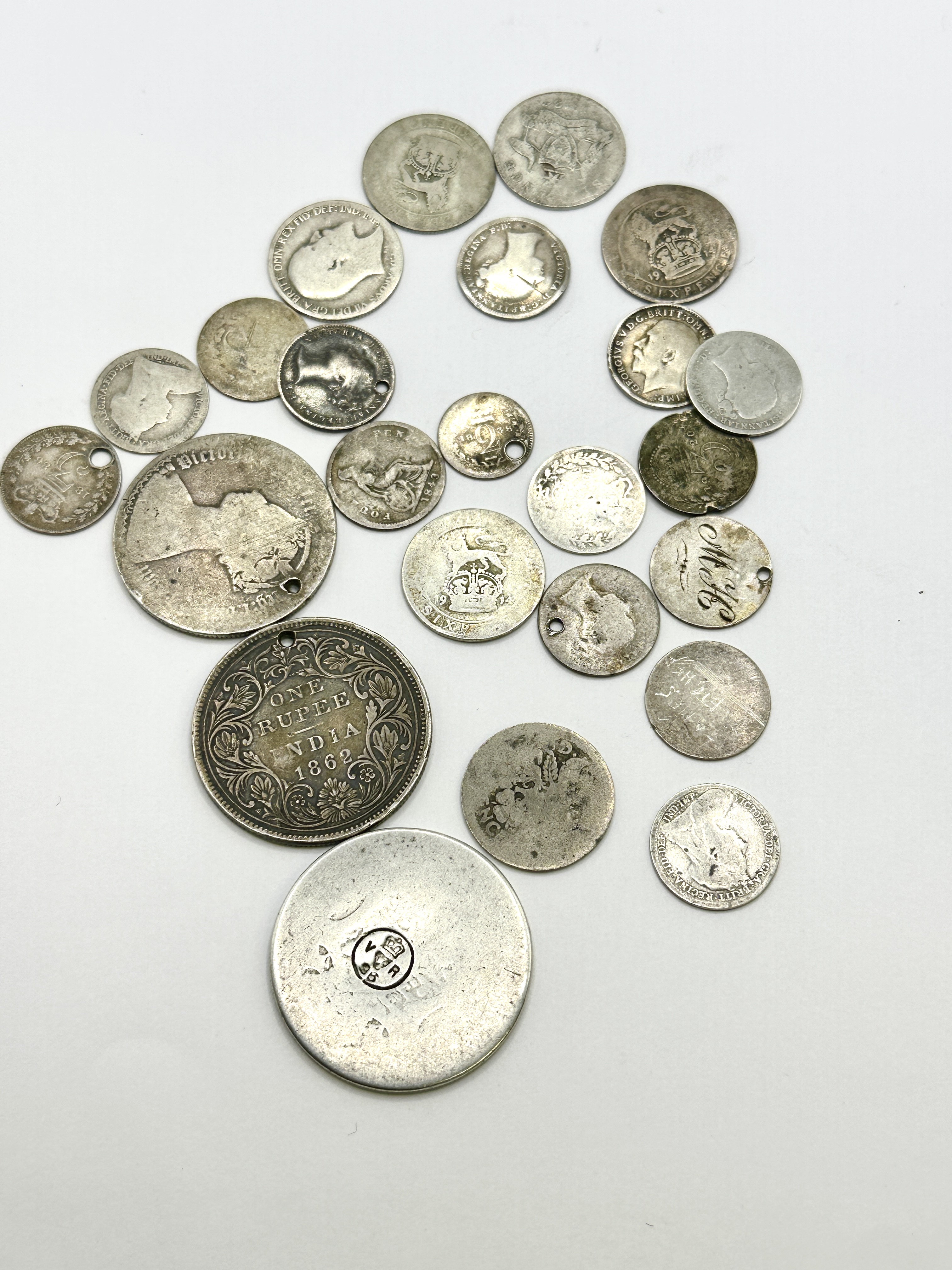A collection of British and British Colonial coinage, predominantly struck in silver. The group includes a British India One Rupee dated 1862 with a floral wreath reverse and a British silver fourpence dated 1843 featuring a seated Britannia reverse. Other denominations present include sixpences and threepences. Obverses feature portraits of Queen Victoria in young, jubilee, and veiled head variations, as well as Edward VII and George V. Notable items include a large, heavily worn silver-coloured disk with a central circular stamp depicting the Victoria Regina VR cypher surmounted by a crown, and a silver disk engraved with the initials MH. Several pieces have been modified with circular piercings.