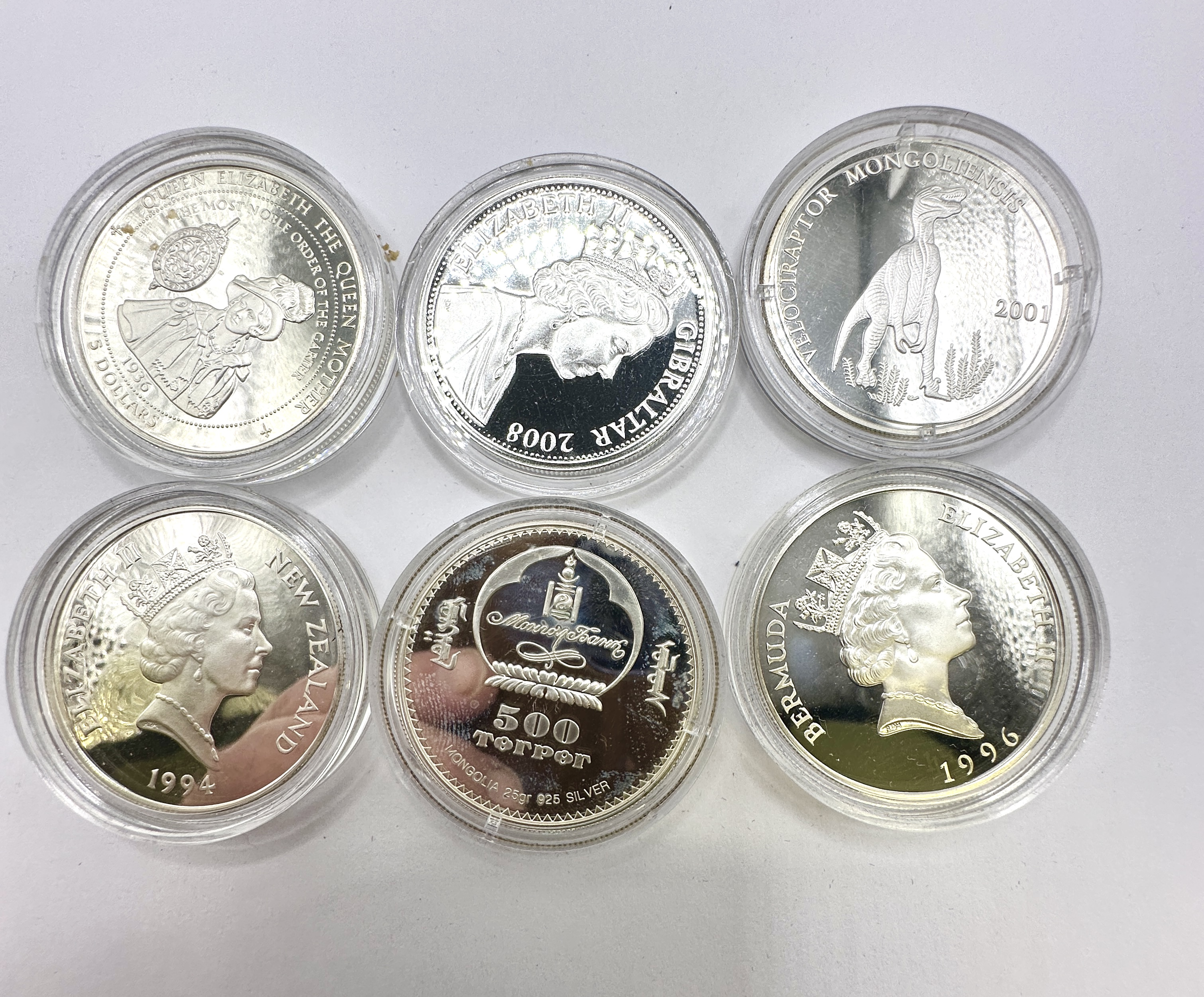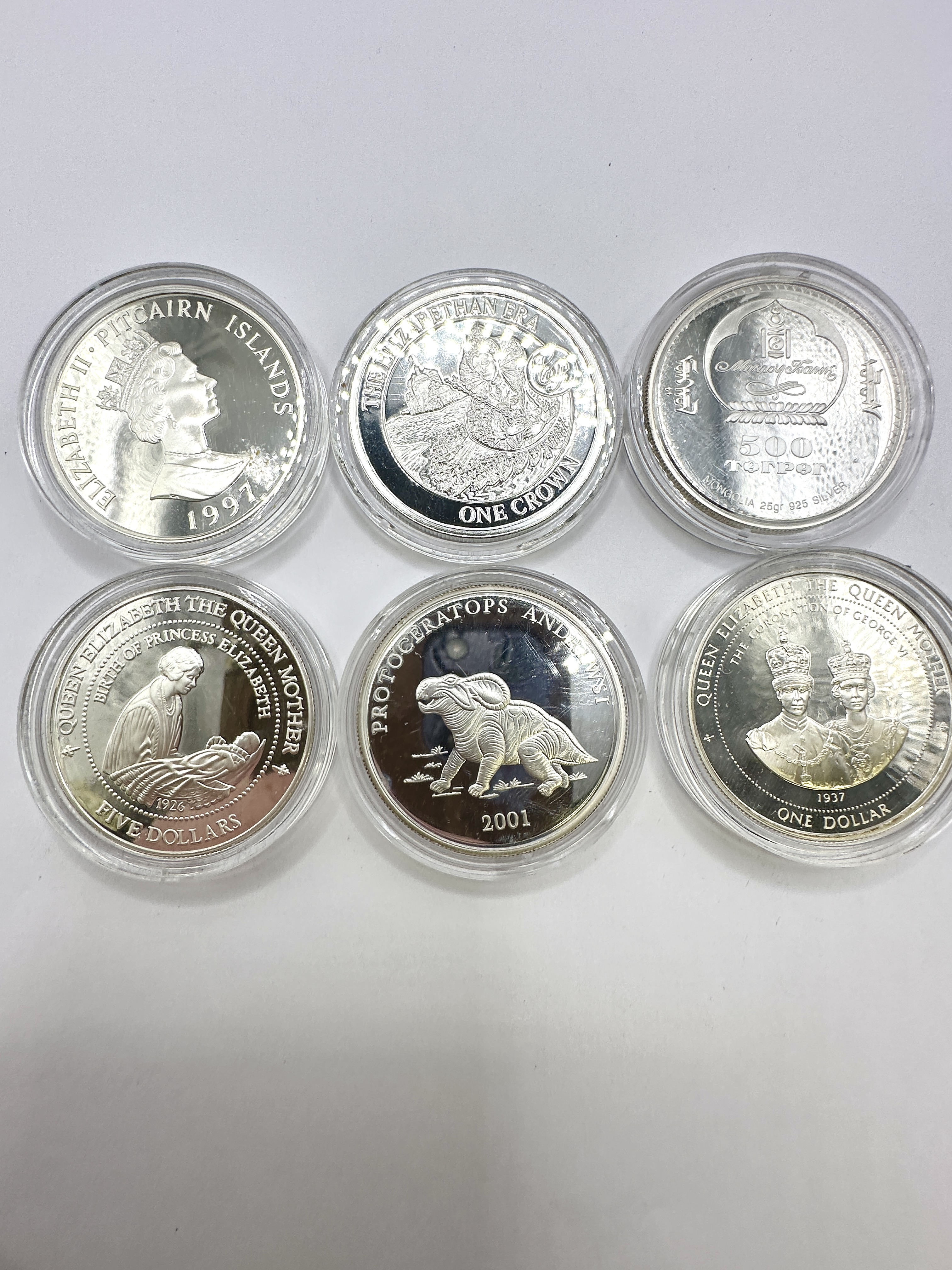 A collection of 925 silver commemorative coins from various issuers including Pitcairn Islands, Gibraltar, Mongolia, NZ, and Bermuda. The group features denominations including Five Dollars, One Dollar, One Crown, and 500 Togrog. Dates range from 1994 to 2008. Obverse designs primarily feature portraits of Queen Elizabeth II. Commemorative subjects include the Queen Mother (Birth of Princess Elizabeth 1926, Coronation of George VI 1937, and The Most Noble Order of the Garter 1936), the Elizabethan Era, and Mongolian prehistoric fauna depicting Protoceratops andrewsi and Velociraptor mongoliensis. The Mongolian issues are inscribed 25gr 925 SILVER. All coins are struck with proof finishes, exhibiting mirrored fields and frosted relief. Each coin is housed in an individual protective plastic capsule.
