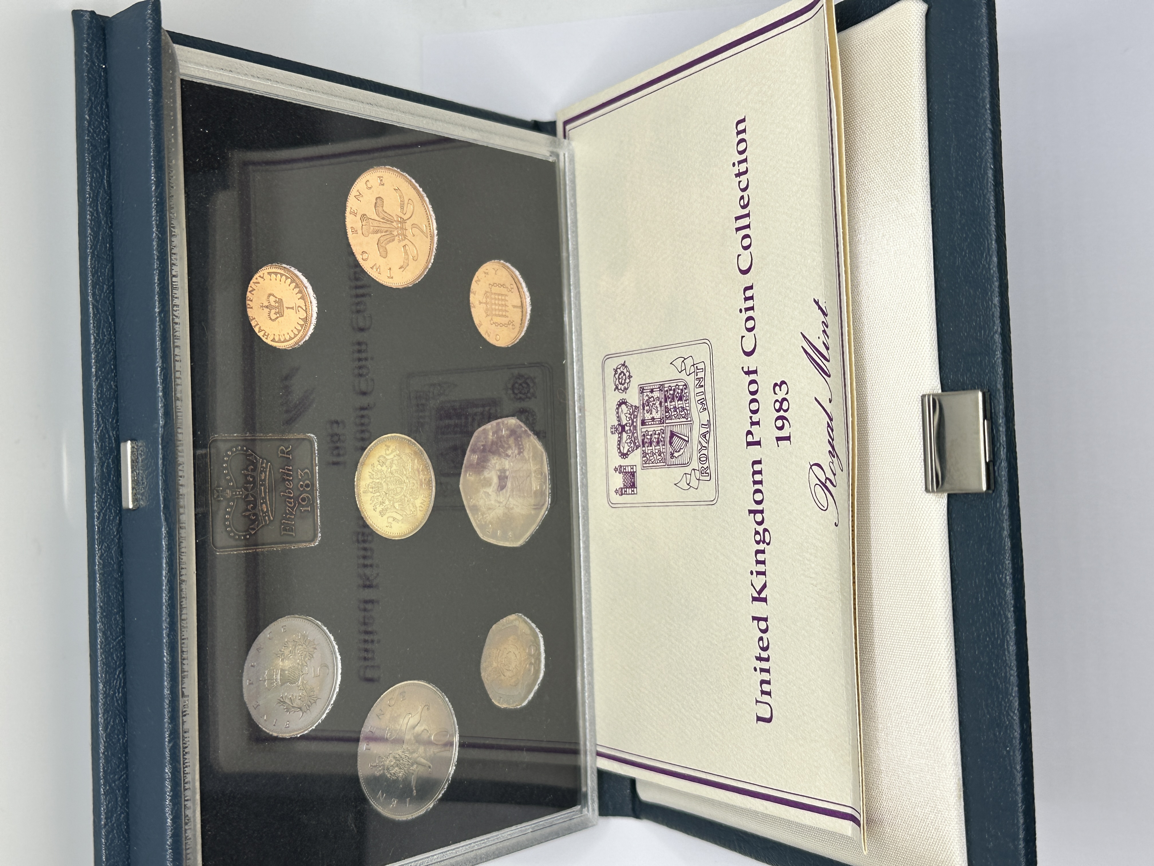 A United Kingdom Proof Coin Collection issued by the Royal Mint for the year 1983. The set contains a collection of decimal coins including the bronze half penny, one penny, and two pence; cupro-nickel five pence, ten pence, twenty pence, and fifty pence; and a nickel-brass one pound coin. The one pound coin represents the first year of issue for this denomination. The set includes a square metallic plaque inscribed Elizabeth R 1983 with a crown. The coins are held in a clear plastic display insert within a dark blue textured presentation case featuring a silver-coloured heraldic shield and the words ROYAL MINT on the lid. A cream-coloured booklet titled United Kingdom Proof Coin Collection 1983 is included.