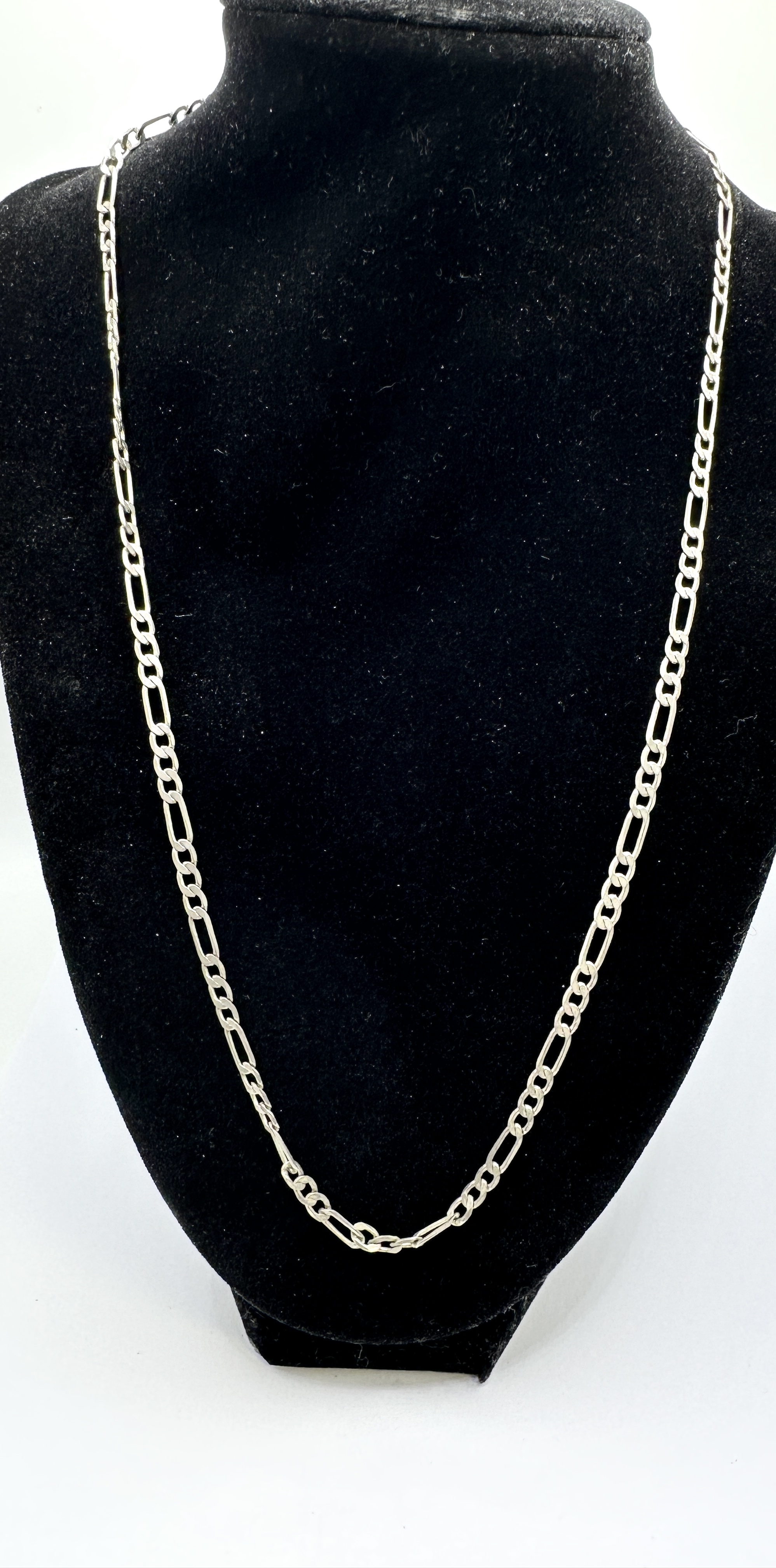 A chain necklace crafted from 925 silver. The piece features a Figaro link pattern, consisting of three small circular links alternating with one elongated oval link. This style of jewellery features a polished finish across all links. While no hallmarks or maker’s marks are visible on the links shown, the design is characteristic of Italian silver manufacture. The clasp mechanism is not visible.