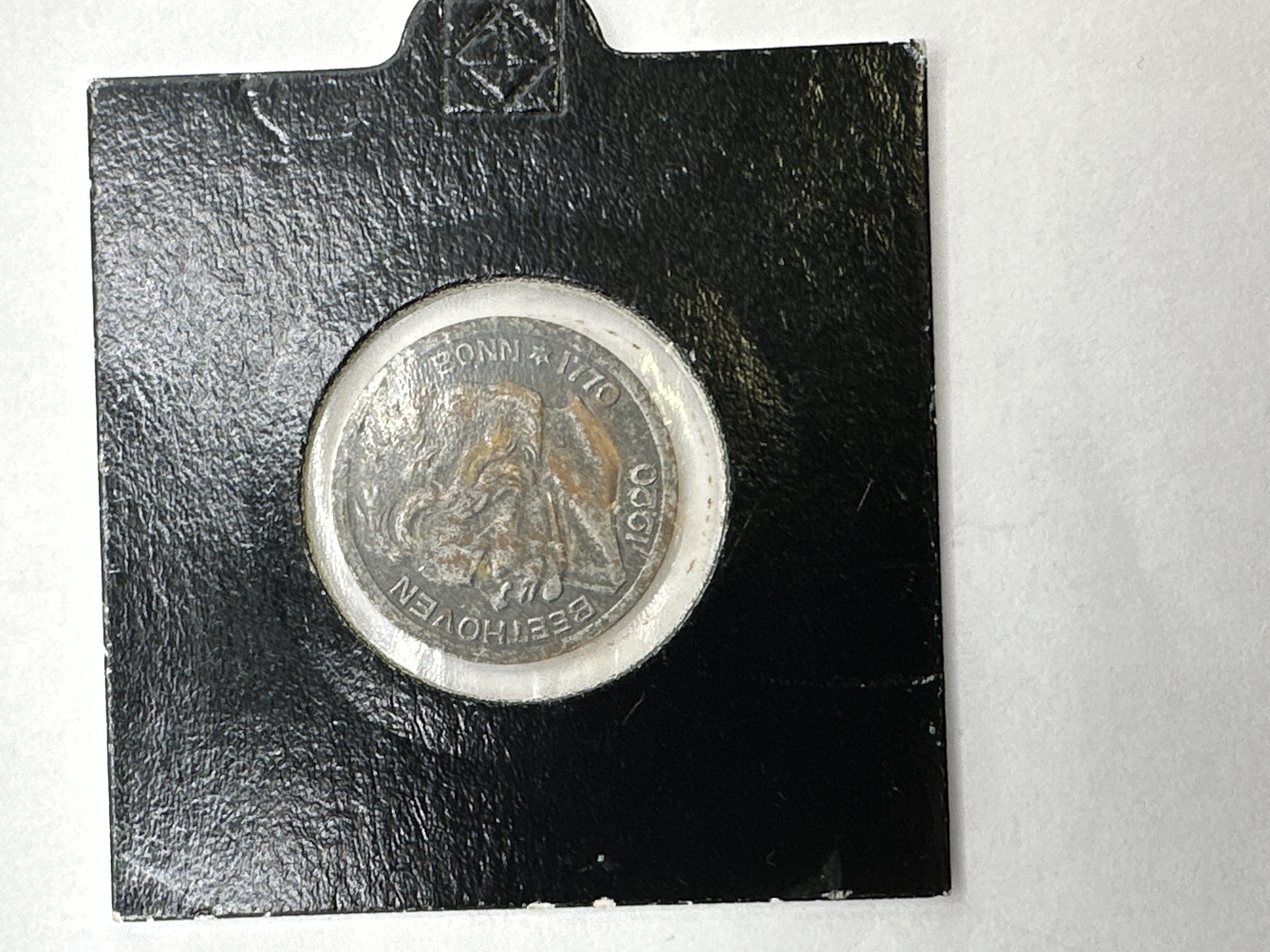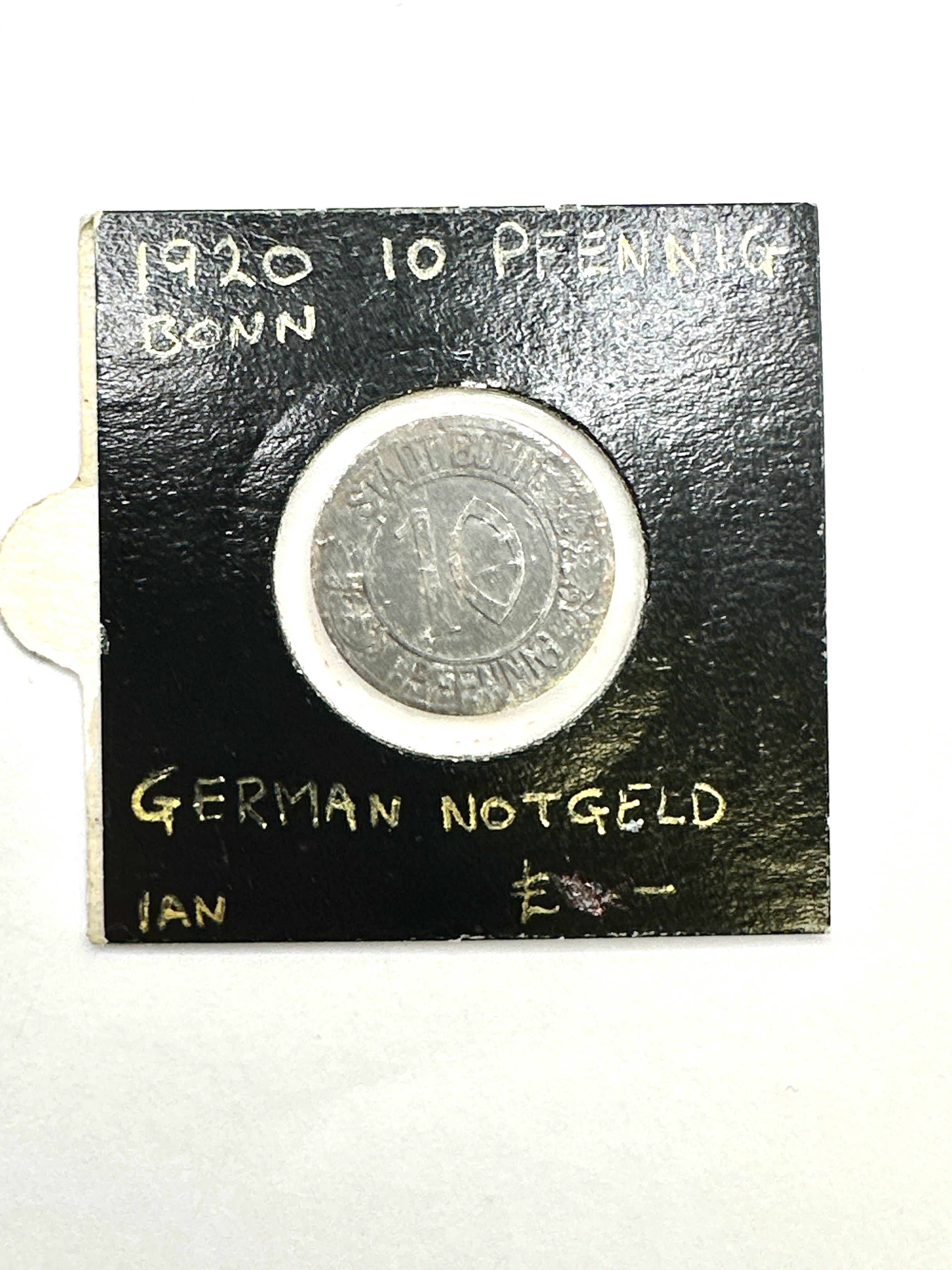 A German Notgeld 10 Pfennig emergency coin issued by the City of Bonn, dated 1920. Struck in a grey base metal, the obverse features a profile portrait of composer Ludwig van Beethoven with the inscriptions BEETHOVEN, BONN 1770, and 1920. The reverse displays the denomination 10 within the text STADT BONN PFENNIG. The coin is presented in a square, black textured cardboard flip that includes handwritten identification in gold-coloured ink reading 1920 10 PFENNIG BONN GERMAN NOTGELD.