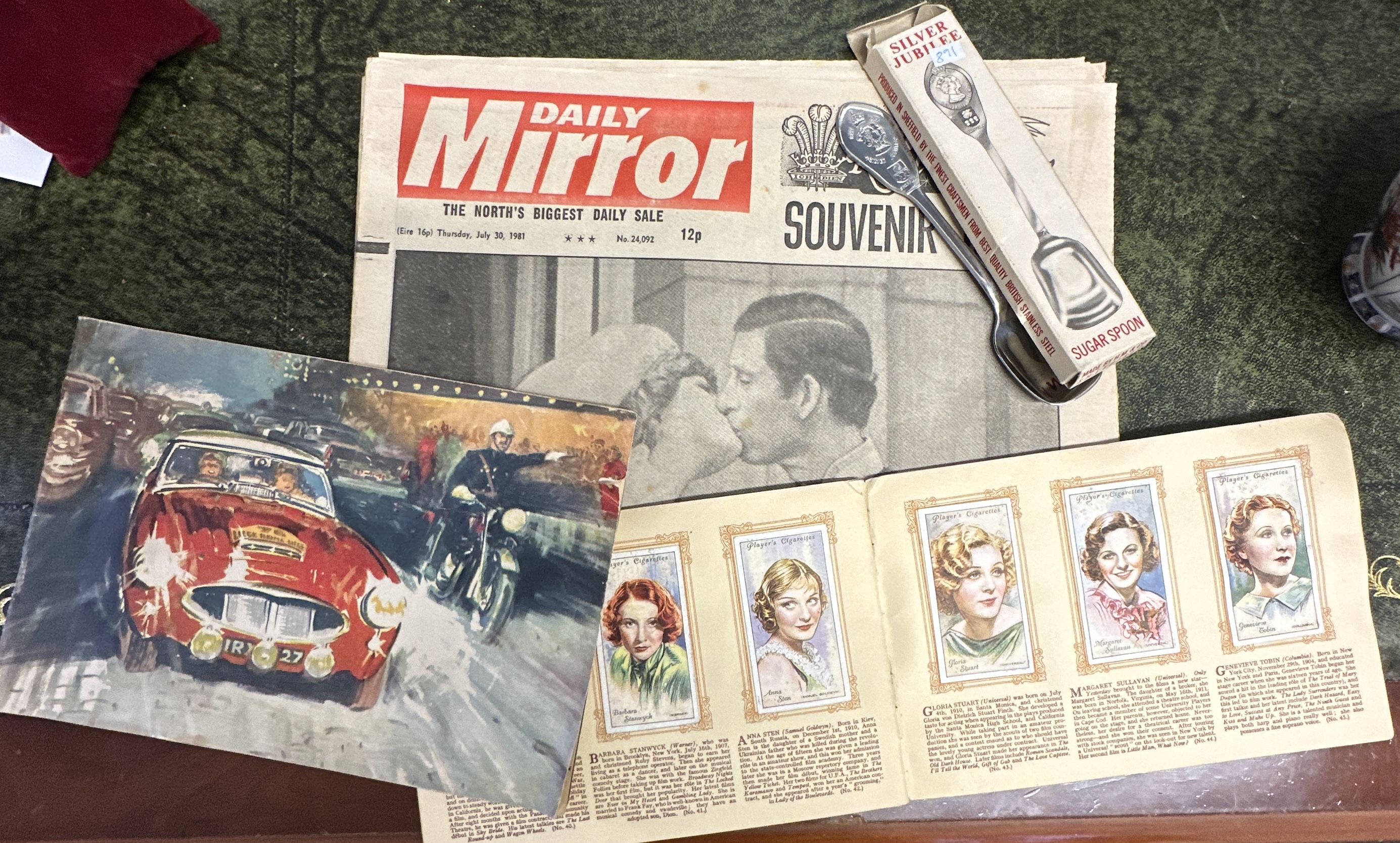 This collection comprises a variety of 20th-century ephemera and commemorative objects. It includes a John Player and Sons Film Stars cigarette card album from the 1934 series, featuring illustrated portraits and biographies of actresses such as Barbara Stanwyck and Gloria Stuart. Accompanying this is a Daily Mirror Souvenir newspaper dated Thursday, July 30, 1981, commemorating the wedding of Prince Charles and Princess Diana. The group also contains a commemorative stainless steel sugar spoon produced in Sheffield for the 1977 Silver Jubilee of Queen Elizabeth II, which remains in its original cardboard box. Additionally, there is an illustrative print or postcard depicting a red classic car with the registration IRX27 and a motorcycle officer.