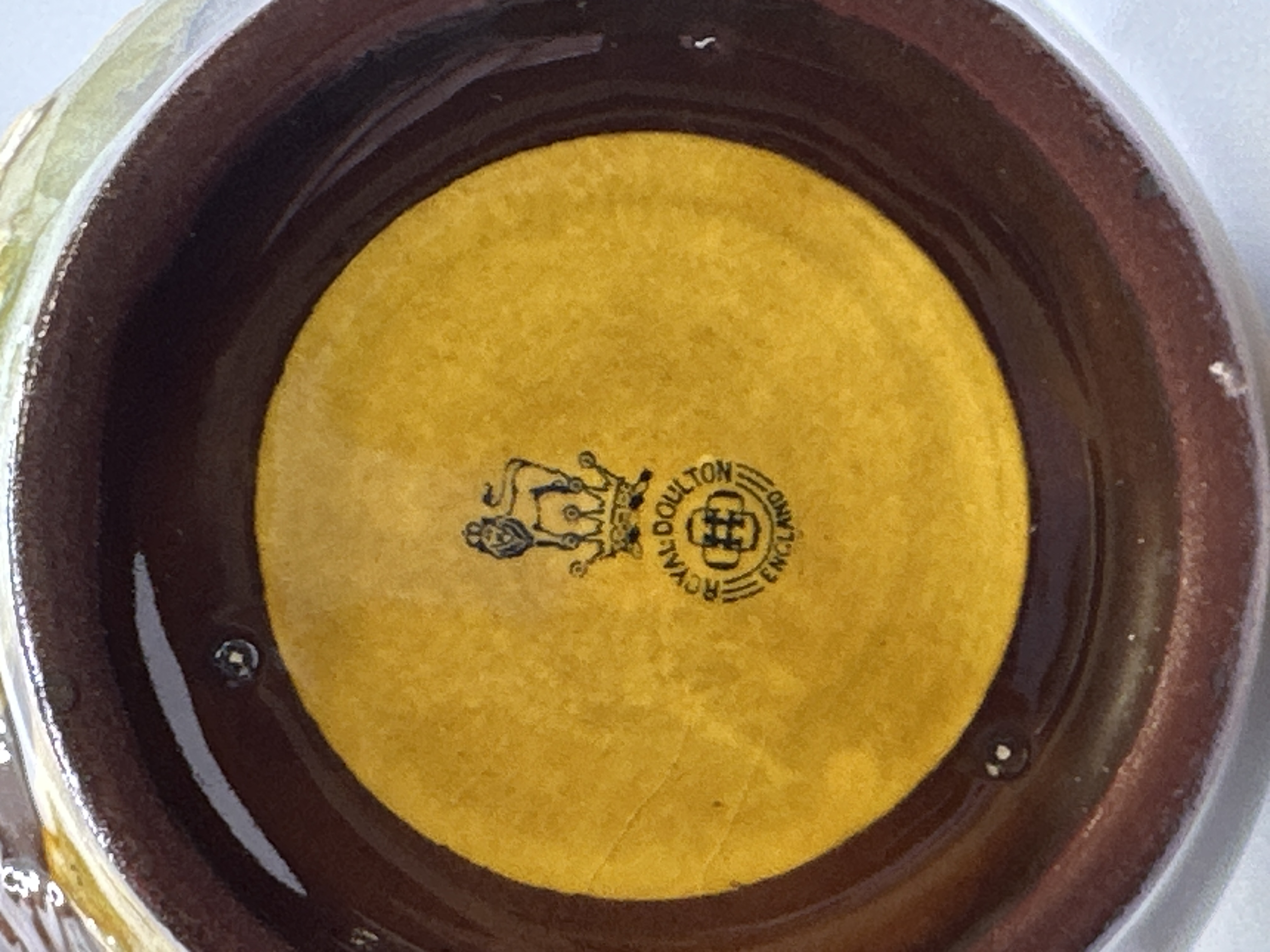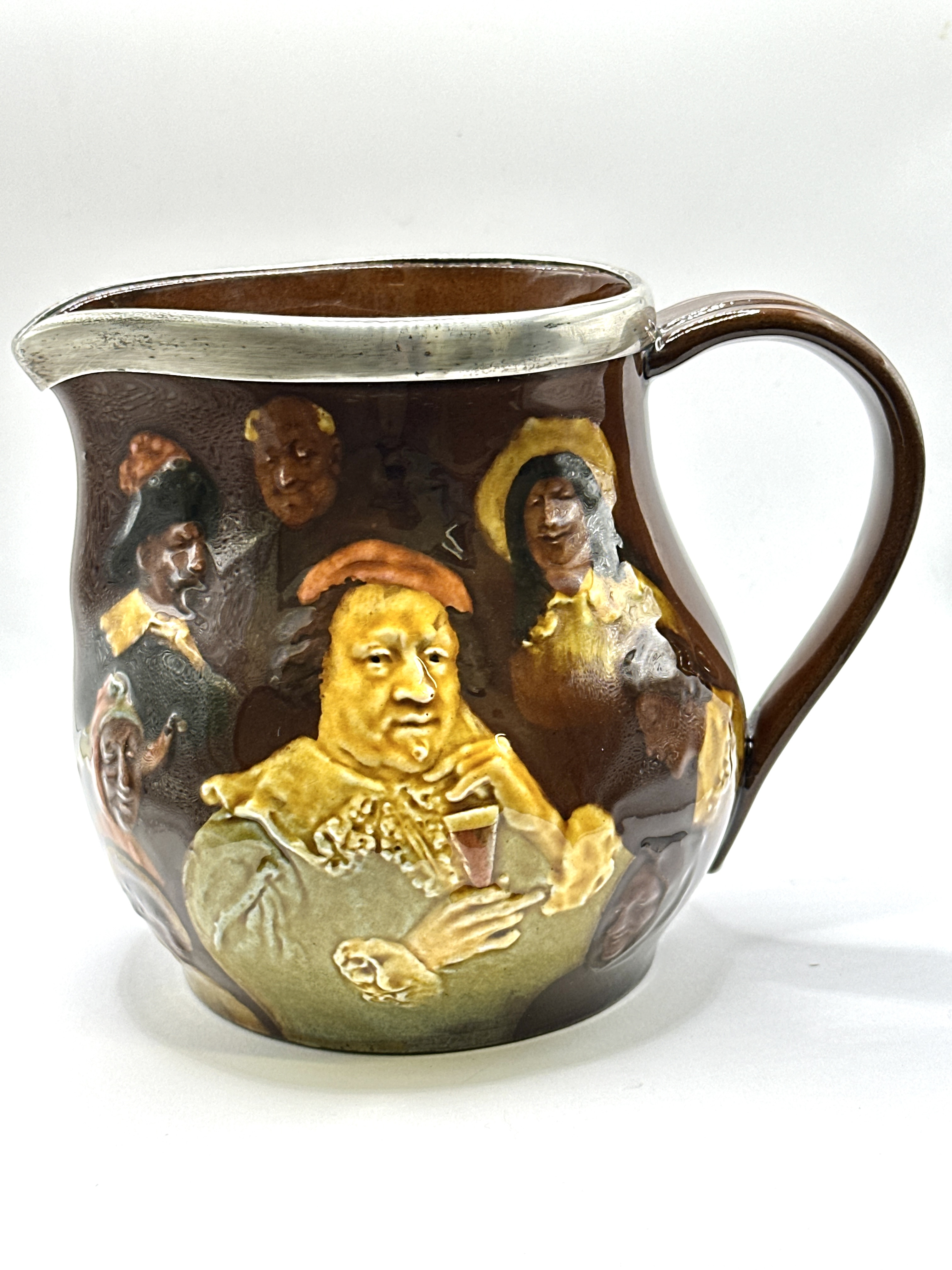 A Royal Doulton Kingsware ceramic jug featuring a brown-glazed body decorated with relief-molded figures in seventeenth-century style dress, depicting a central tavern scene. The exterior includes portions of yellow script text, including the word Memories. The rim is fitted with a hallmarked sterling silver band. The silver mount displays the maker mark SA, the lion passant for sterling silver, the leopard head for the London assay office, and the date letter t for 1914. The underside of the jug bears a circular Royal Doulton England backstamp applied to a yellow ground.