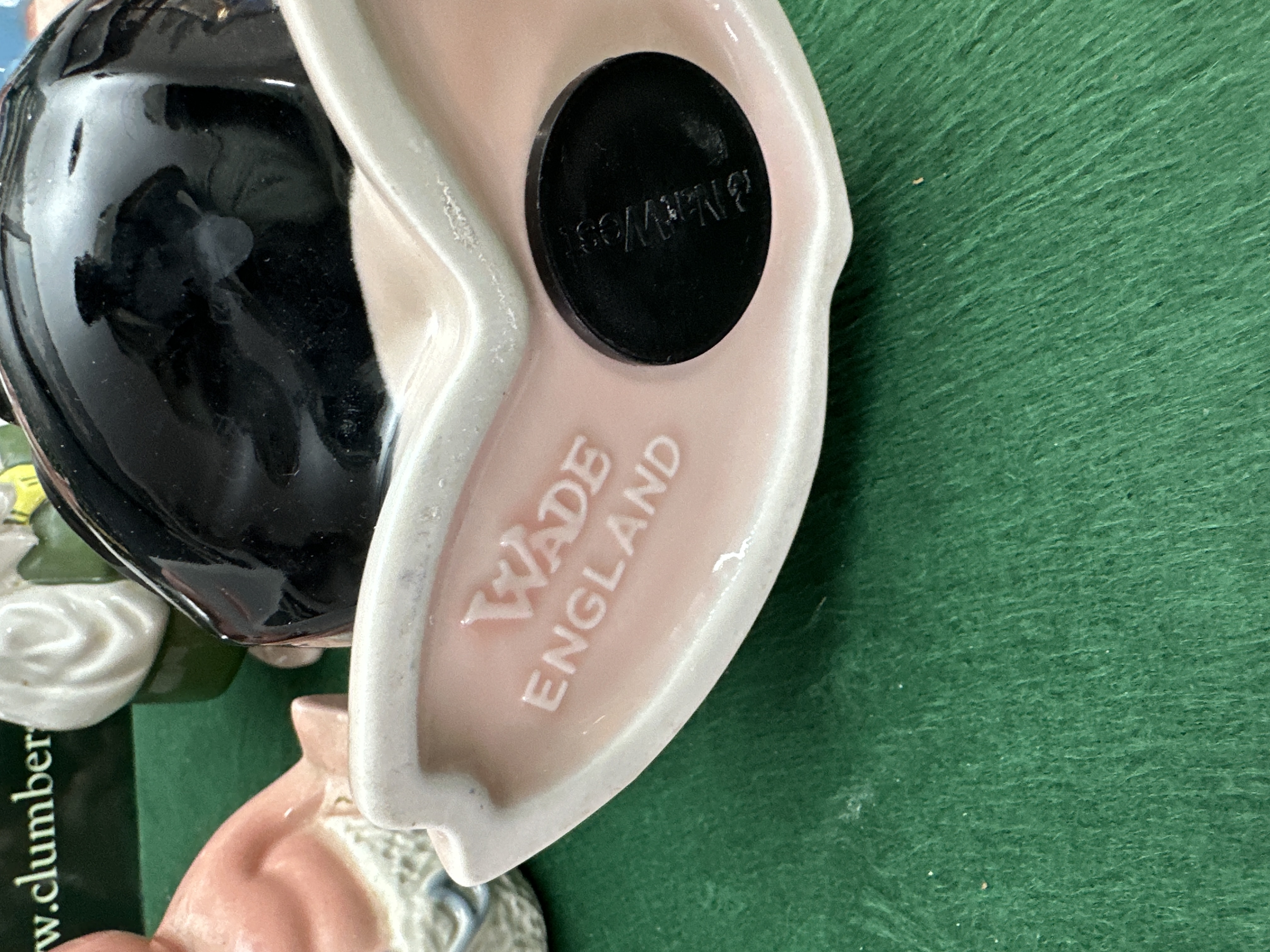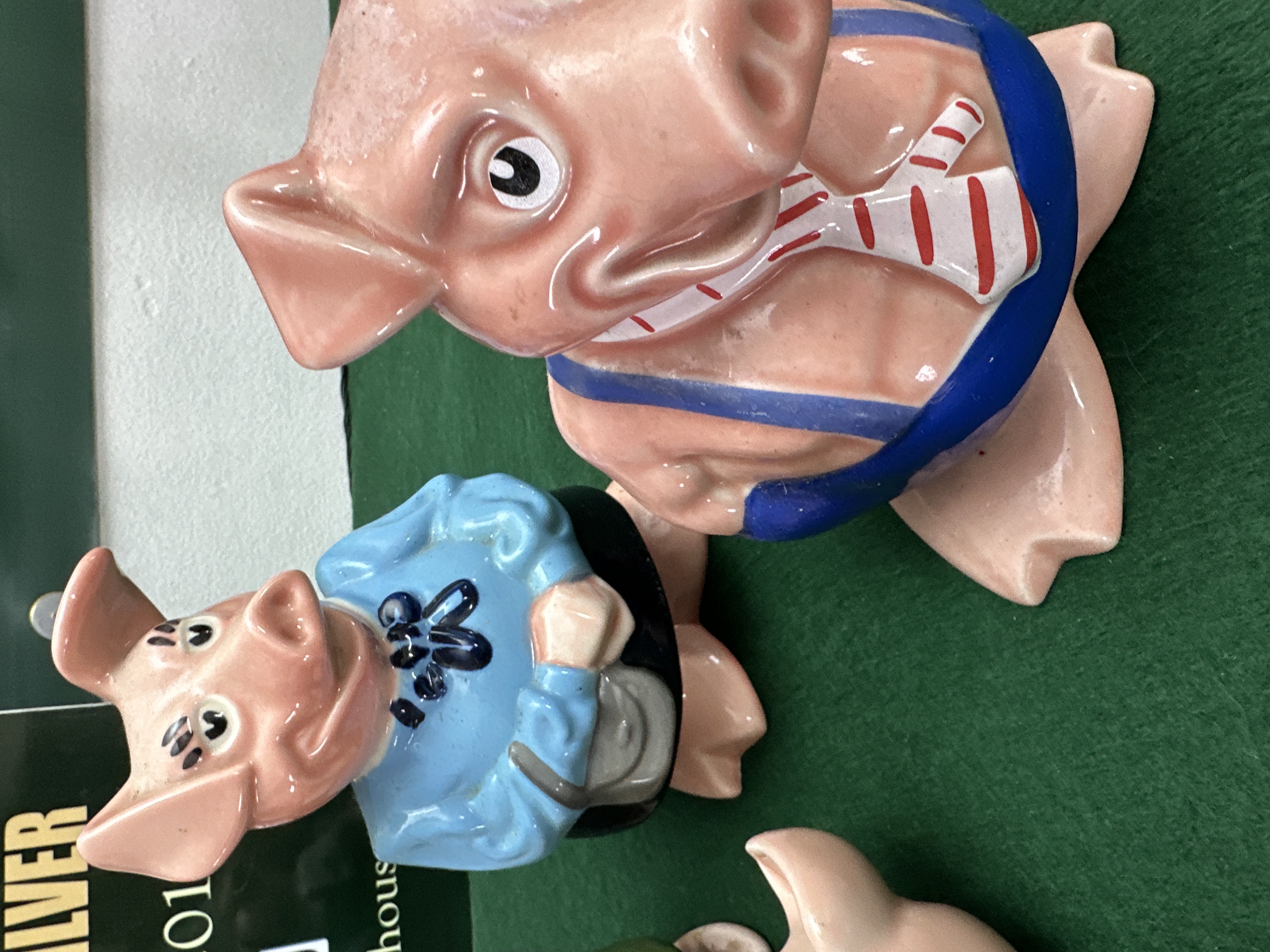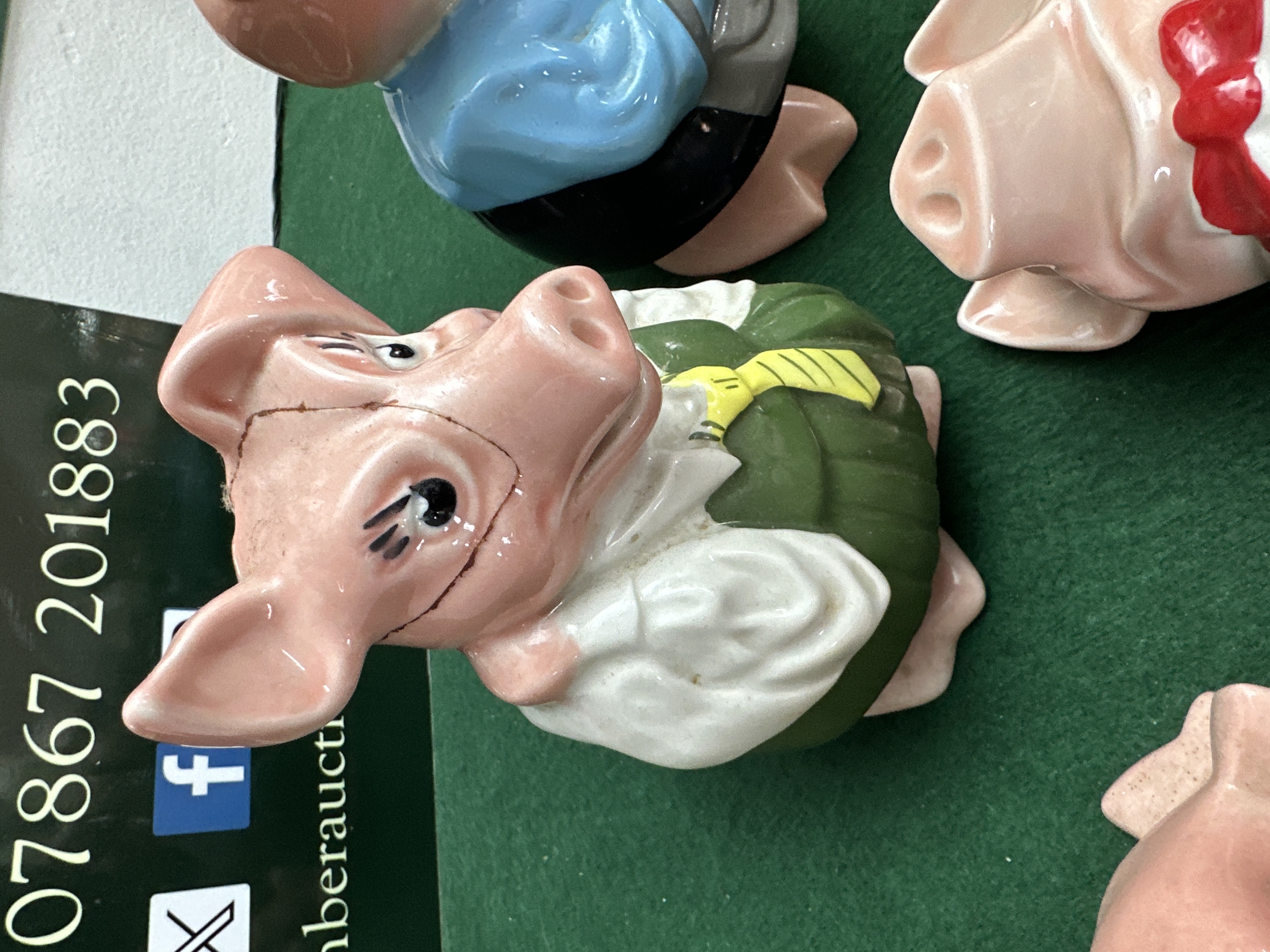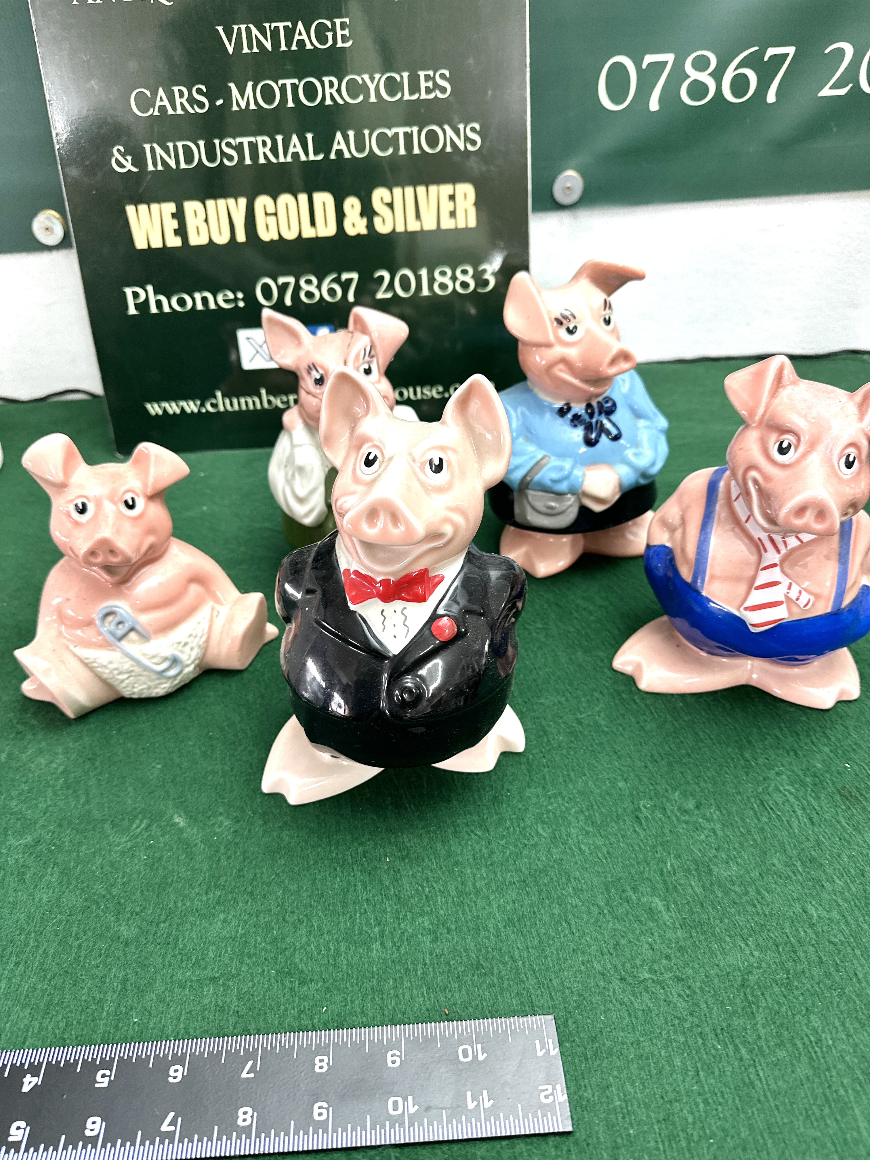 A set of glazed ceramic piggy banks produced by Wade England for National Westminster Bank. The collection features anthropomorphic figures representing a family in various outfits, including the father figure Sir Nathaniel Westminster in a black tuxedo with a red bow tie, alongside other figures in skirts, blouses, and shorts, as well as a seated baby pig with a safety pin nappy. Each figure is constructed with a coin slot to the reverse. The bases are marked with WADE ENGLAND in relief. Some examples retain their original black plastic stoppers embossed with the NatWest logo.