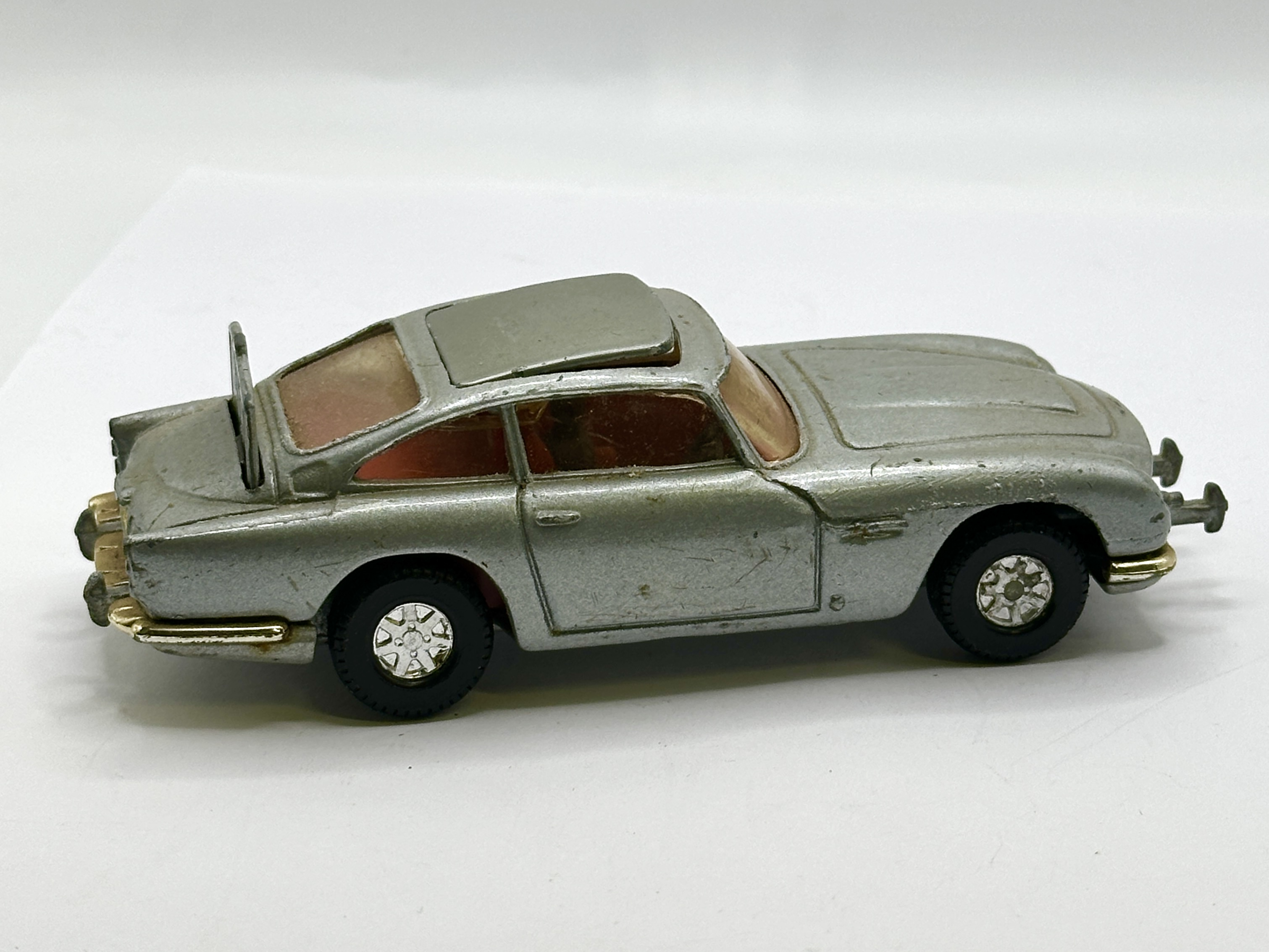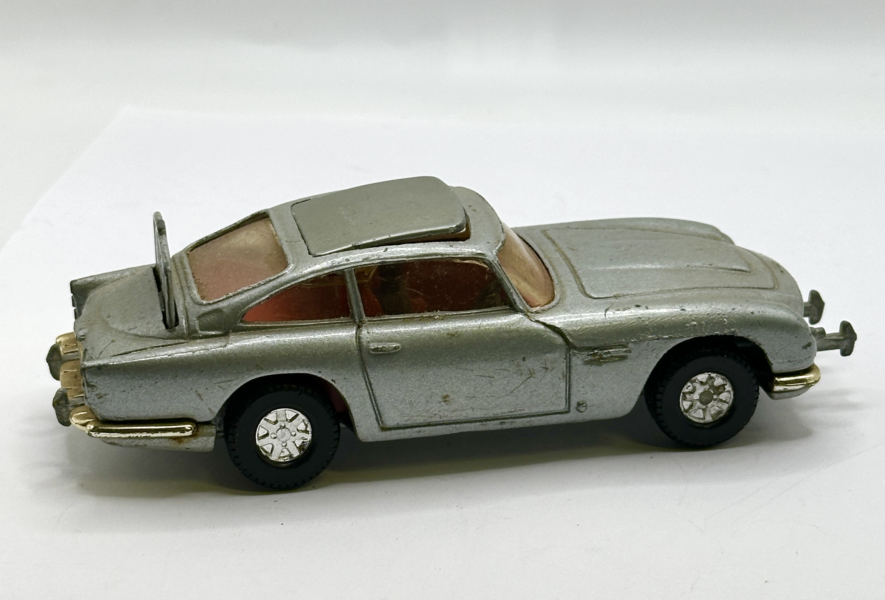 The item is in play-worn condition with extensive paint loss and surface scratches across the body. Several components are missing, specifically the interior ejector seat and the passenger figure. The action mechanisms and wheels show signs of heavy use.