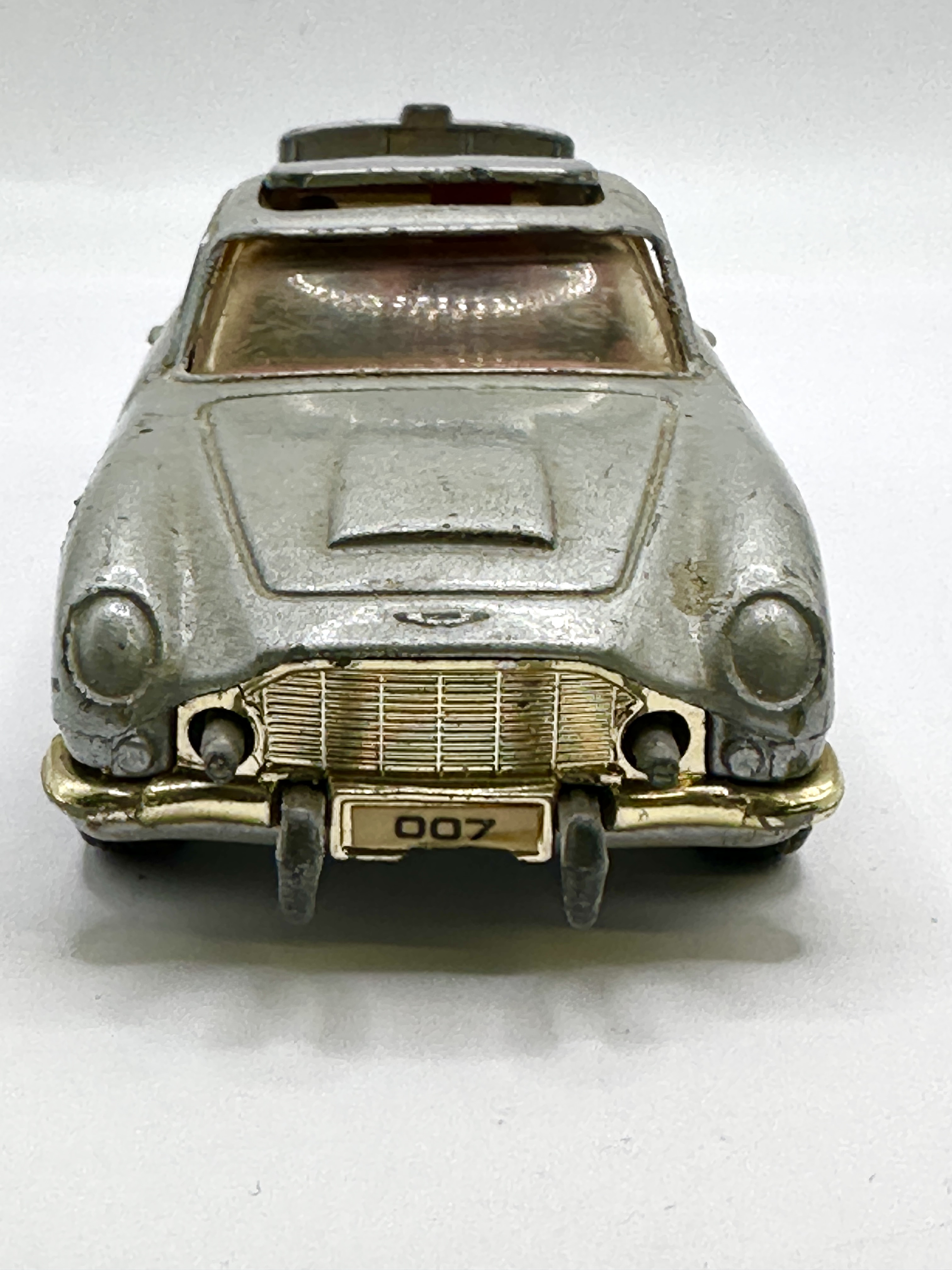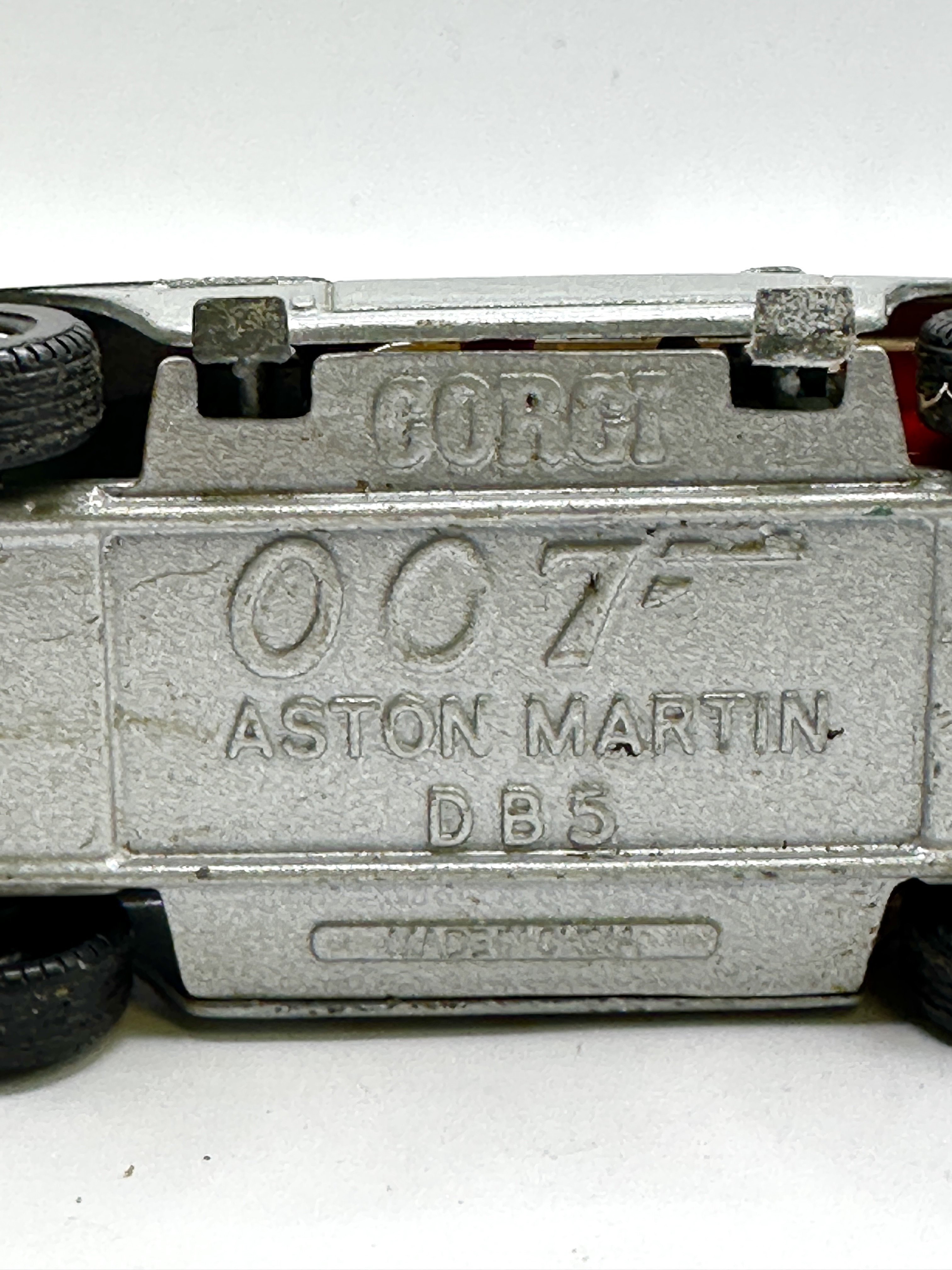 A Corgi Toys James Bond 007 Aston Martin DB5 die-cast model car, finished in silver paint. This model, identified as reference number 270, features integrated action mechanisms including a retractable rear bullet-proof shield, front-mounted machine guns, and an opening roof section designed for an ejector seat. The front licence plate displays 007. The underside is embossed with the marks CORGI, 007, ASTON MARTIN, DB5, and MADE IN GT. BRITAIN. The vehicle is fitted with a gold-tone grille and bumpers.
