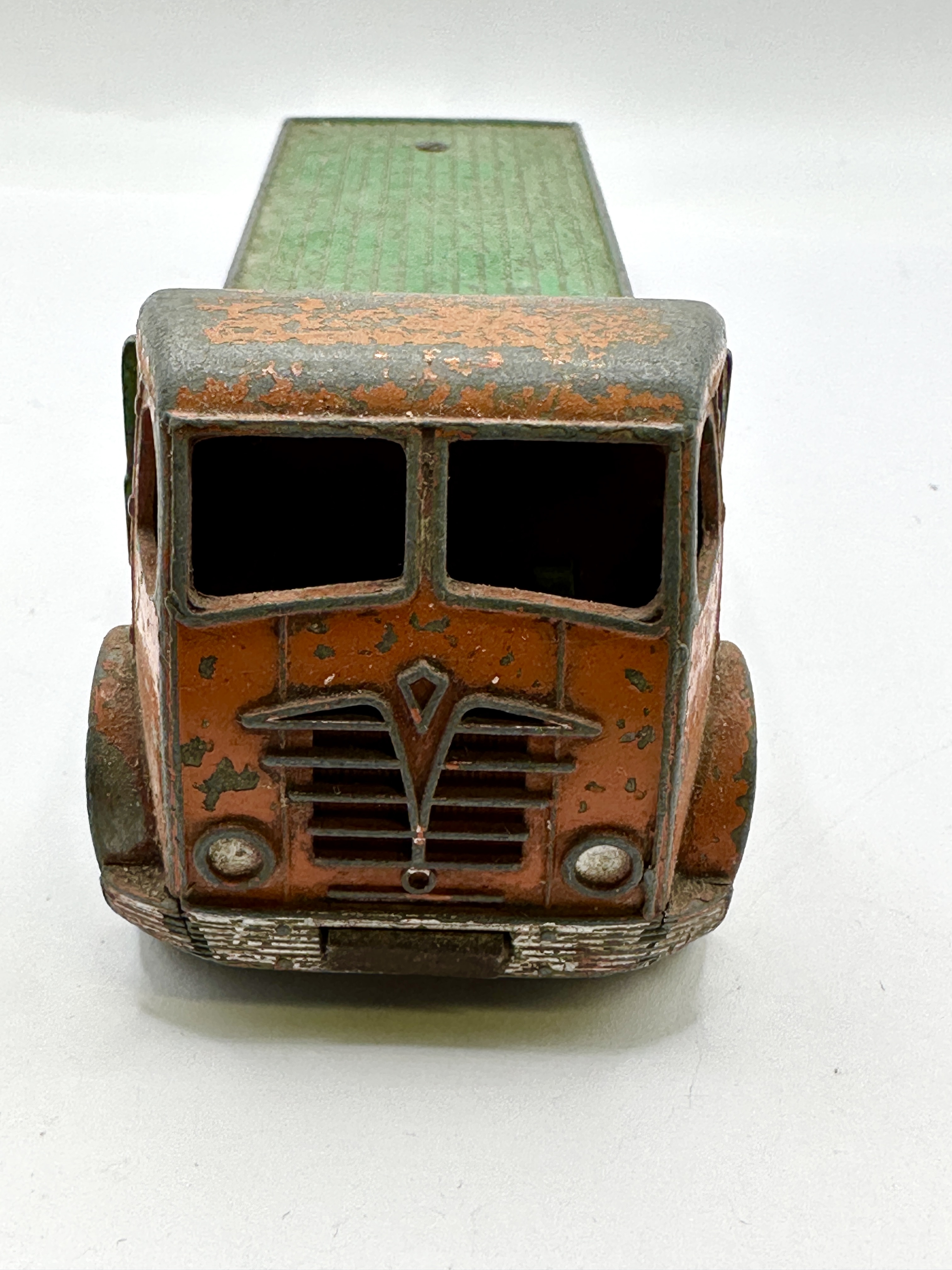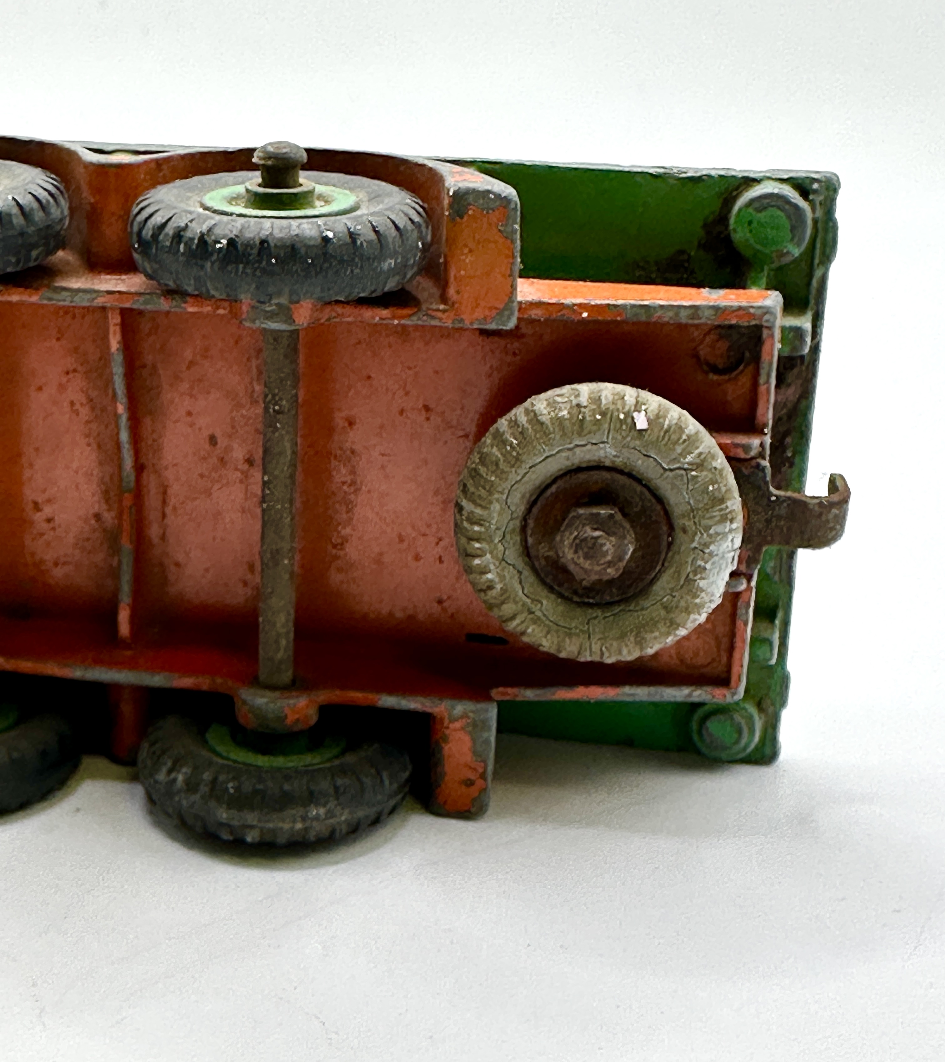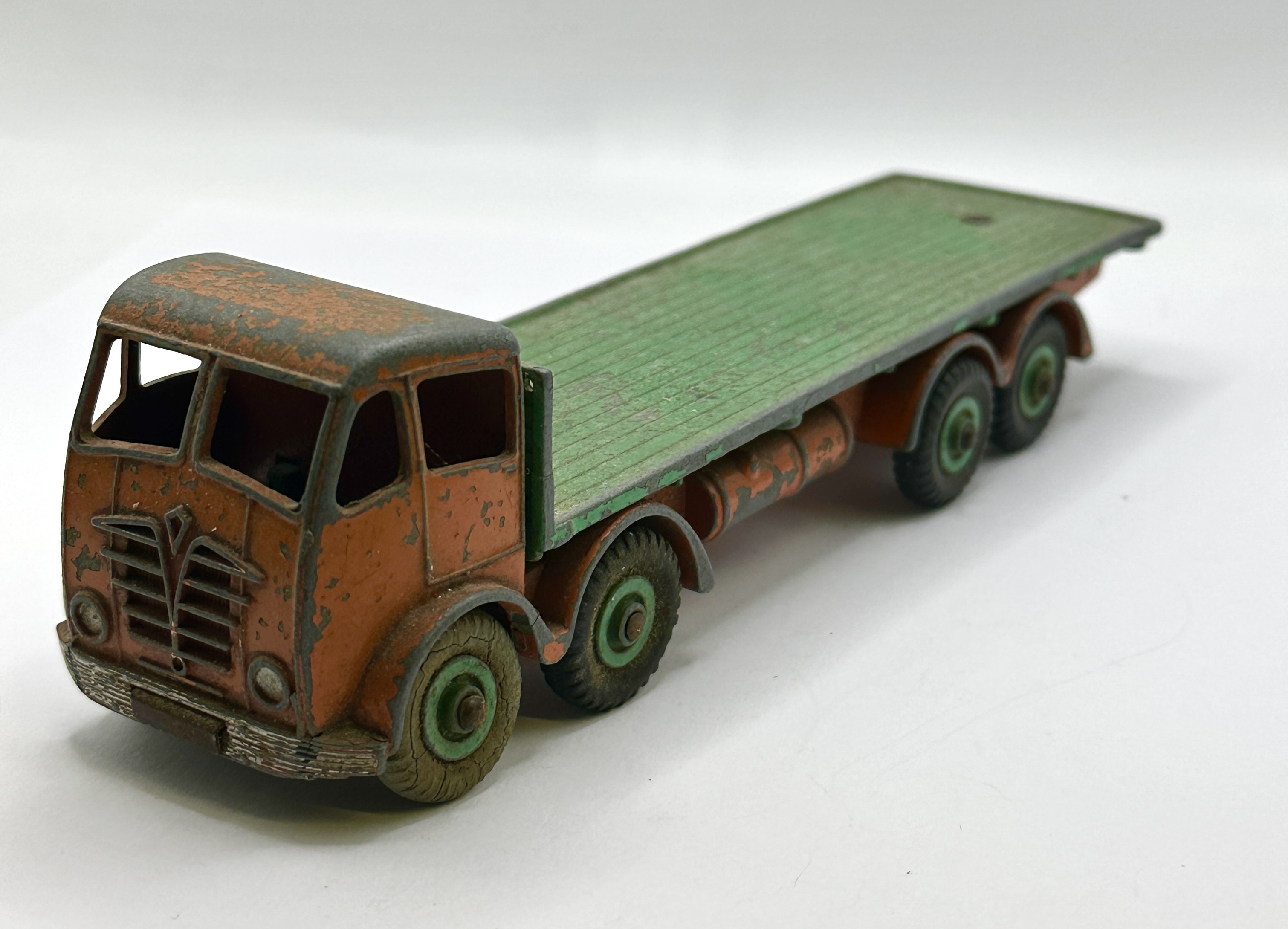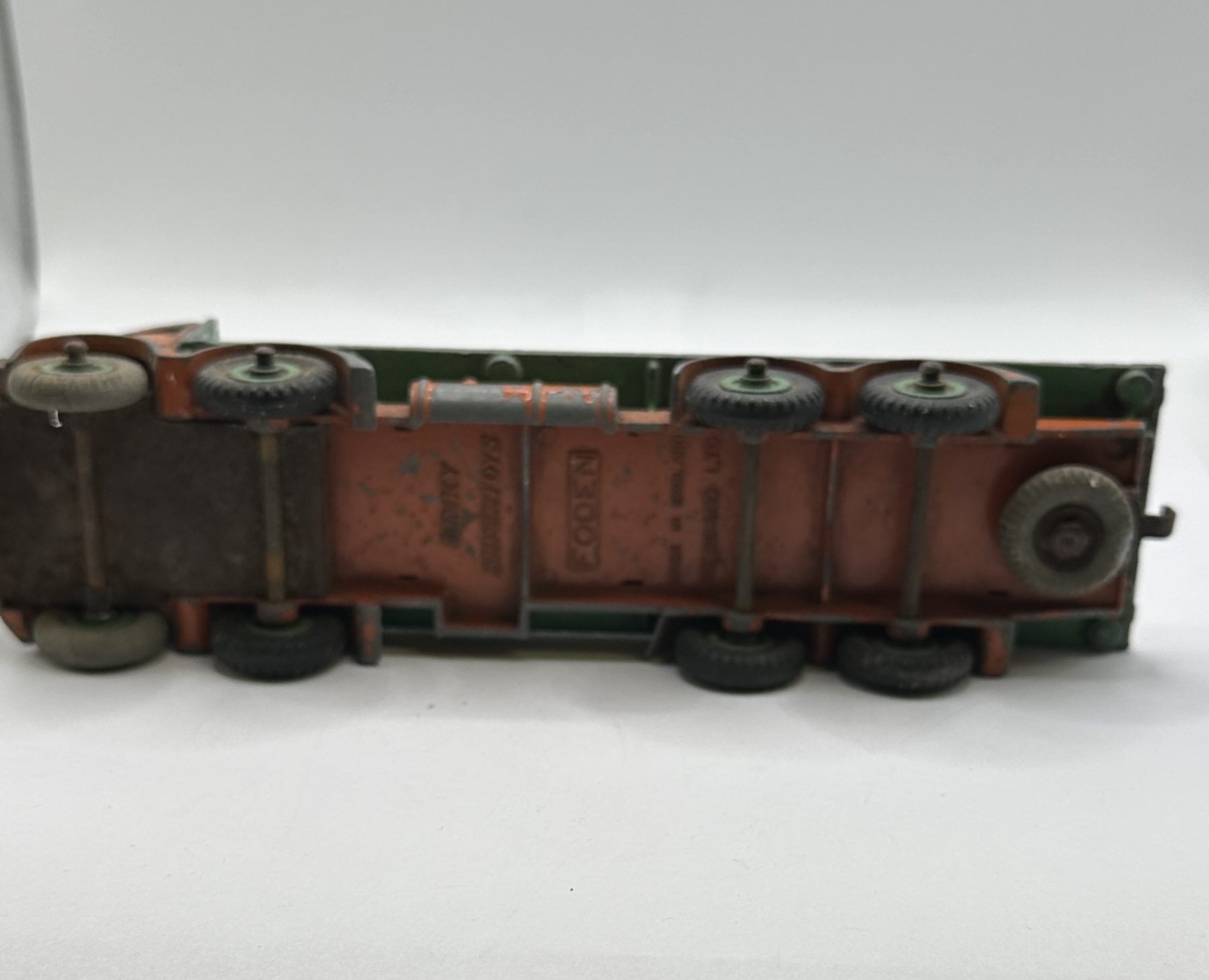 A mid-20th century die-cast model Foden eight-wheel flatbed truck produced by Dinky Supertoys. The model features a first-type cab and chassis finished in orange paint with a contrasting green-painted flatbed. It is equipped with green-painted metal hubs and rubber tyres. The underside of the chassis is embossed with the manufacturer marks Dinky Supertoys, Foden, Made in England, and Meccano Ltd. The construction includes an underslung spare wheel and a tow hook to the rear.