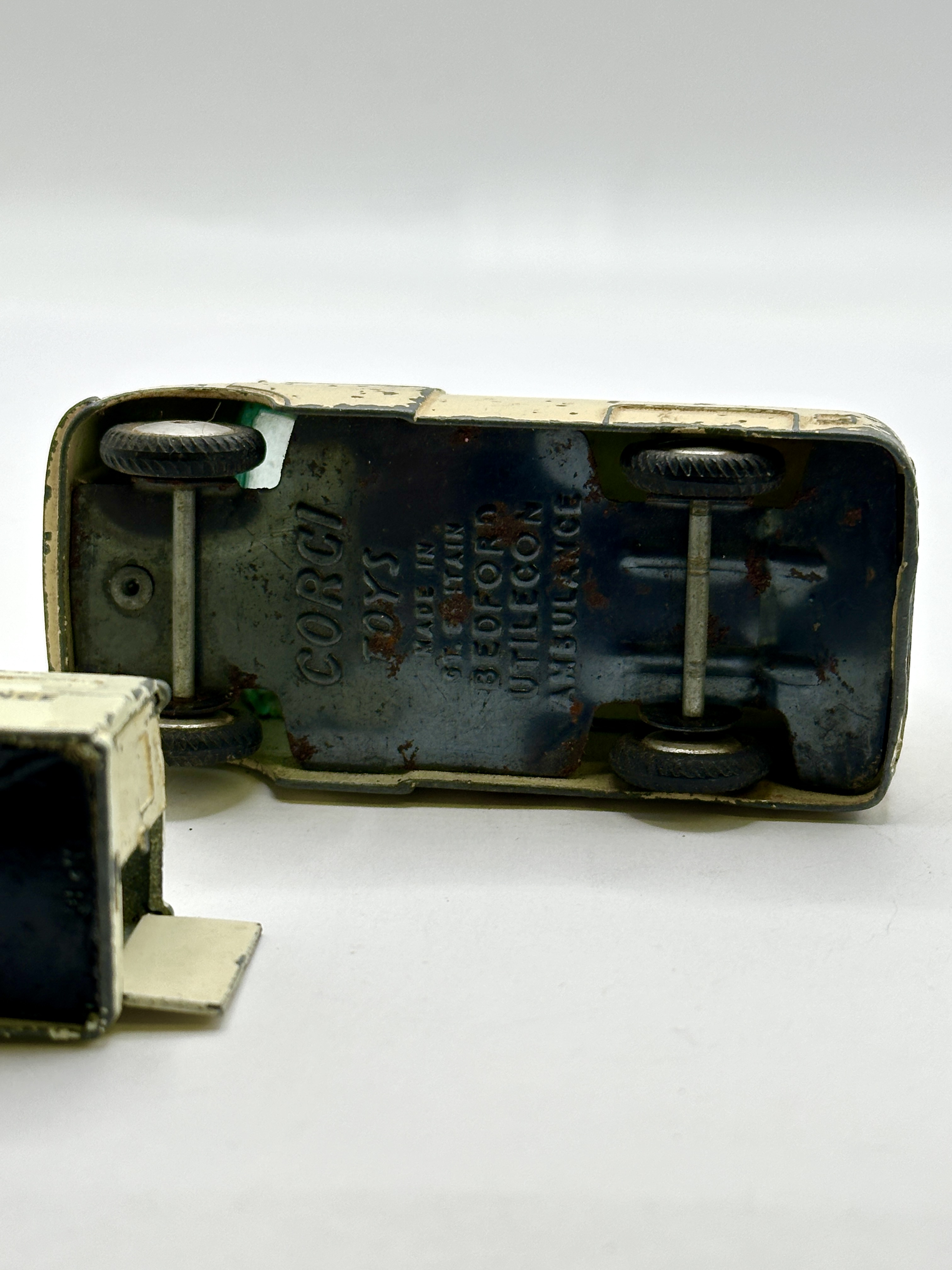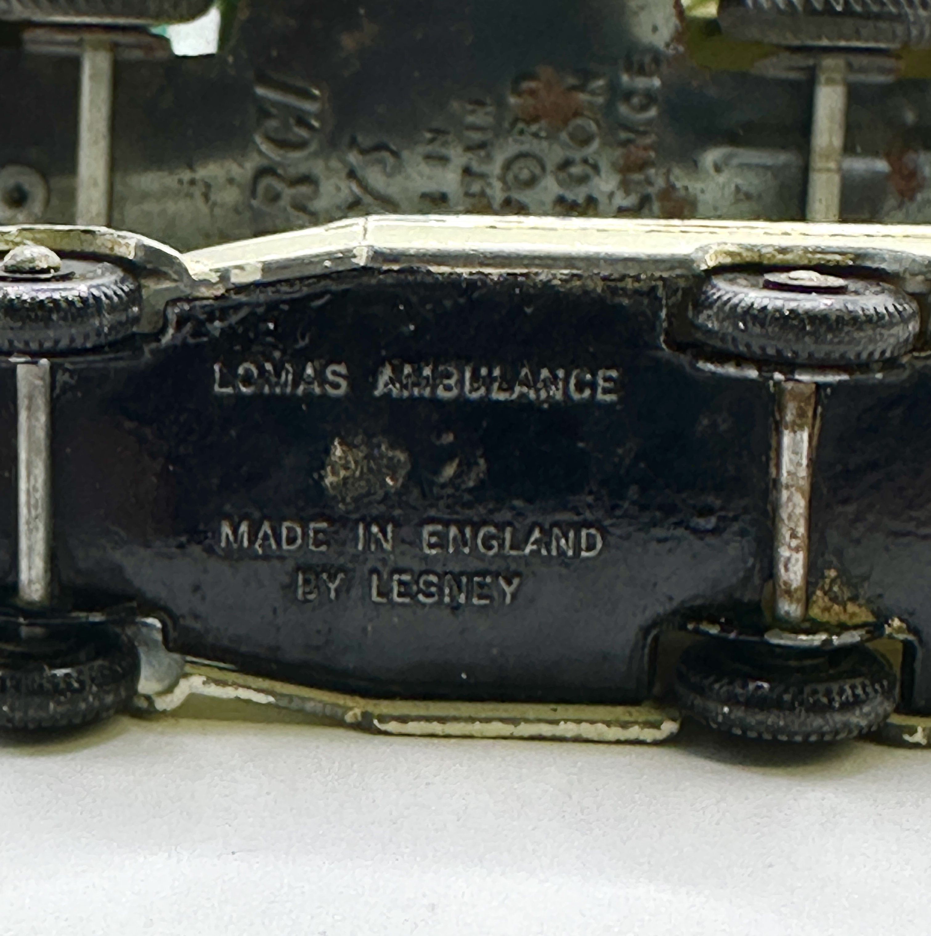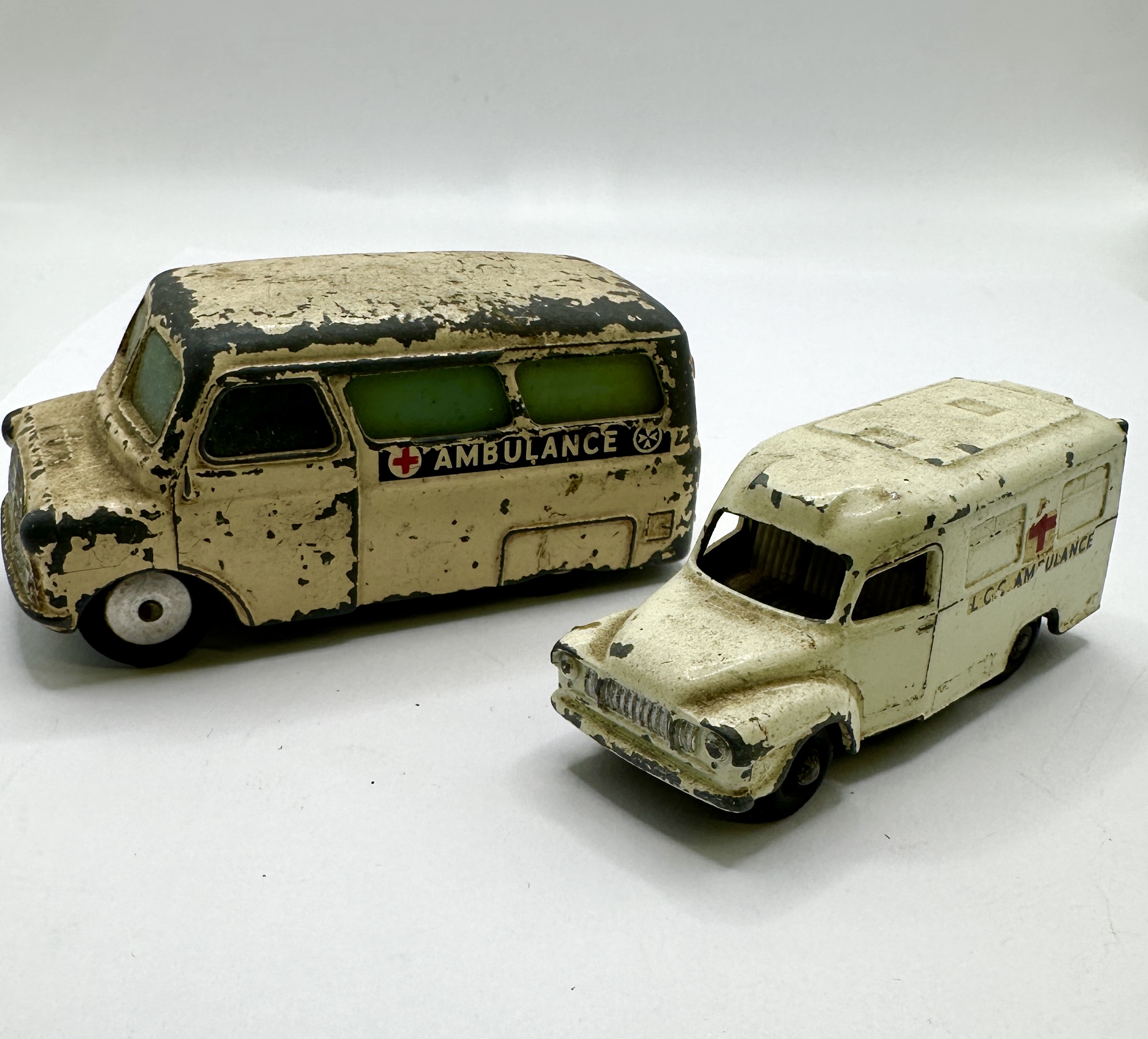 Two die-cast toy ambulances of British manufacture. The larger vehicle is a Corgi Toys Bedford Utilecon Ambulance, finished in cream-coloured paint with green-tinted plastic windows. The baseplate is embossed with the marks CORGI TOYS MADE IN GT. BRITAIN BEDFORD UTILECÓN AMBULANCE. The smaller vehicle is a Lesney Lomas Ambulance, also finished in cream-coloured paint. The baseplate is embossed with the marks LOMAS AMBULANCE MADE IN ENGLAND BY LESNEY. Both vehicles feature red cross and AMBULANCE decals to the side panels and are constructed with die-cast metal bodies, metal baseplates, and black tyres.