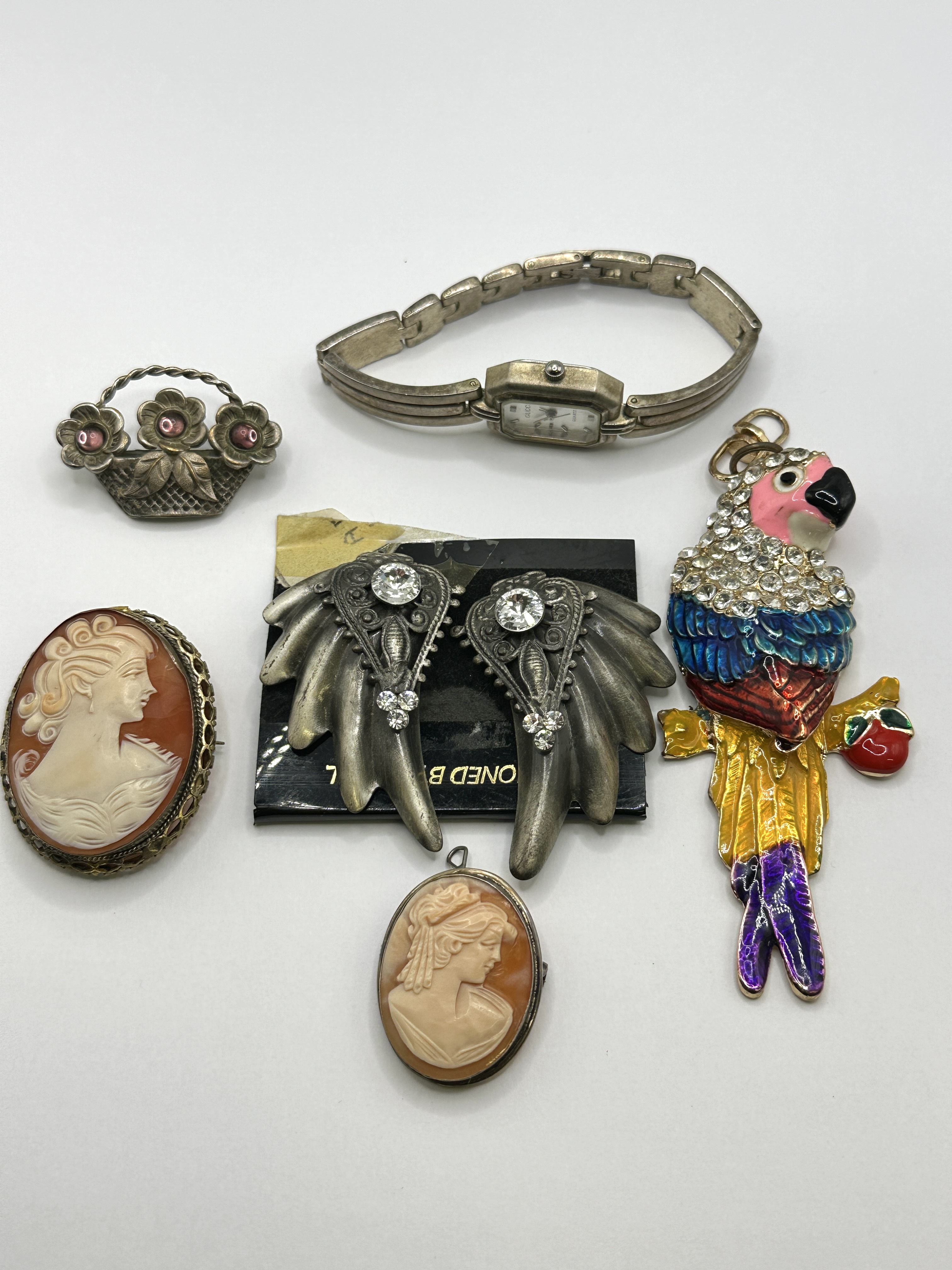 The items exhibit various degrees of surface wear, tarnish, and oxidation consistent with age and use. The wristwatch is untested. The enamel on the parrot brooch appears largely intact. The earring display card shows significant wear and tearing.