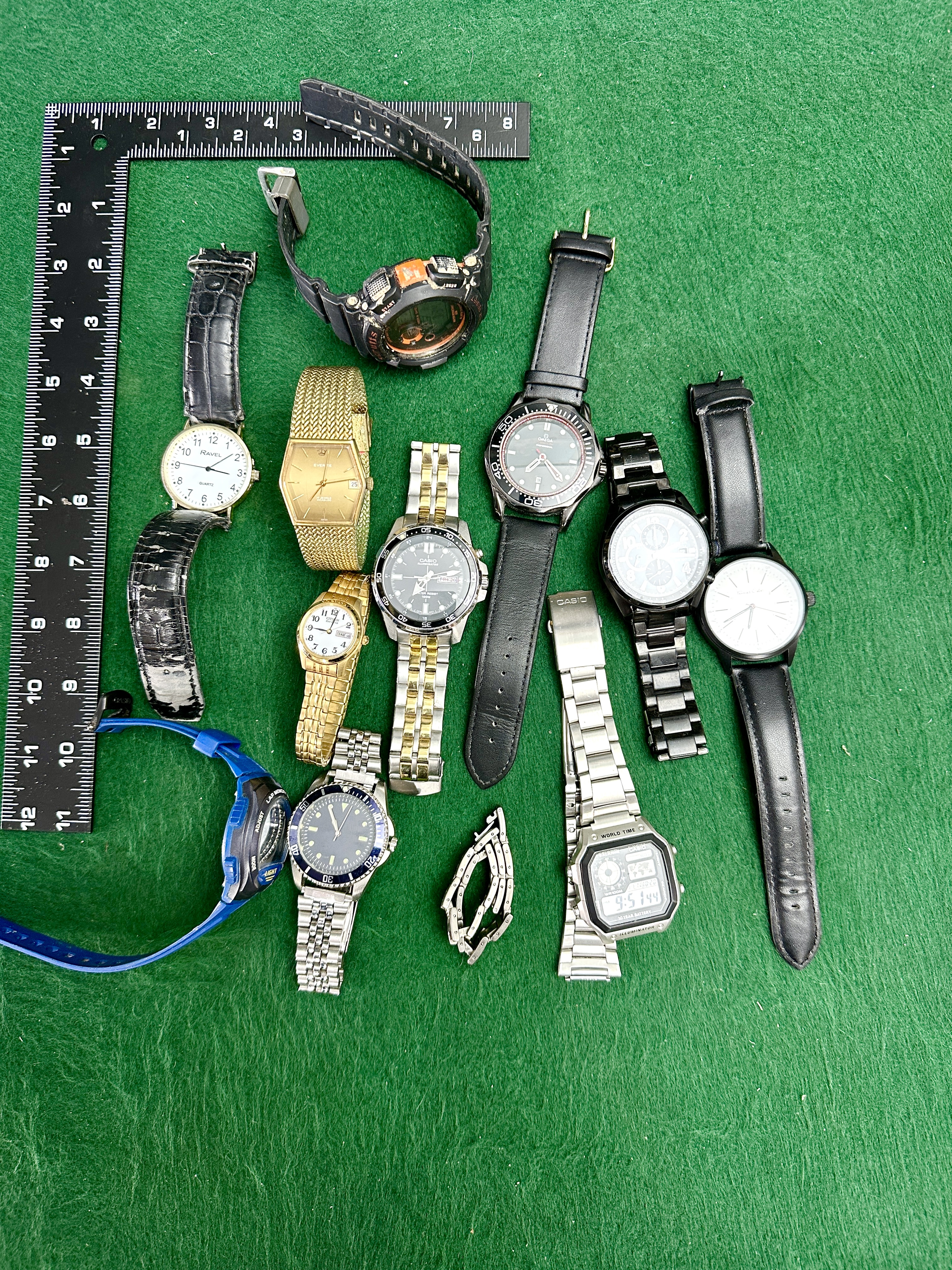 The collection shows visible signs of wear and age throughout. Significant cracking and peeling are present on the leather and synthetic straps. One metal watch bracelet is detached from its case. All items are untested for functionality and are sold as a lot for parts or restoration.