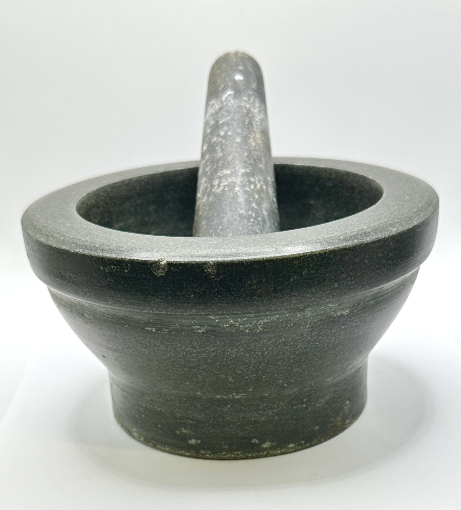 The mortar shows small chips to the outer edge of the rim. The pestle exhibits surface residue and pitting consistent with previous use.